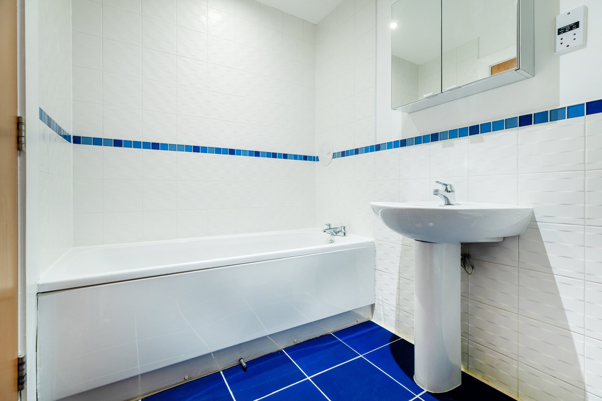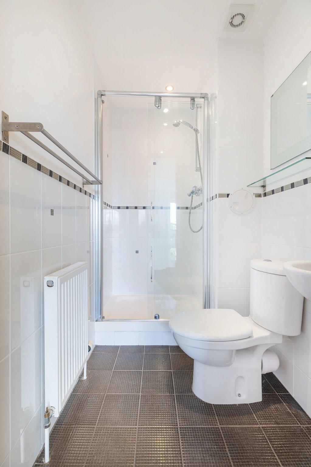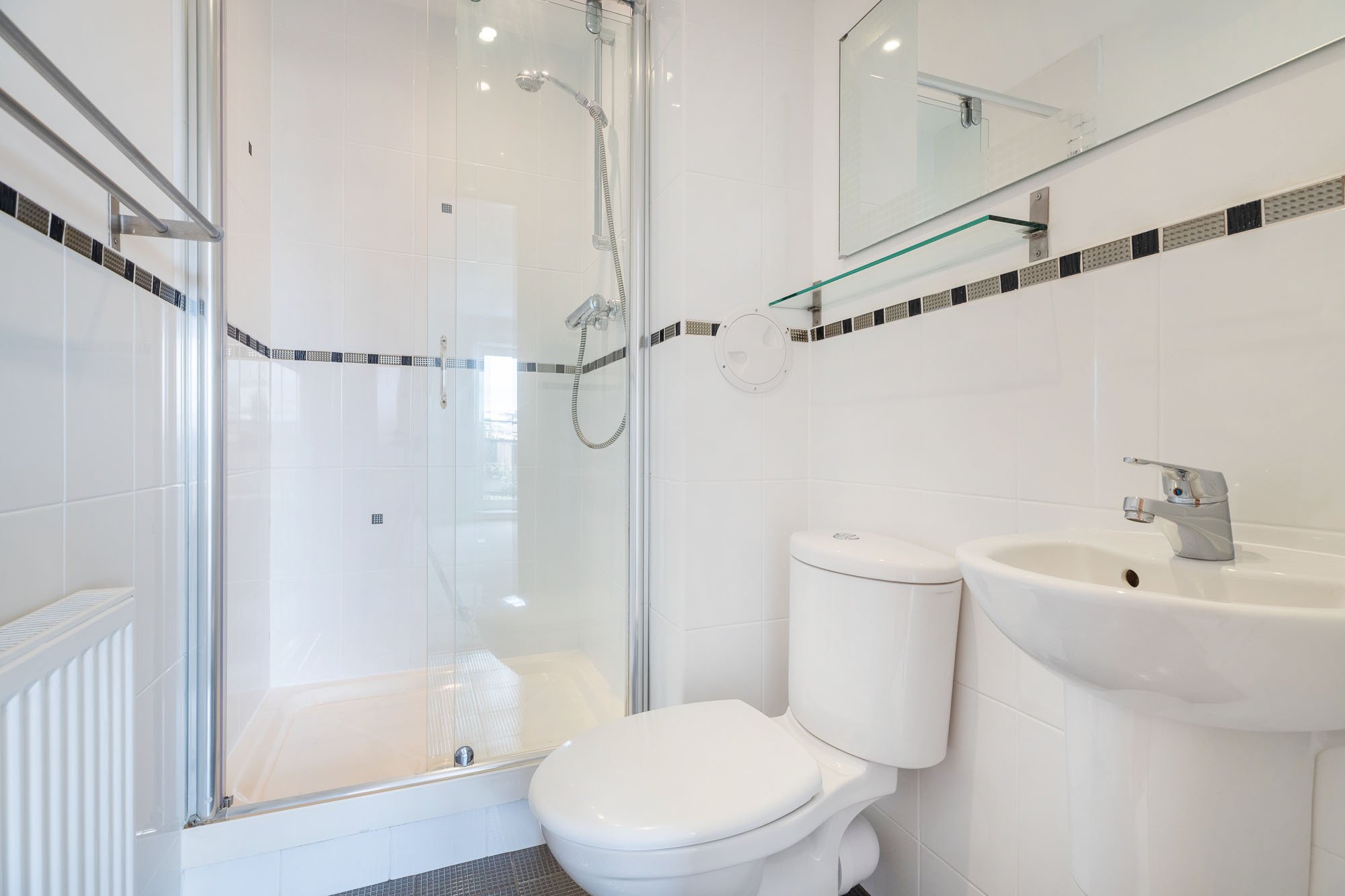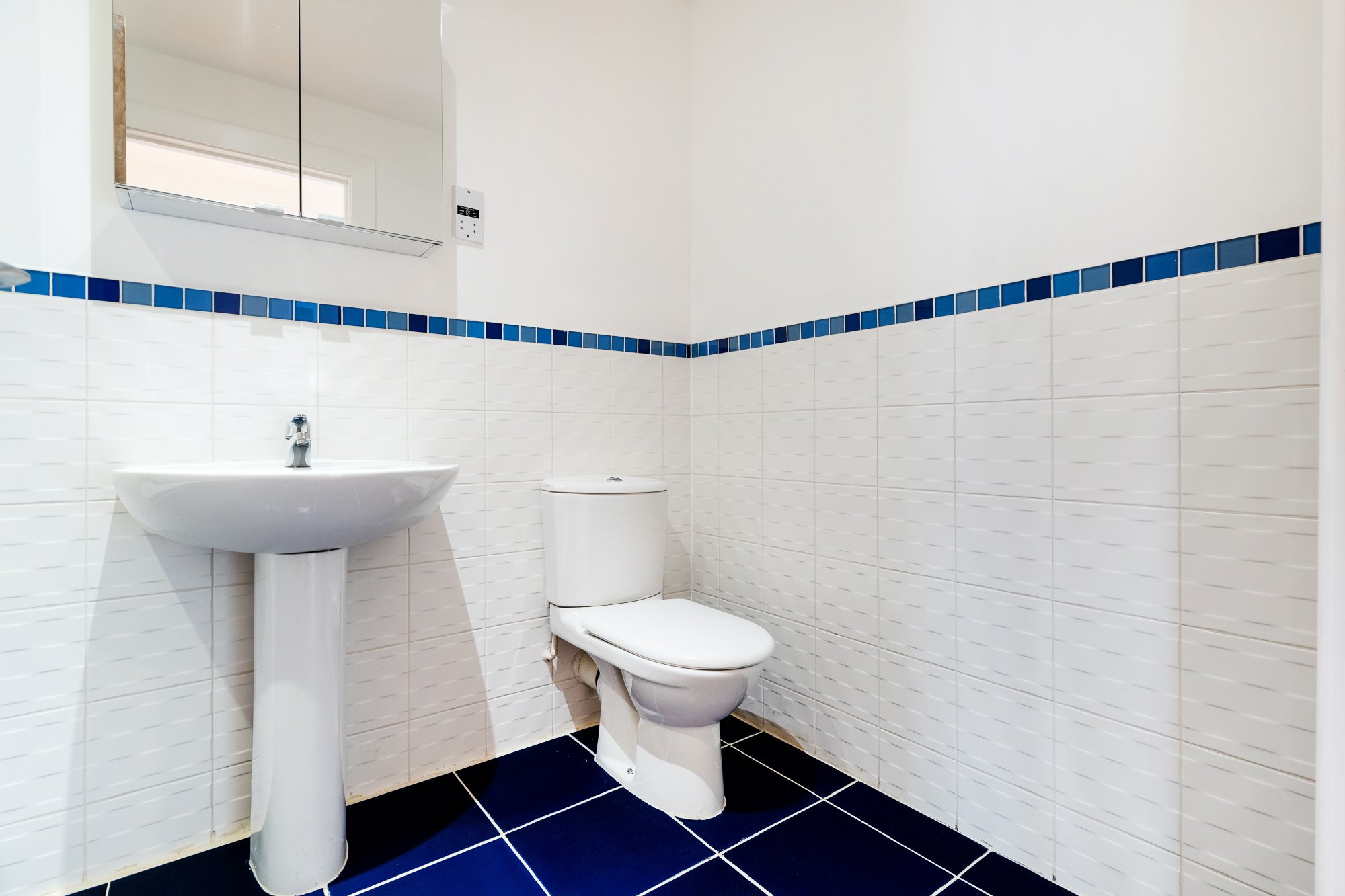 - Main three-piece bathroom comprising bath, toilet and wash hand basin.