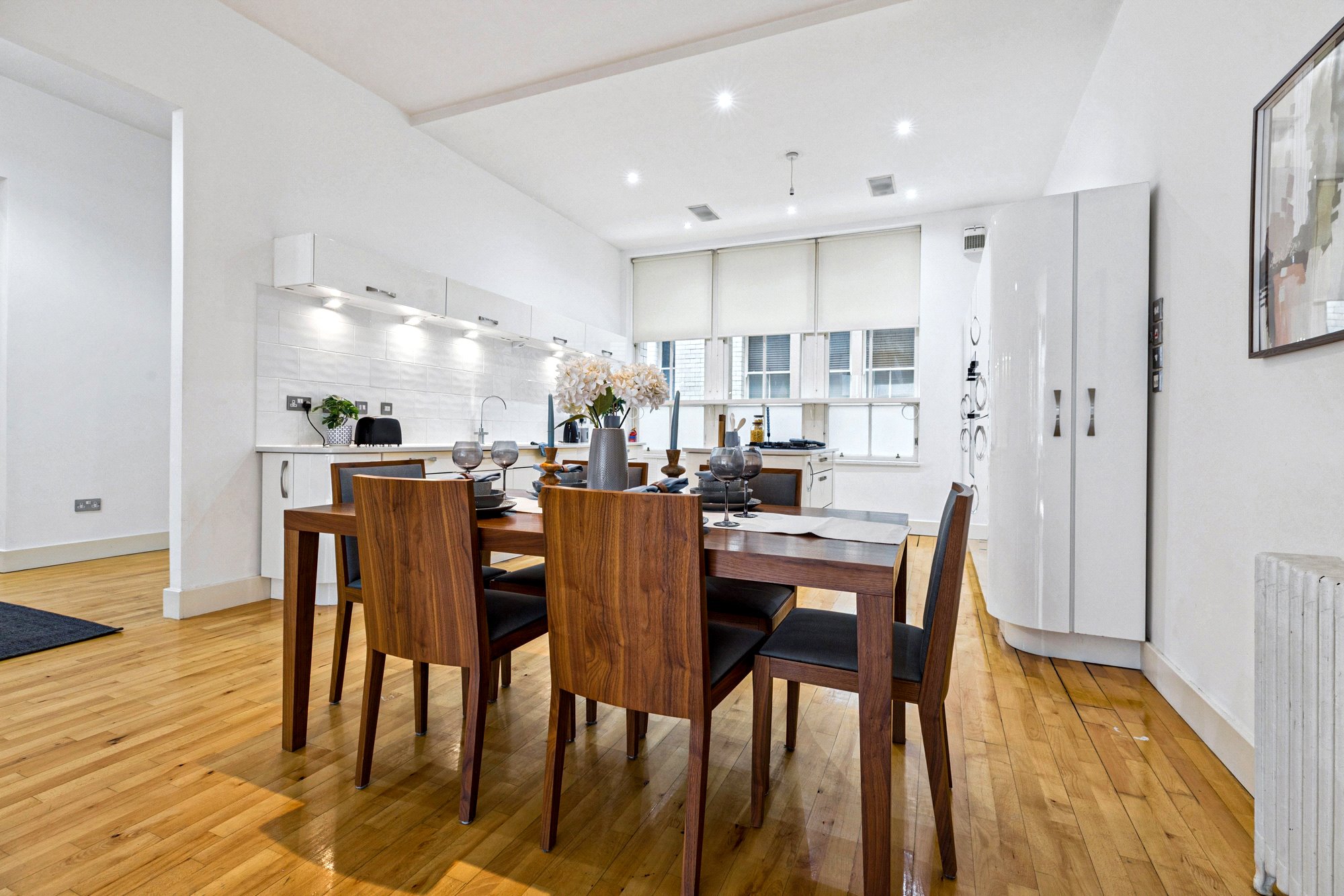 Spanning over 2000 square feet, the apartment boasts an adaptable layout filled with natural light from large sash and case windows. The freshly presented interior features real wood flooring throughout the main rooms. Accessible via secure entry with both lift and stair options, the property opens to a welcoming reception hall leading to four main rooms. Highlights include an expansive living room with a three-section bay window and open-plan dining area, a beautifully re-fitted kitchen extending over 47 feet, and a spacious principal bedroom suite with a generous dressing area and luxurious en suite bathroom. Two additional bedrooms, a stylish five-piece main bathroom with a walk-in shower, and gas central heating further enhance this remarkable home.