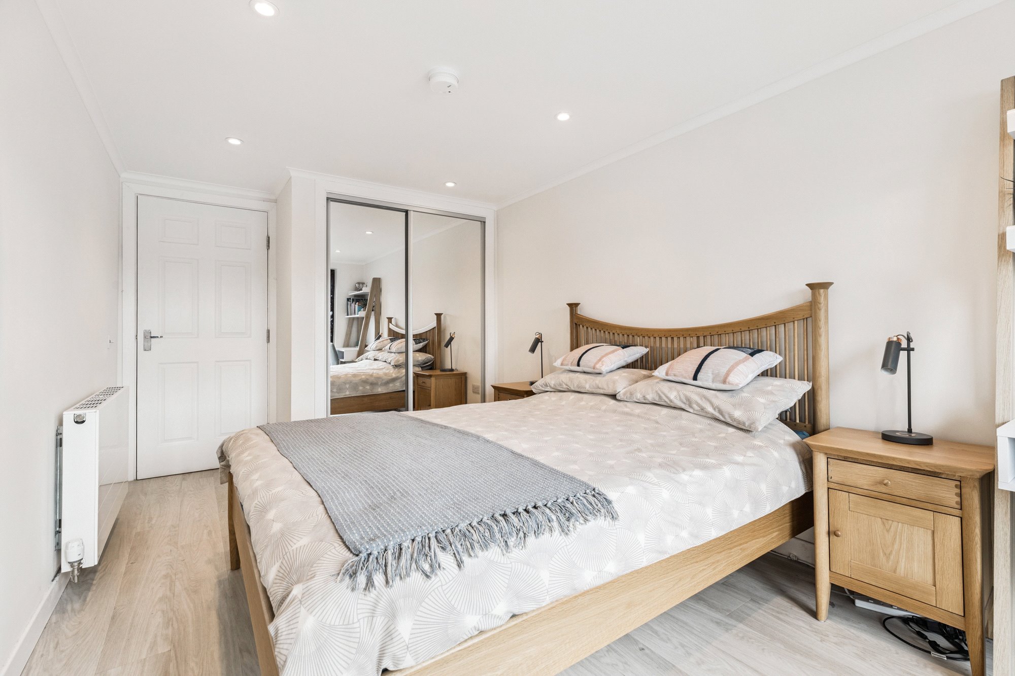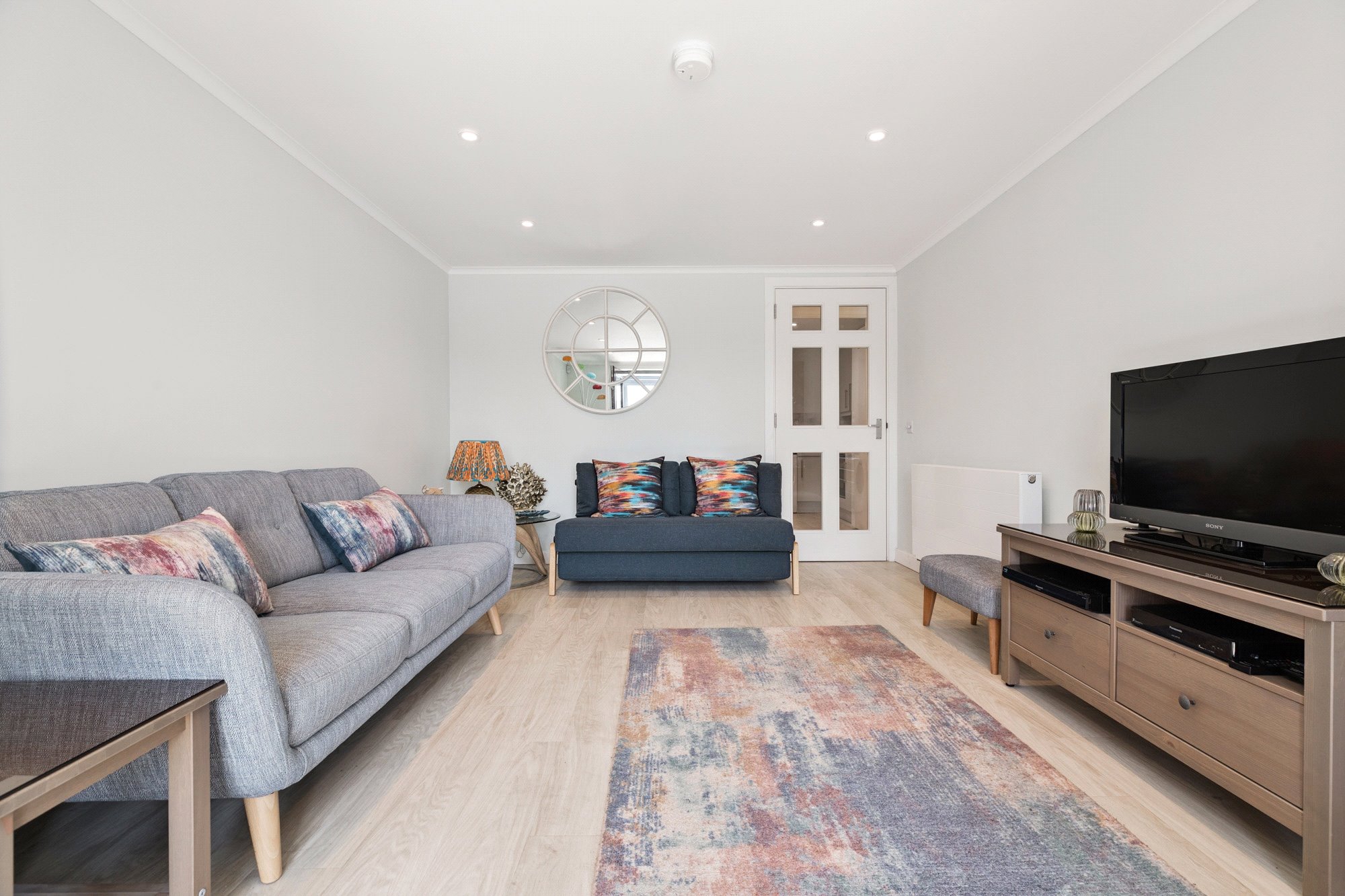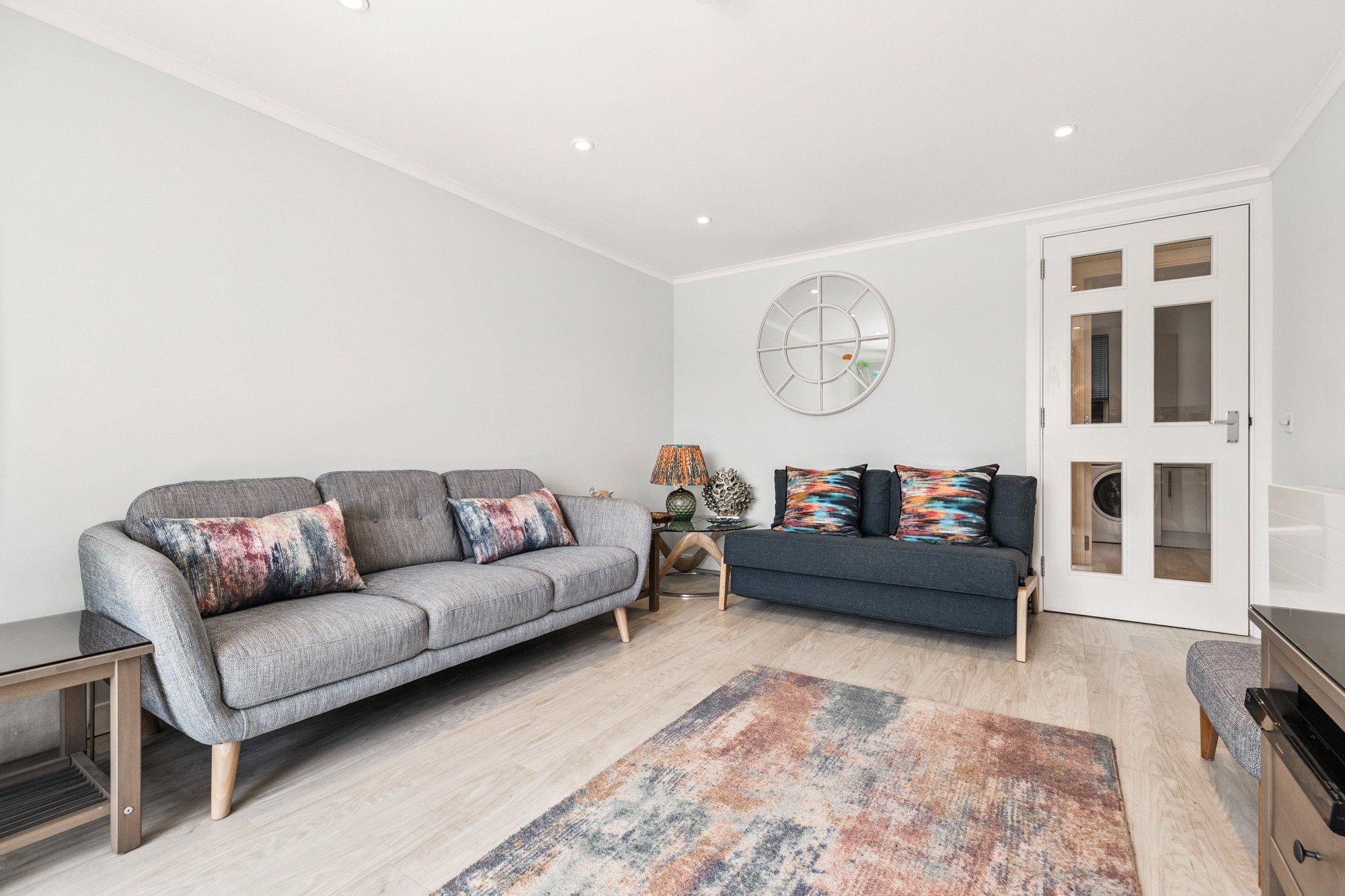 Entered via security entry door to communal entrance with stair access to each secure floor, the apartment boasts outstanding south-facing views across the river and is immaculately presented with bright, well-proportioned living space. The accommodation extends to welcoming L-shaped reception hall with two storage cupboards off; generous main living room with patio doors into a south facing conservatory sun room offering ample space for dining and with door to private balcony; double bedroom with fitted wardrobes; three piece bathroom with white suite, over bath shower and wall and floor tiling; modern kitchen complete with a range of base and wall units with a mix of integrated appliances, and tiled flooring. The property has gas central heating (replaced boiler), double glazing and an allocated parking space in the building’s residents’ car park.