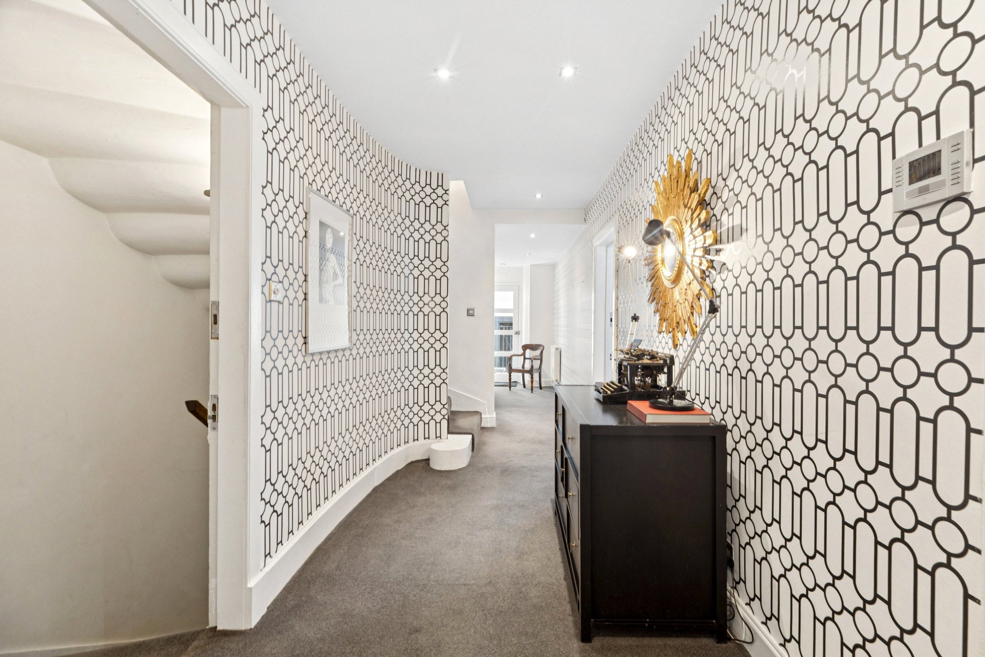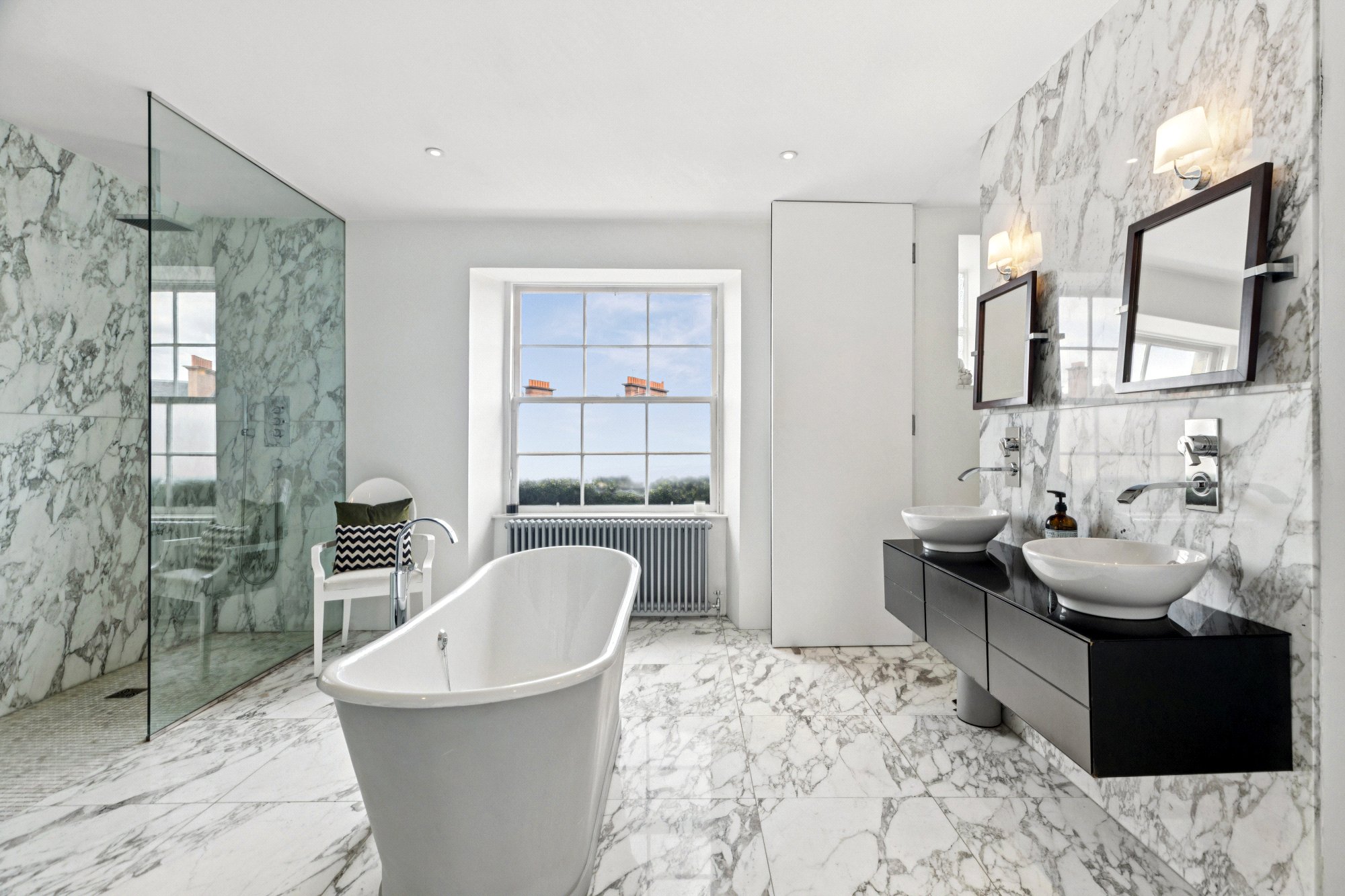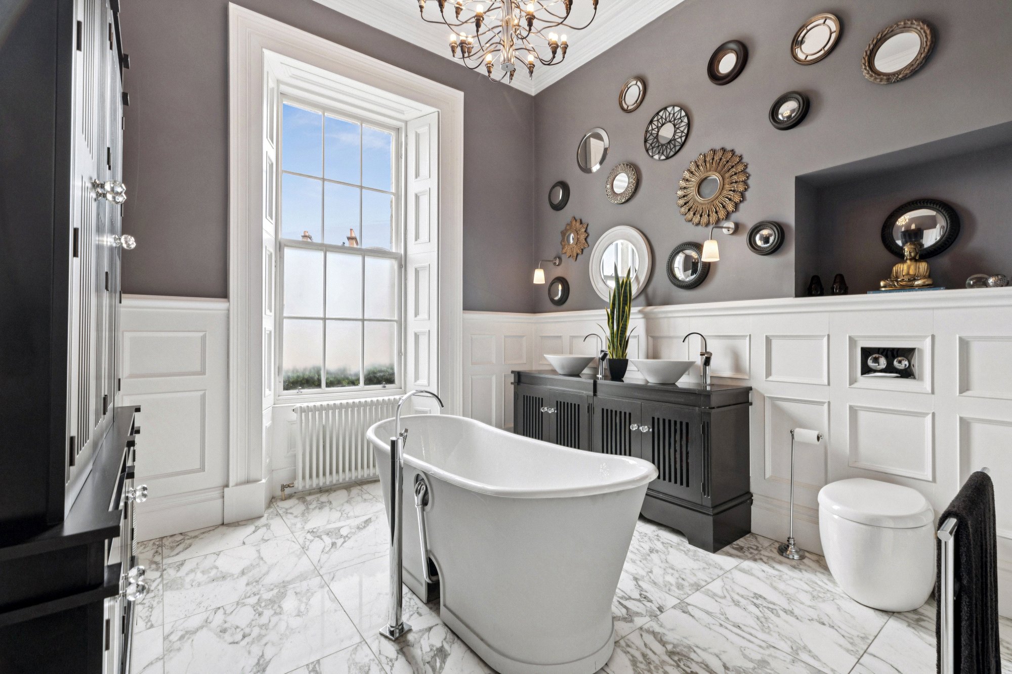 Across the upper floors are flexible accommodation offering five-six generous double bedrooms, including a showstopping principal suite. This luxurious space is complete with a designer en suite bathroom featuring a central freestanding bath, walk-in shower, and direct access to the roof terrace, offering far-reaching views south and west and a private hot tub. A contemporary family bathroom and two separate WCs service the upper levels, while the lower ground floor offers outstanding flexibility. Here, you'll find an additional living/kitchen area, bedroom six, a shower room, all with rear access to the garden, this level offers the potential to function as a self-contained apartment suitable for use as a guest suite or an income generating short-let accommodation.