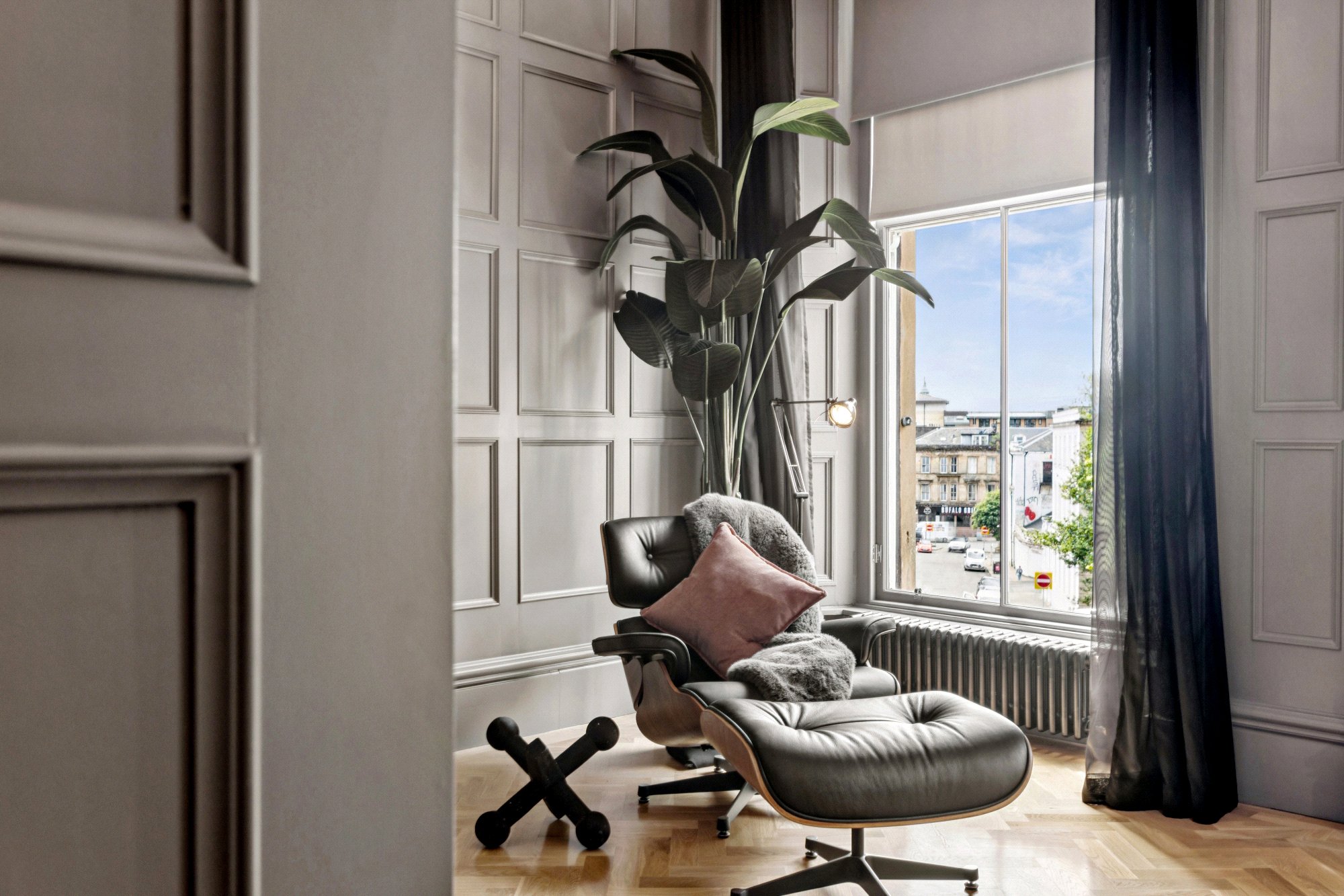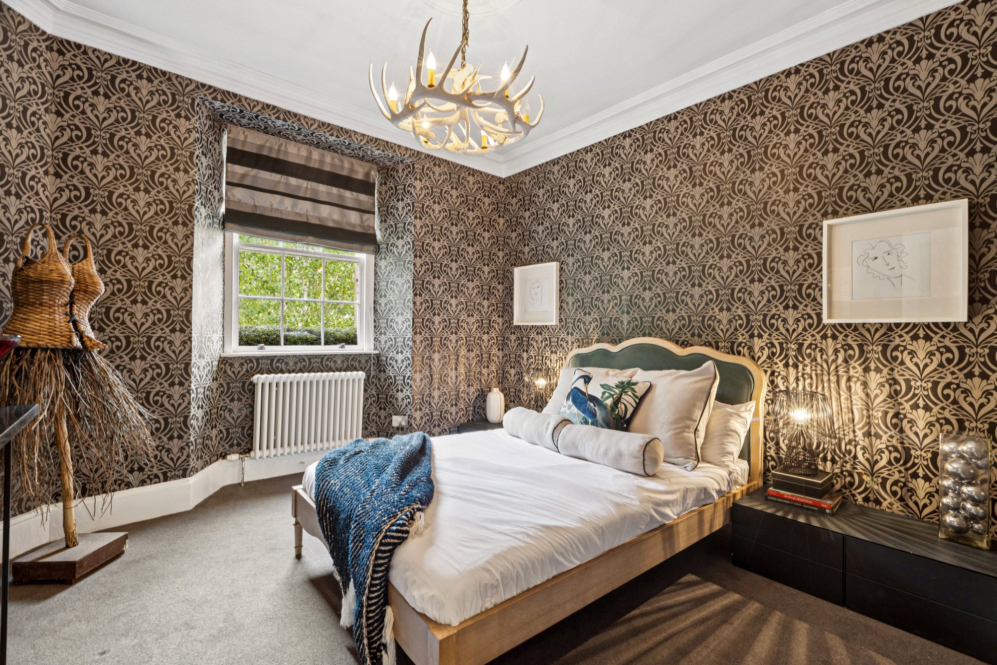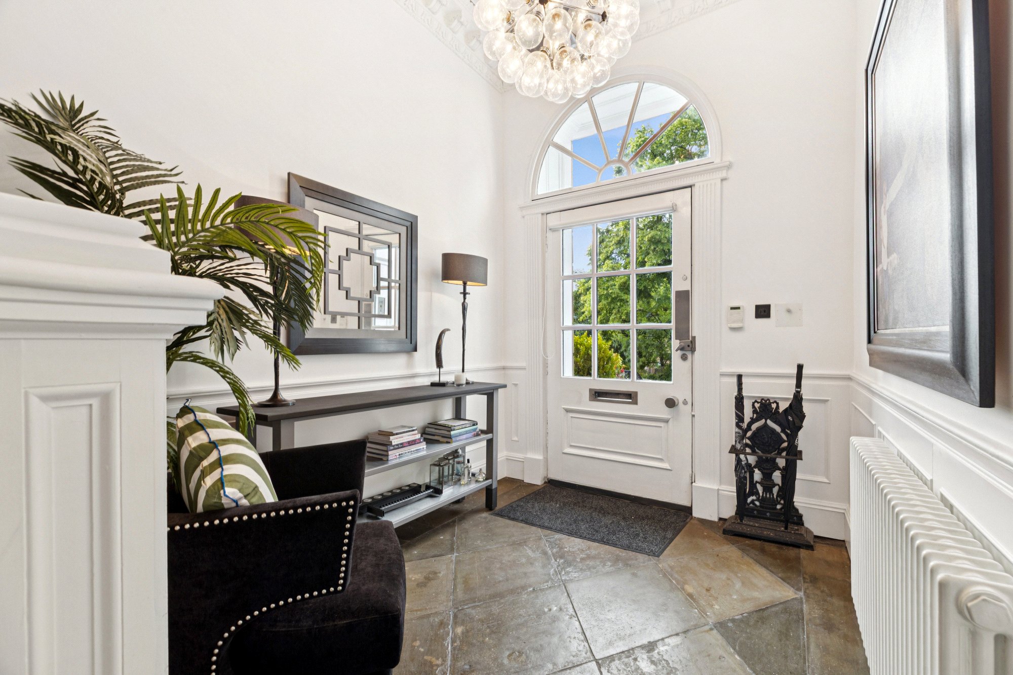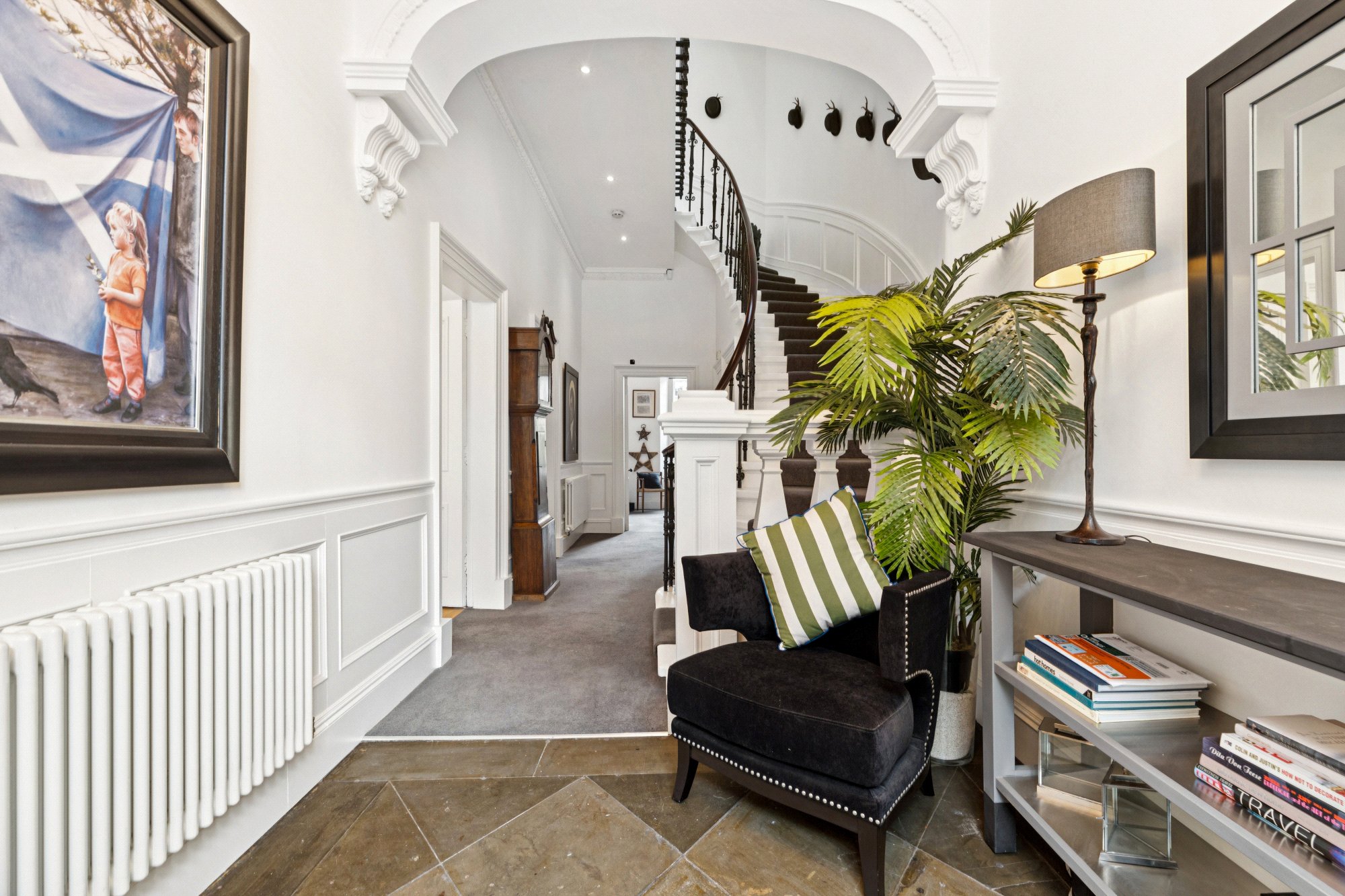 The beautifully proportioned accommodation begins with a welcoming reception hallway, setting the tone for the space and elegance that follows. The main living level is elevated ground floor and hosts a magnificent drawing room, an elegant living room, both featuring striking period fireplaces and ornate cornicing, a study/bedroom five, W.C. and stairs leading to all floors. On lower ground lever, to the rear, the heart of the home lies in the impressive semi open-plan family kitchen and dining area. The kitchen is sleek and modern, centred around a substantial island and equipped with premium Miele appliances, perfect for both everyday living and entertaining.