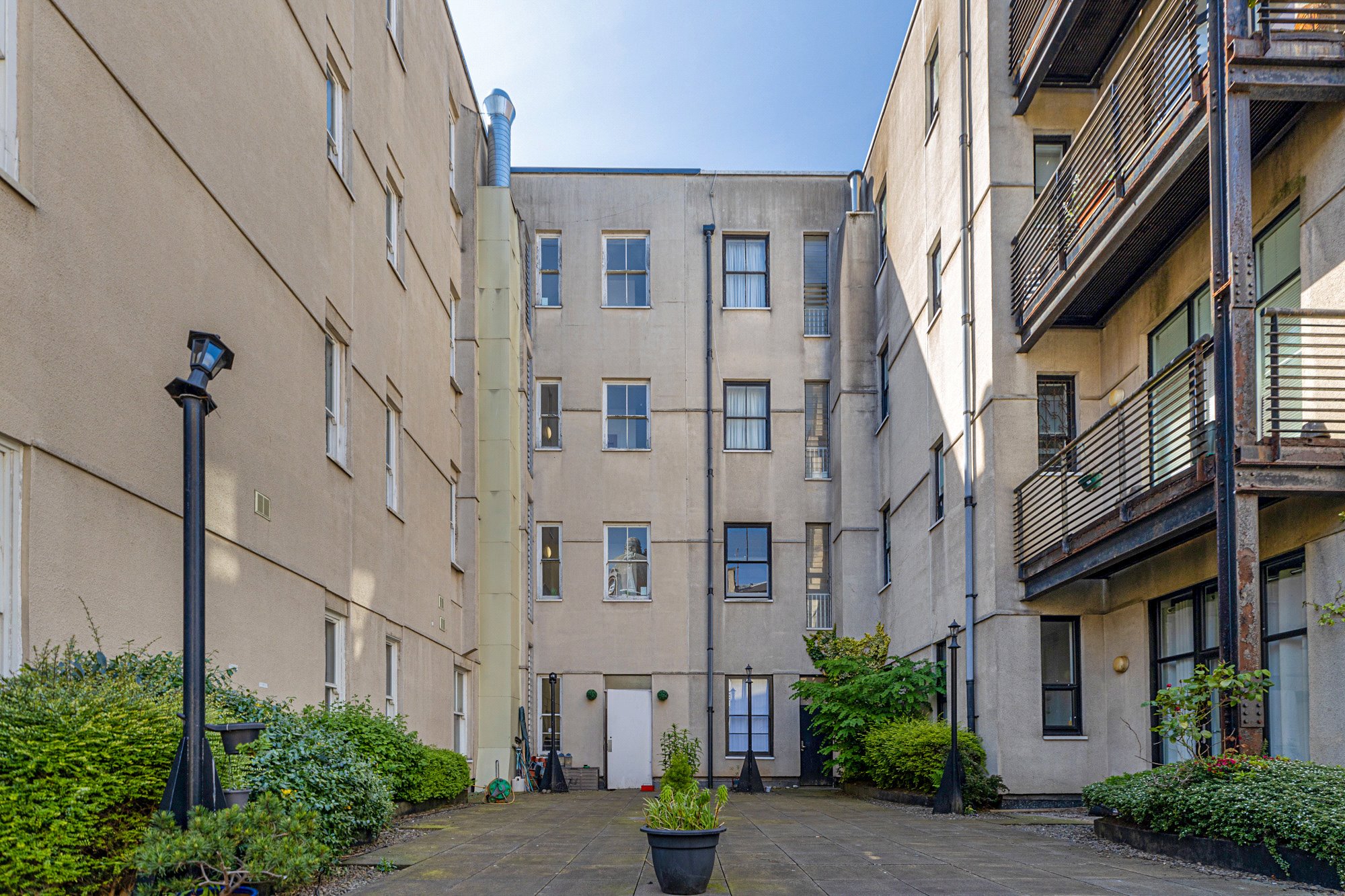 Entered via a security entry system and a communal entrance with both lift and stair access to each floor, and to the rear communal courtyard. A welcoming reception hall includes two storage cupboards and leads into an impressive open plan living and dining room which has a beautifully re-fitted open plan kitchen featuring a range of base and wall units, integrated appliances, and a stylish kitchen peninsula for dining. Bedroom one offers fitted wardrobes, a carpeted floor, and an en suite shower room, bedroom two also includes fitted wardrobes and carpeted floor. The main bathroom is fitted with a four-piece suite comprising shower cubicle, bath, toilet, and wash hand basin. Additional features include electric heating, tall sash style windows and a beautifully maintained residents’ courtyard.