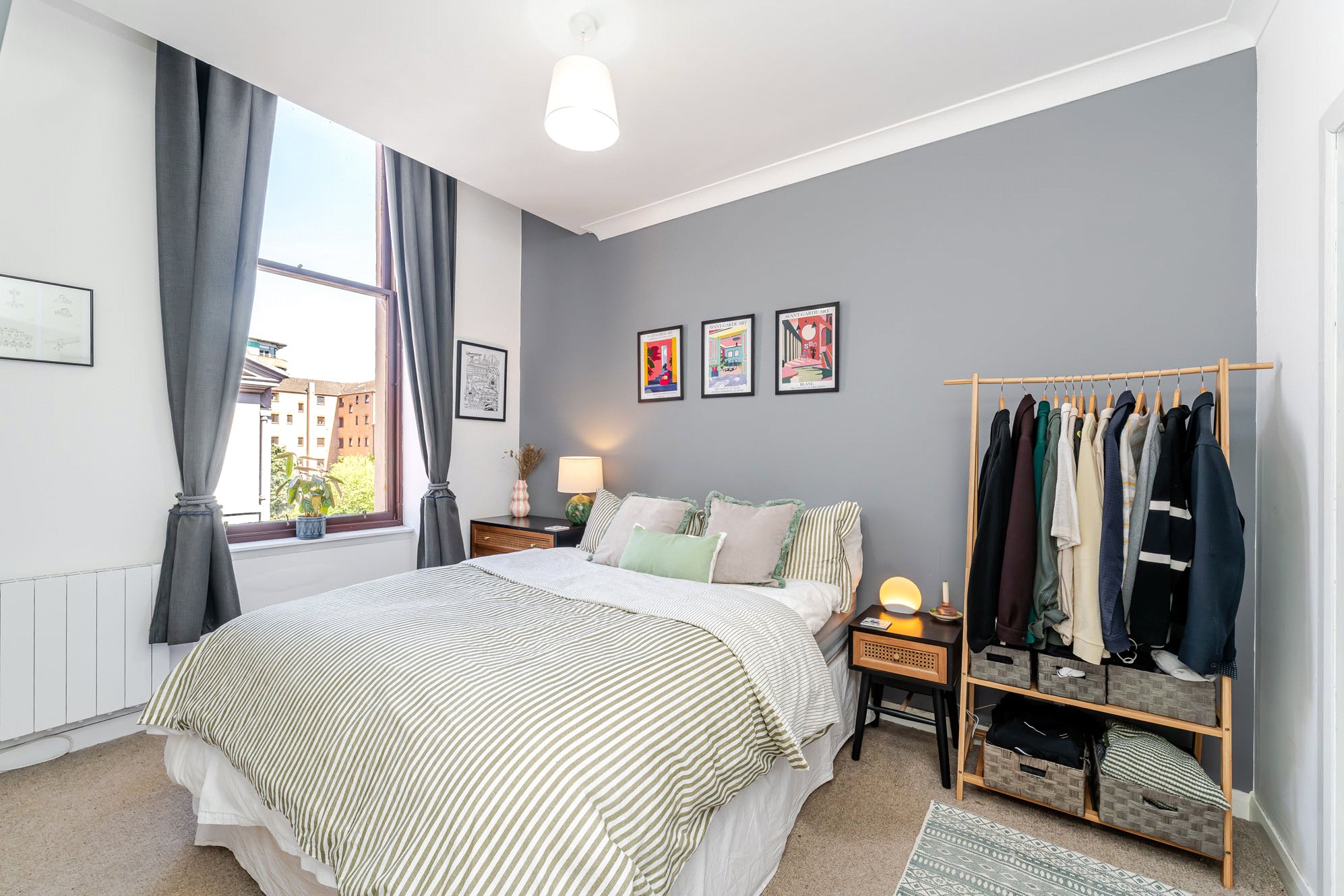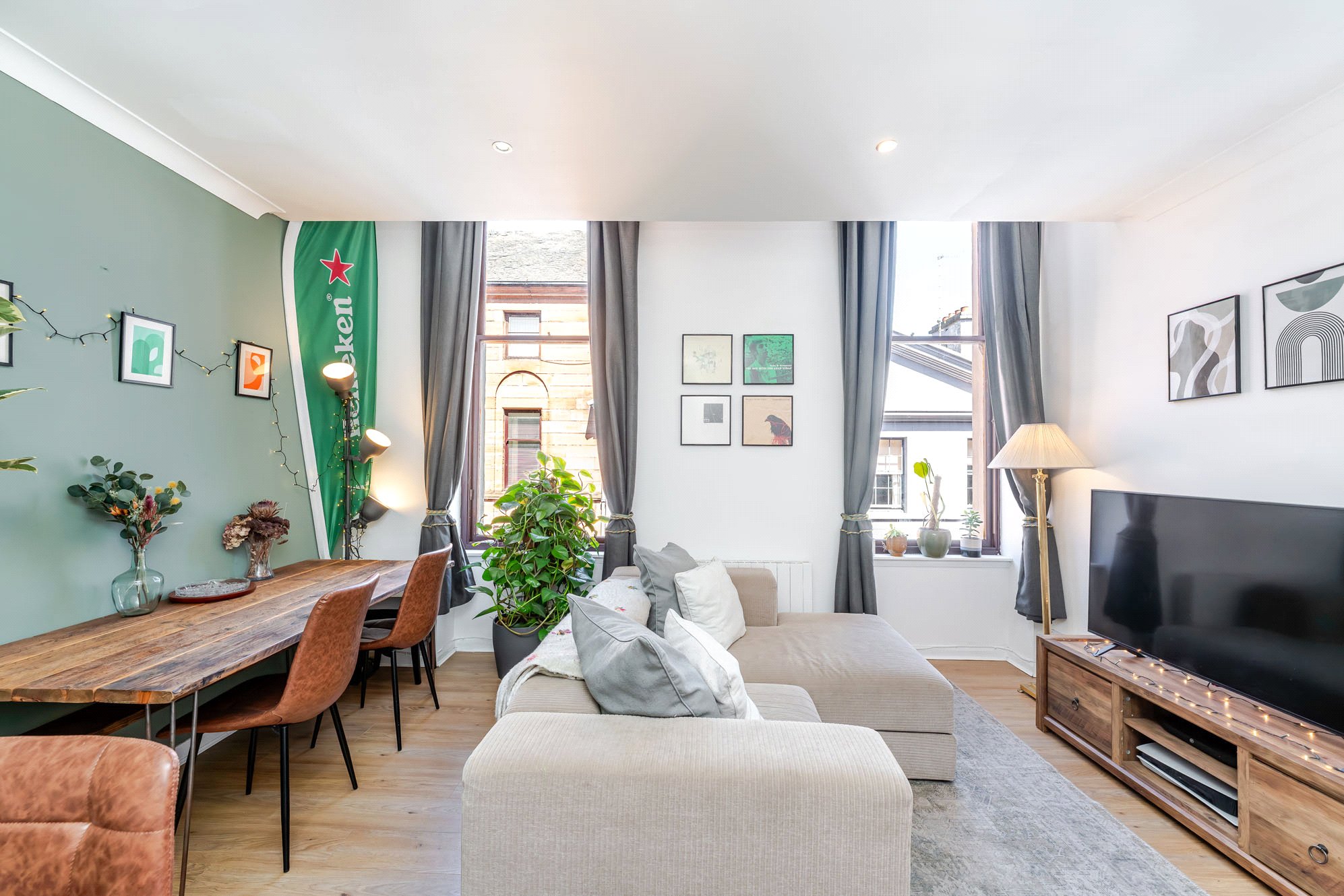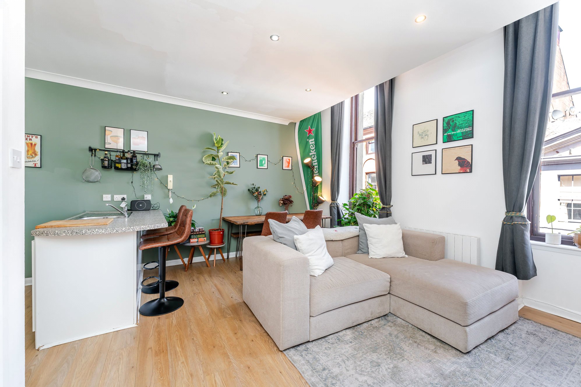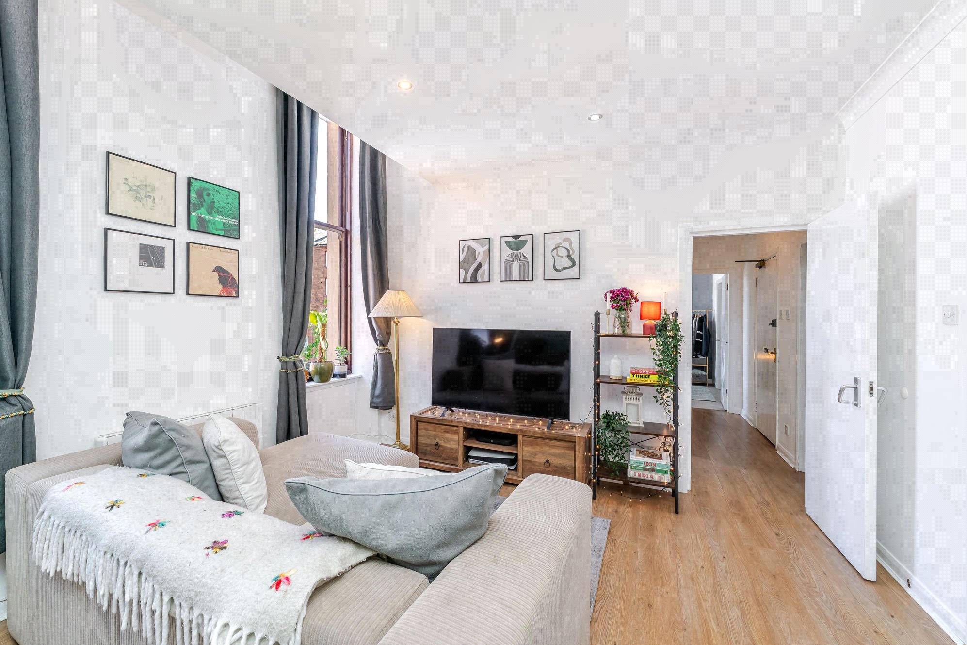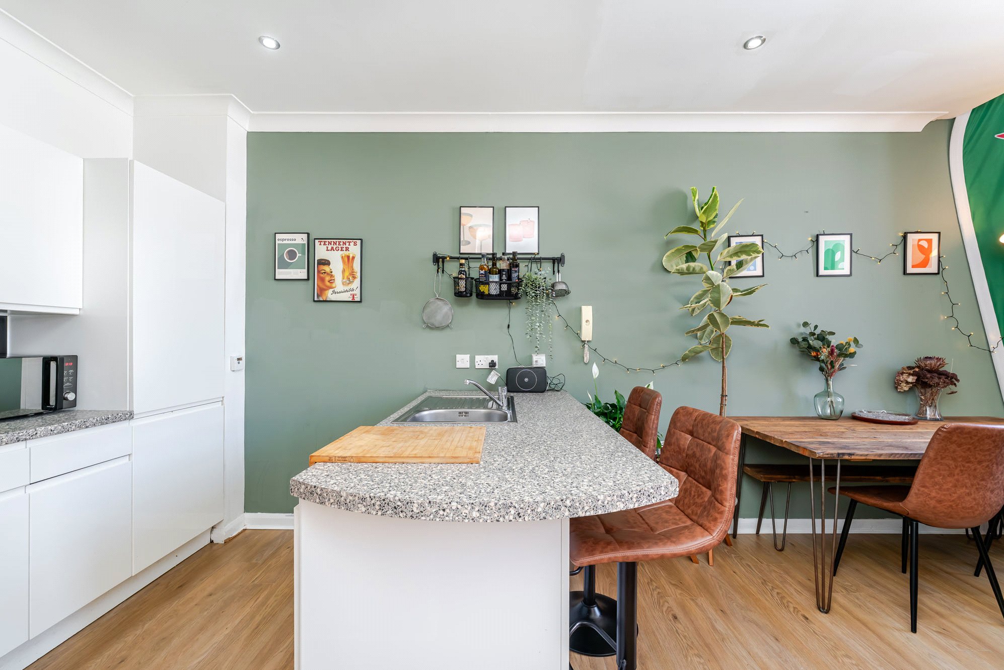 Entered via security entry from street and at each landing, this second floor two-bedroom property benefits from bright and well-presented accommodation, it has been upgraded by the current owners and features notable highlights including a generous living/dining room with a modern kitchen off set with integrated appliances to include dishwasher and a washing machine and separated by a breakfasting peninsula, there are two double bedrooms with the main bedroom having good storage and a there is a bathroom with three-piece suite and over bath shower. The property has electric heating, laminate wood flooring, fresh décor, sash and case style windows. The development hosts a resident’s laundry facility and has the additional bonus of the availability of on-street residents’ permit parking through Glasgow City Council.
