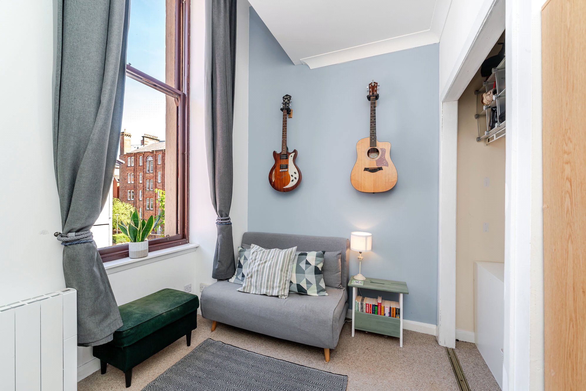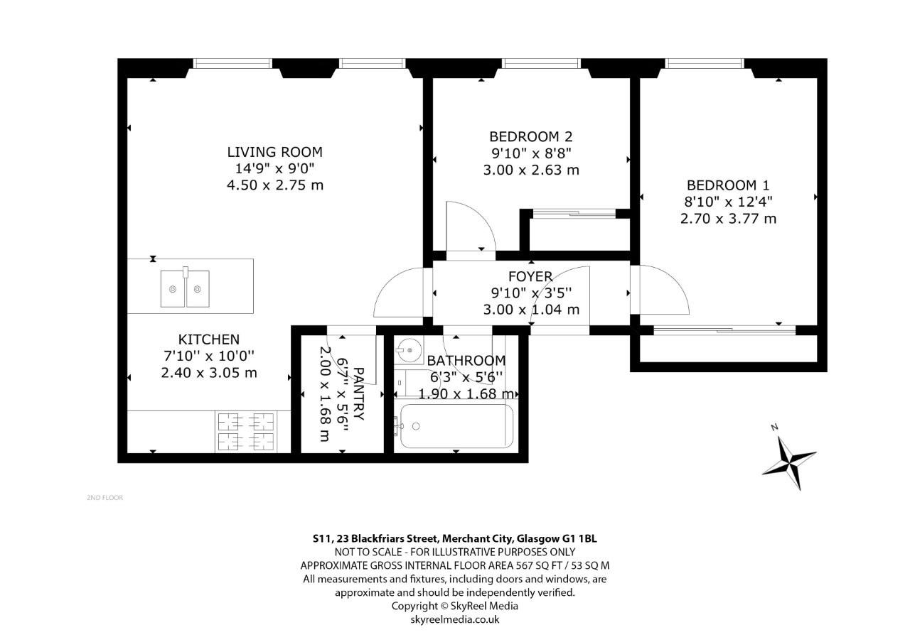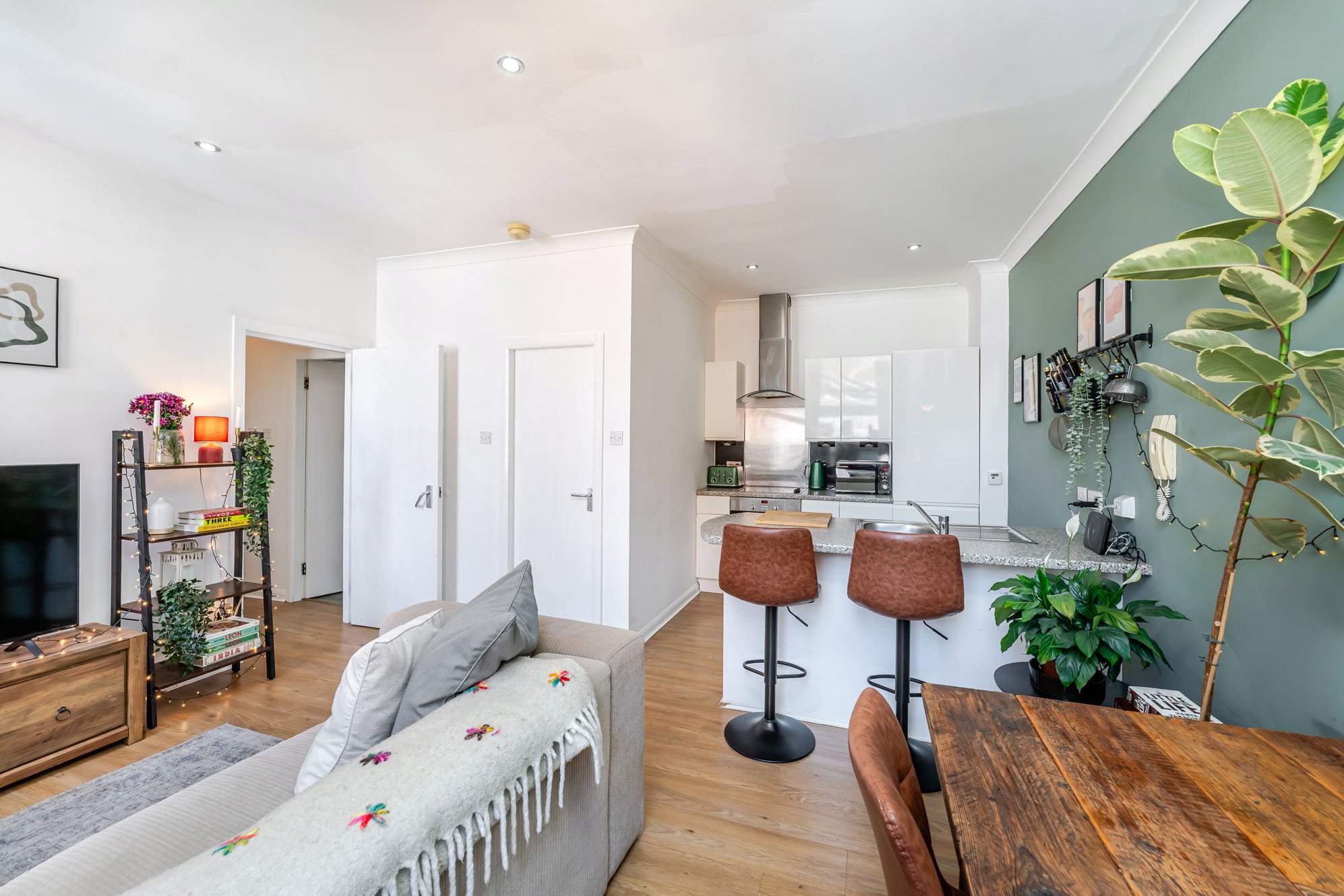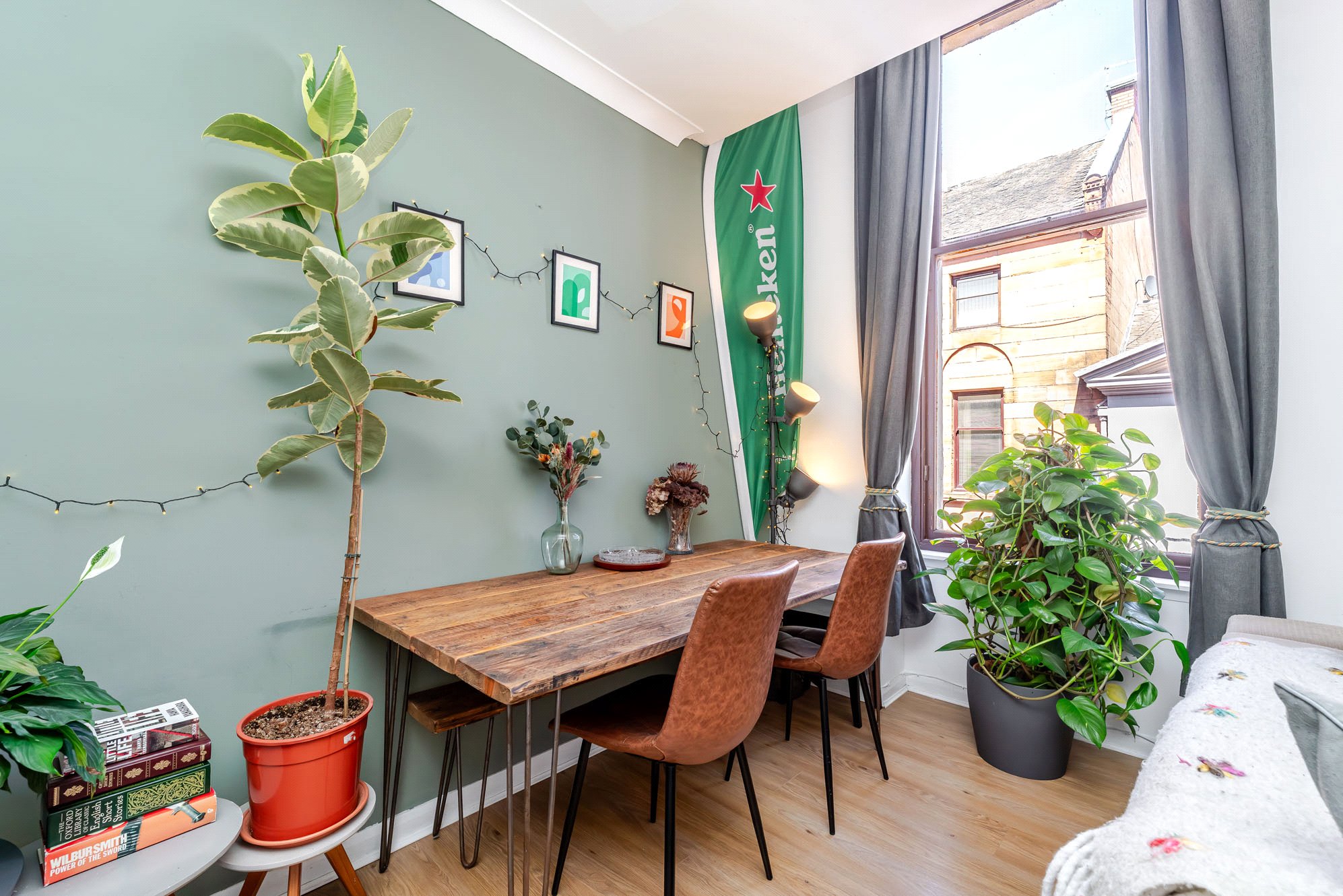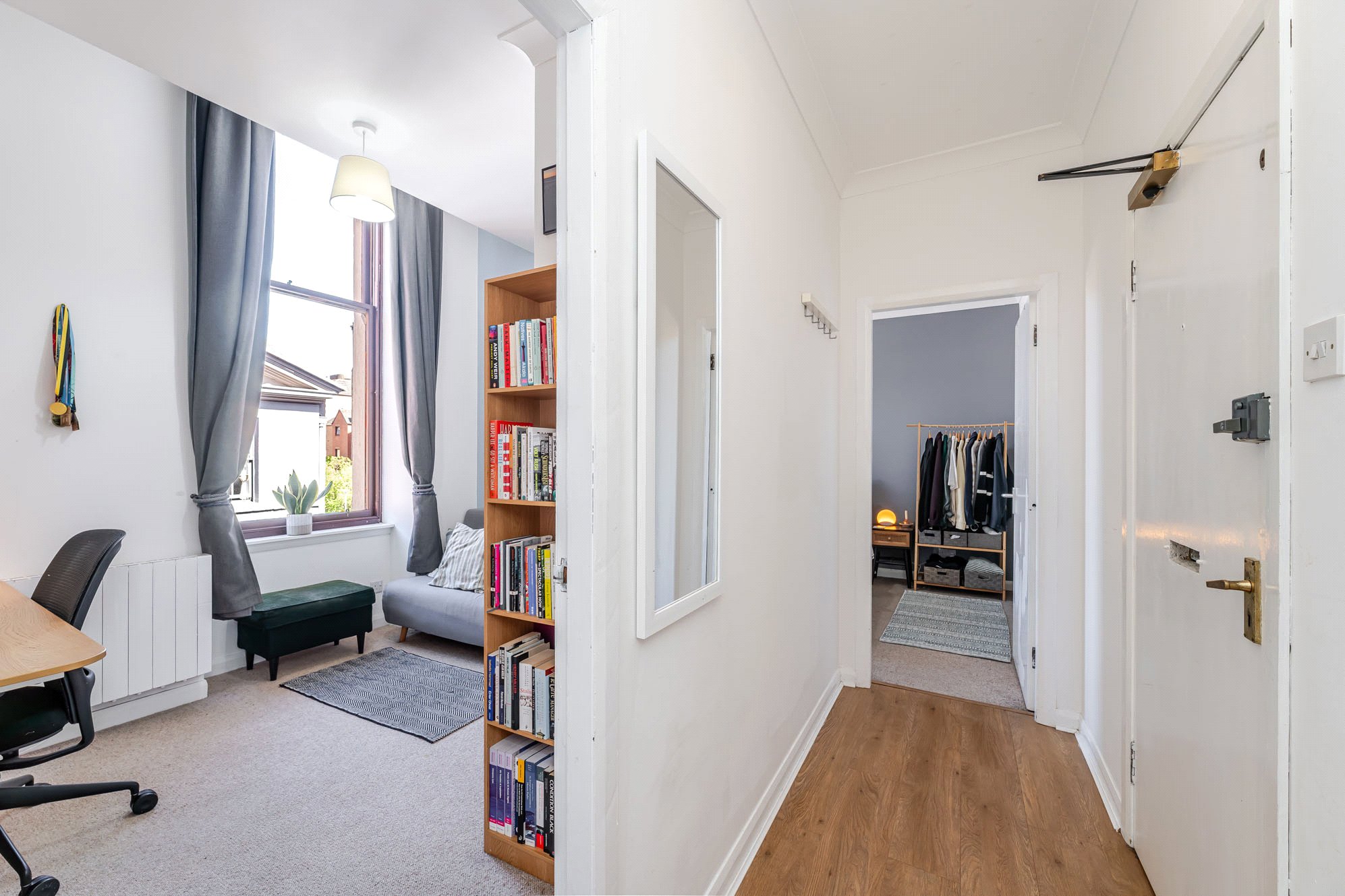 Entered via security entry from street and at each landing, this second floor two-bedroom property benefits from bright and well-presented accommodation, it has been upgraded by the current owners and features notable highlights including a generous living/dining room with a modern kitchen off set with integrated appliances to include dishwasher and a washing machine and separated by a breakfasting peninsula, there are two double bedrooms with the main bedroom having good storage and a there is a bathroom with three-piece suite and over bath shower. The property has electric heating, laminate wood flooring, fresh décor, sash and case style windows. The development hosts a resident’s laundry facility and has the additional bonus of the availability of on-street residents’ permit parking through Glasgow City Council.