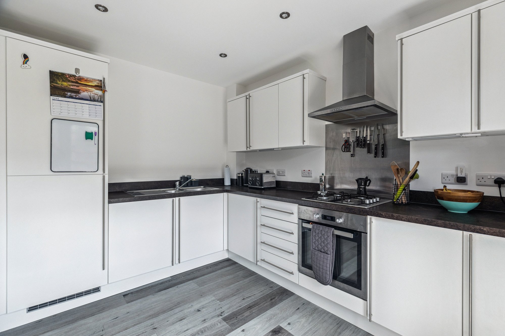 Accessed via secure entry with stair access, the internal layout comprises: welcoming reception hallway with two storage cupboards, bright and spacious living/dining room with direct access to a private south-facing balcony; modern kitchen with matt white units and integrated appliances; two double bedrooms to the rear with fitted wardrobes(the main bedroom benefits from an en-suite bathroom); and a contemporary bathroom with a white three-piece suite and over-bath shower. The property benefits from gas central heating, high-quality floor coverings, an EPC Band B rating, and an allocated parking space. Early viewing is highly recommended to appreciate the generous proportions and stylish interior of this standout apartment.