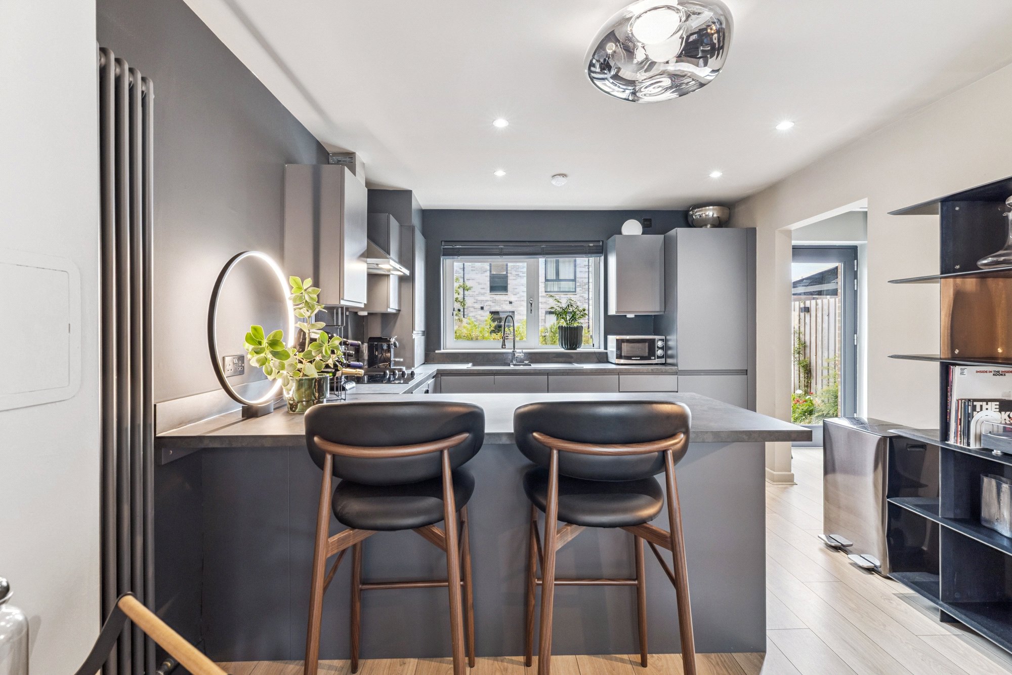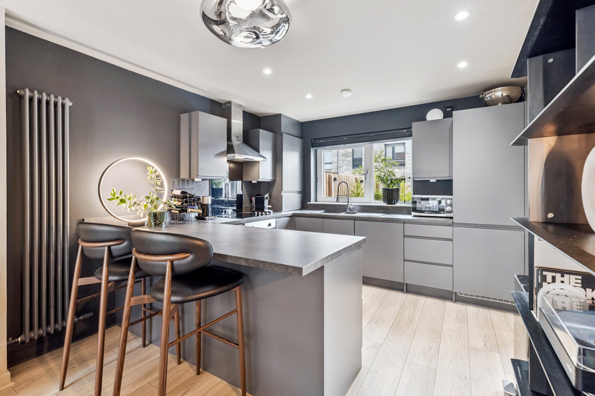 The private driveway and front garden area leads to front door entry. The welcoming entrance hallway has bespoke fitted understairs storage drawers, a utility space, a cloak w.c., stair access to upper floors and offers entry to the generous and bright main living space extending over 24 ft and reconfigured as an open-concept living space with a very generous dining area, re-fitted kitchen complete with a range of matt grey base and wall mounted units with integrated appliances and additional breakfasting peninsula, there is a snug and library off set from the kitchen providing patio door access to the west facing, secure decked garden area.