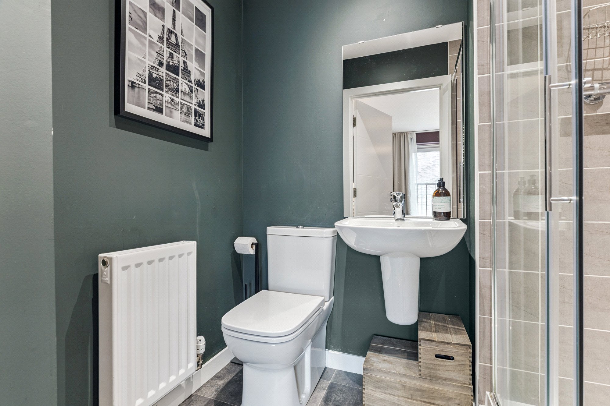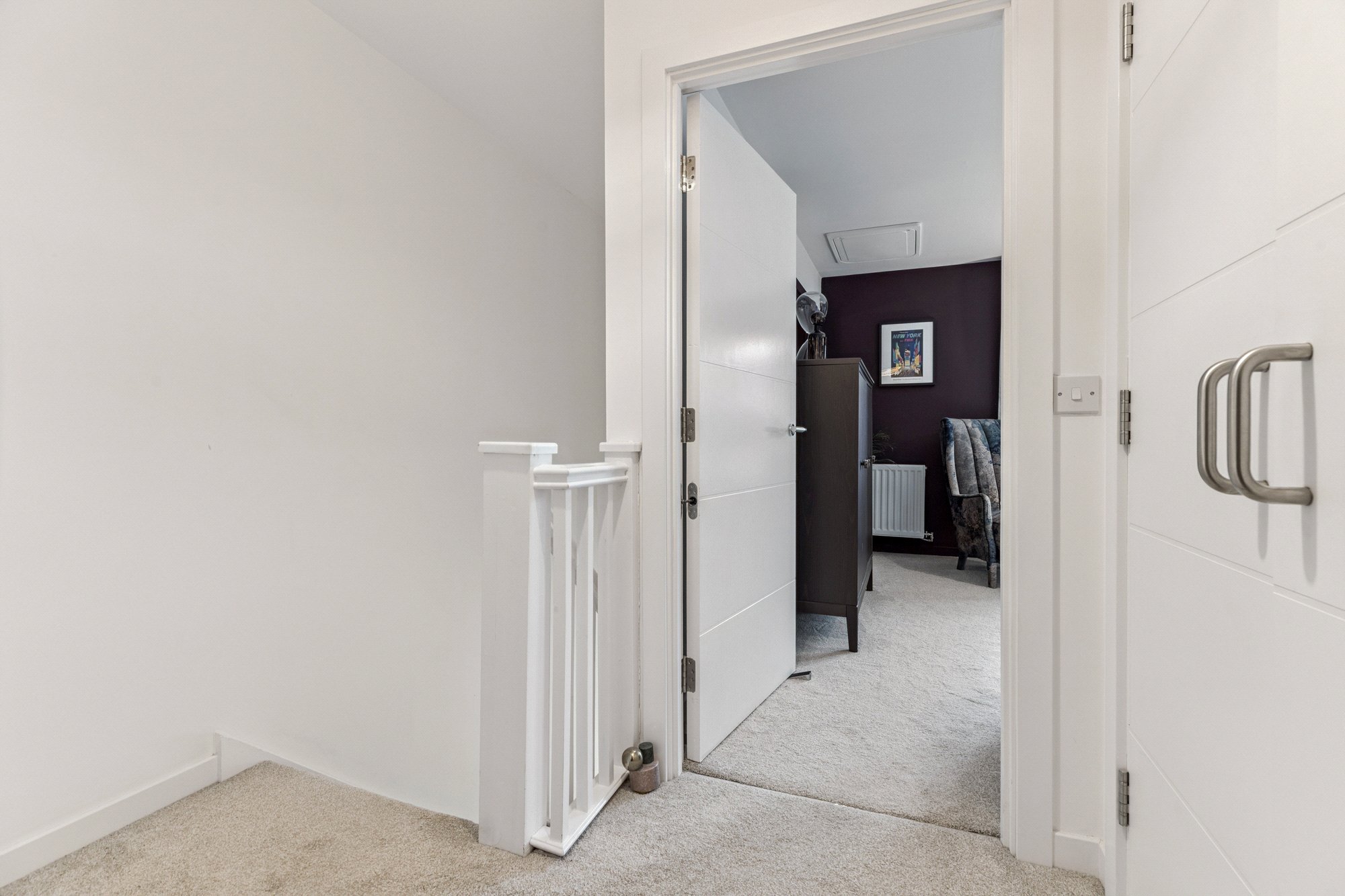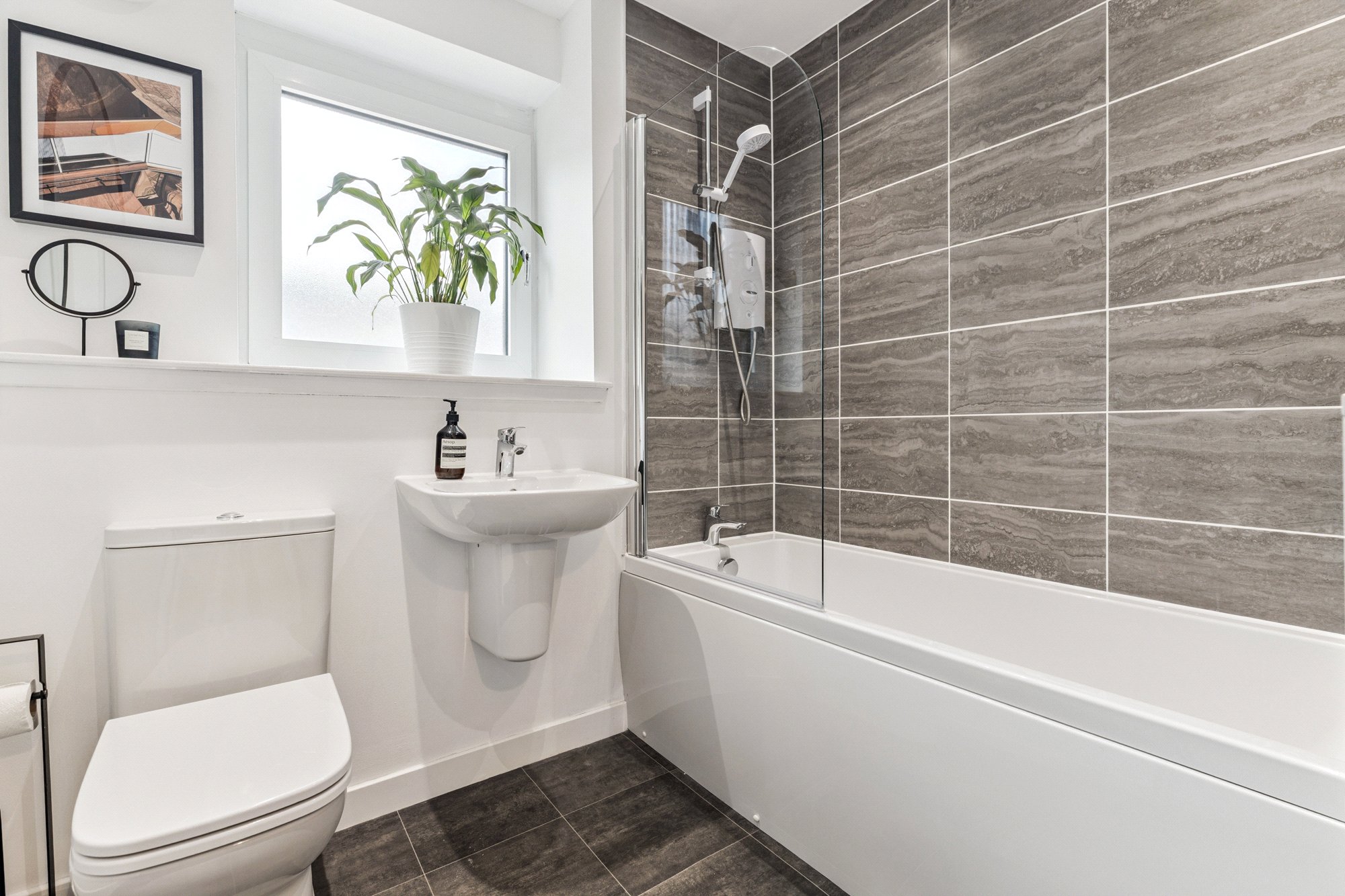 Accommodation on the first floor extends to two generous double bedrooms both with fitted wardrobes and sharing a main bathroom with three-piece white suite, over bath shower and stylish wall and vinyl floor coverings.