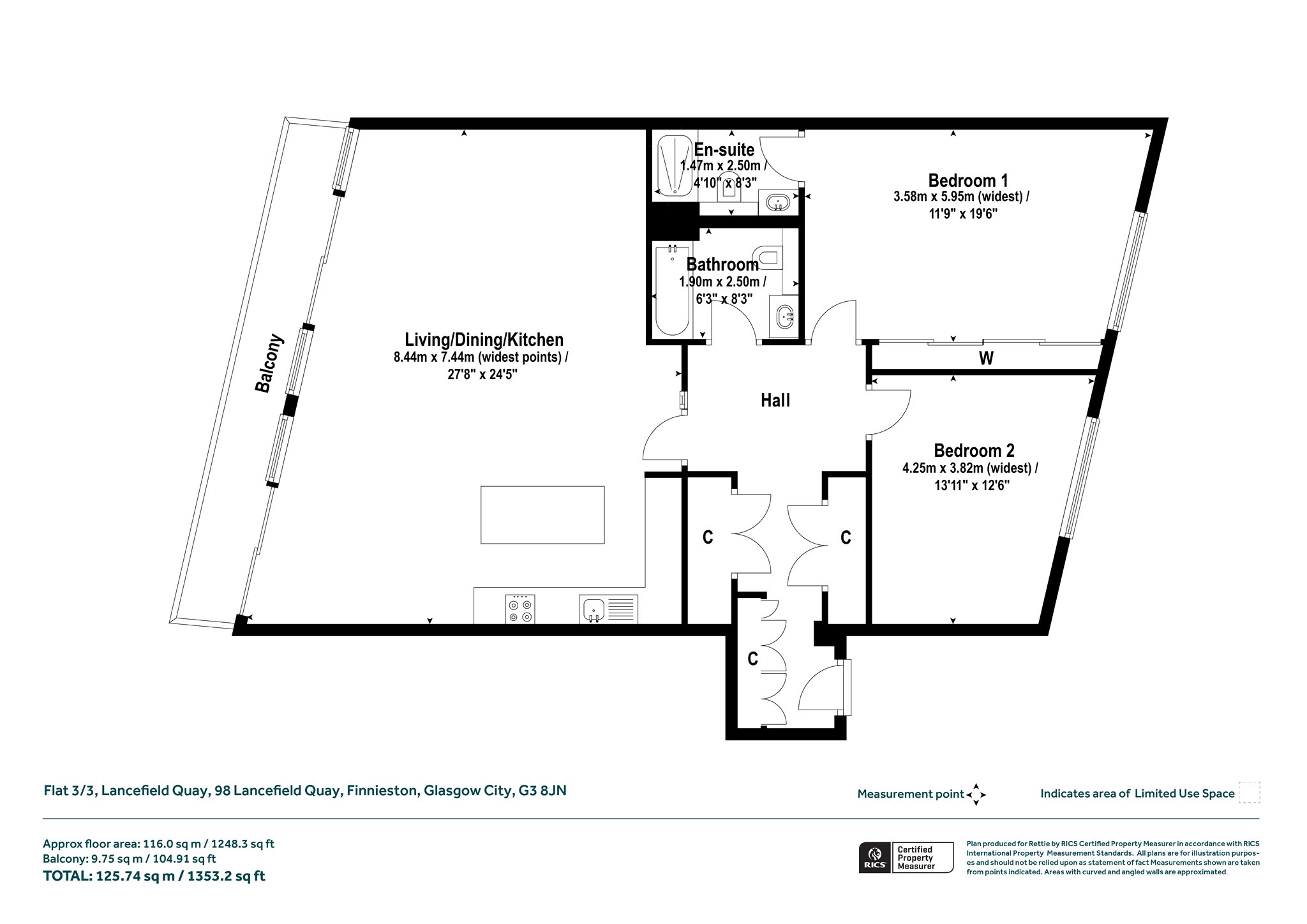 This bright, modern and very generously proportioned waterfront apartment forms part of the Lancefield Quay Development completed circa 2004. The property is one of the larger style two bedroom apartments within the development, extending to 1353 sq ft and is situated on the third floor of the southeast corner of the building, benefiting from a striking full height wall of glass spanning the living space to the private balcony, flooding the apartment with natural light and providing uninterrupted views from east, south and west over the River Clyde and wonderful sunsets over the Clyde Arc Bridge. The development is currently undergoing a comprehensive cladding remediation scheme being undertaken by the developers Miller Cala and is accepted for the Scottish Governments Single Building Assessment Scheme.