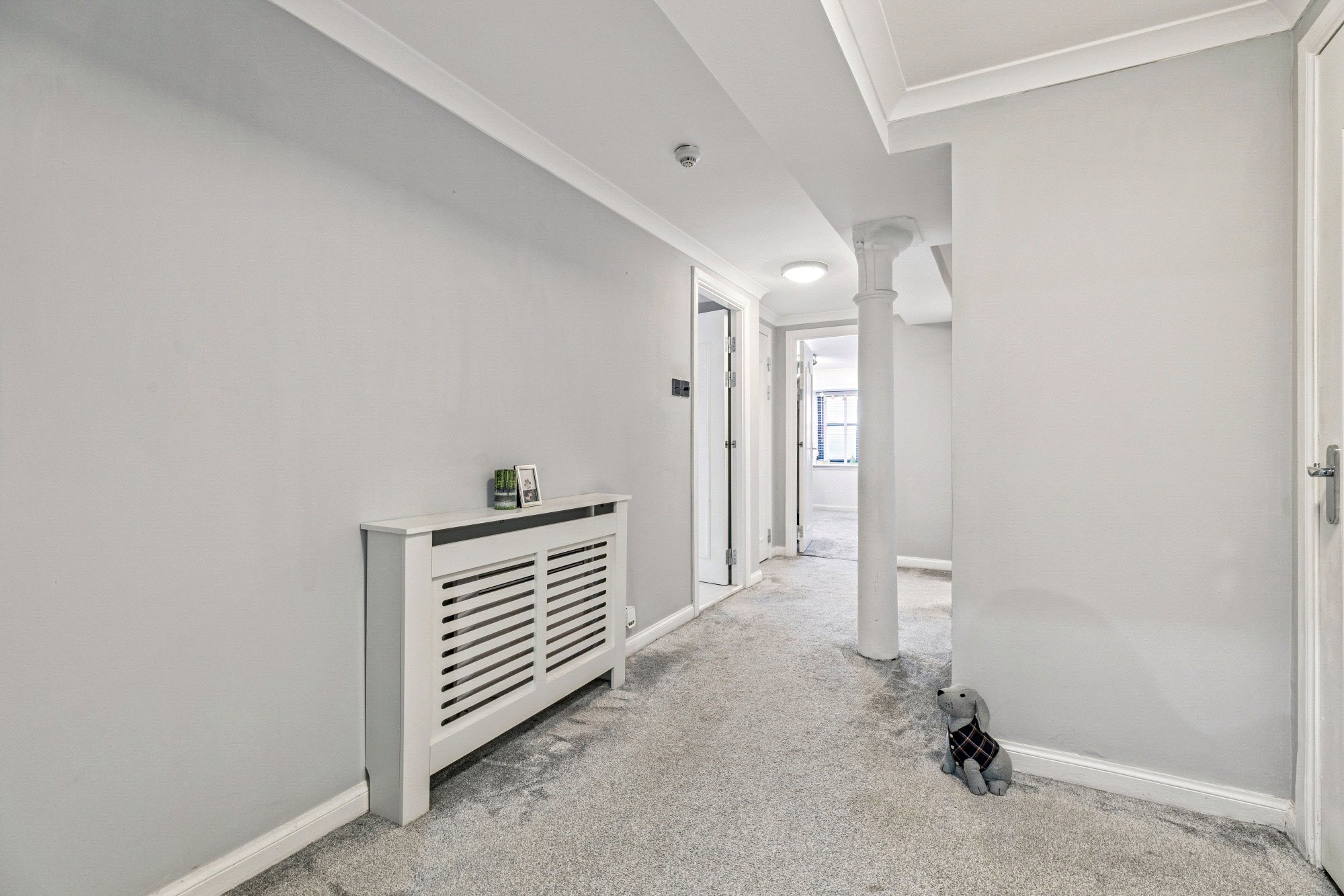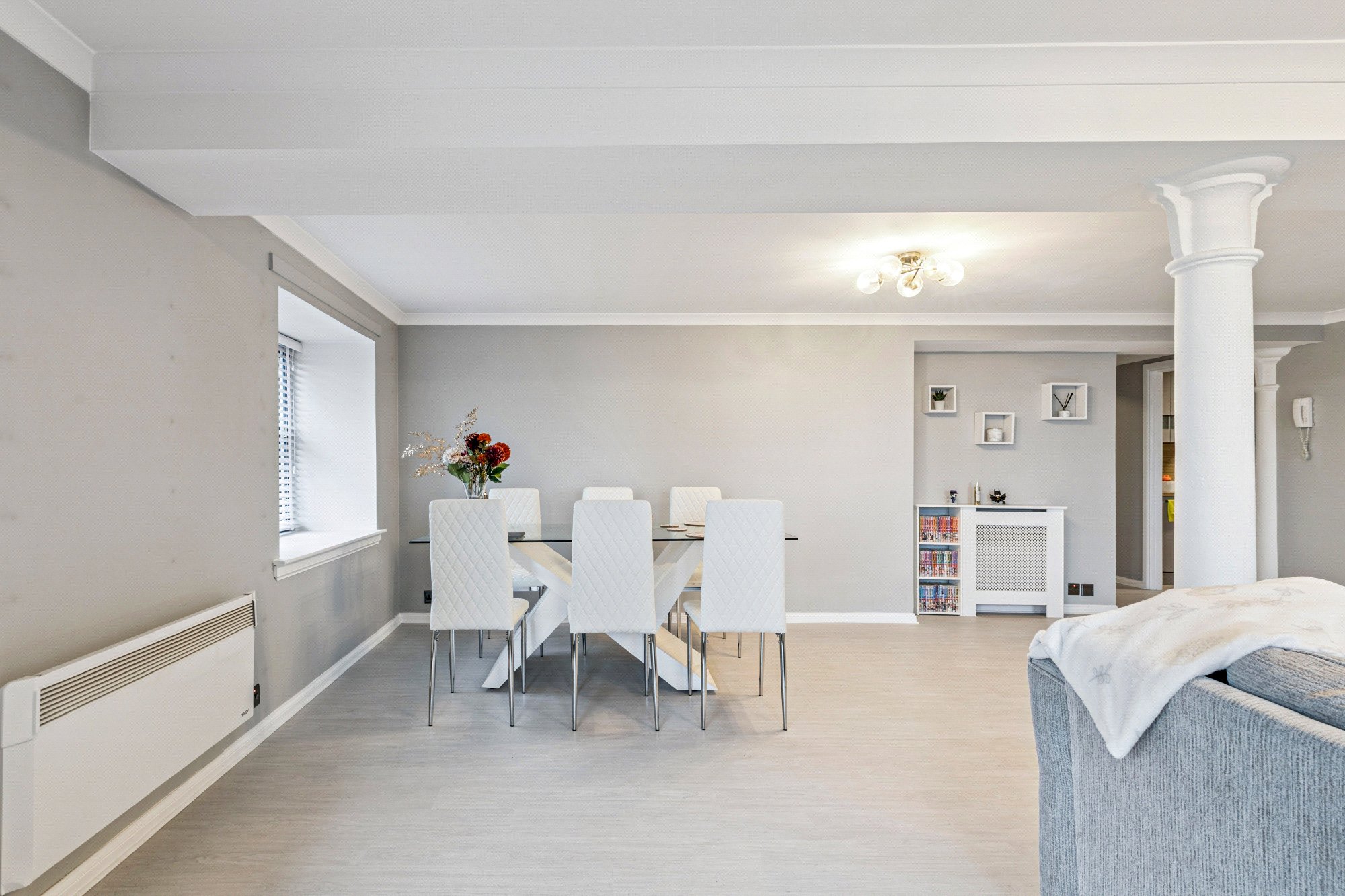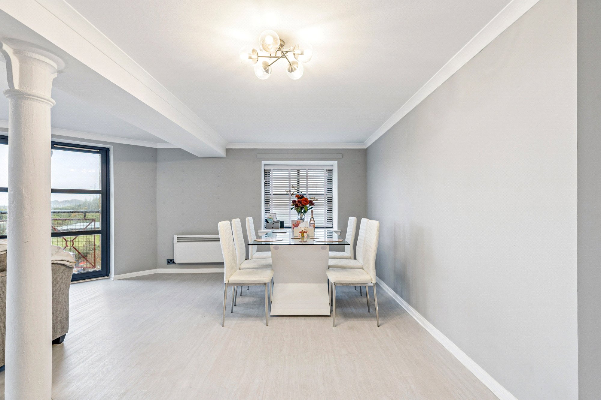 Accessed via security entry system, the communal entrance hall has both lift and stair access. The property has welcoming reception hall provides access to all main apartments and includes two generous storage cupboards. The main living and dining room spans 28 ft and features attractive structural beams and two recessed windows and corner balcony. The modern, semi-open-plan refitted kitchen is equipped with a range of base and wall-mounted units and integrated appliances. The generous main bedroom includes a large, fitted wardrobe with sliding glass doors providing excellent storage, a recessed window, and a refitted en-suite bathroom featuring over bath shower, bedroom two is a good-sized double with a recessed window and fitted wardrobes and there is a refitted shower room. The property is finished with fresh décor, a mix of carpet and laminate floor coverings, electric heating operated via smart sockets, and double glazing. Residents enjoy access to a gym, swimming pool, and off-street parking.