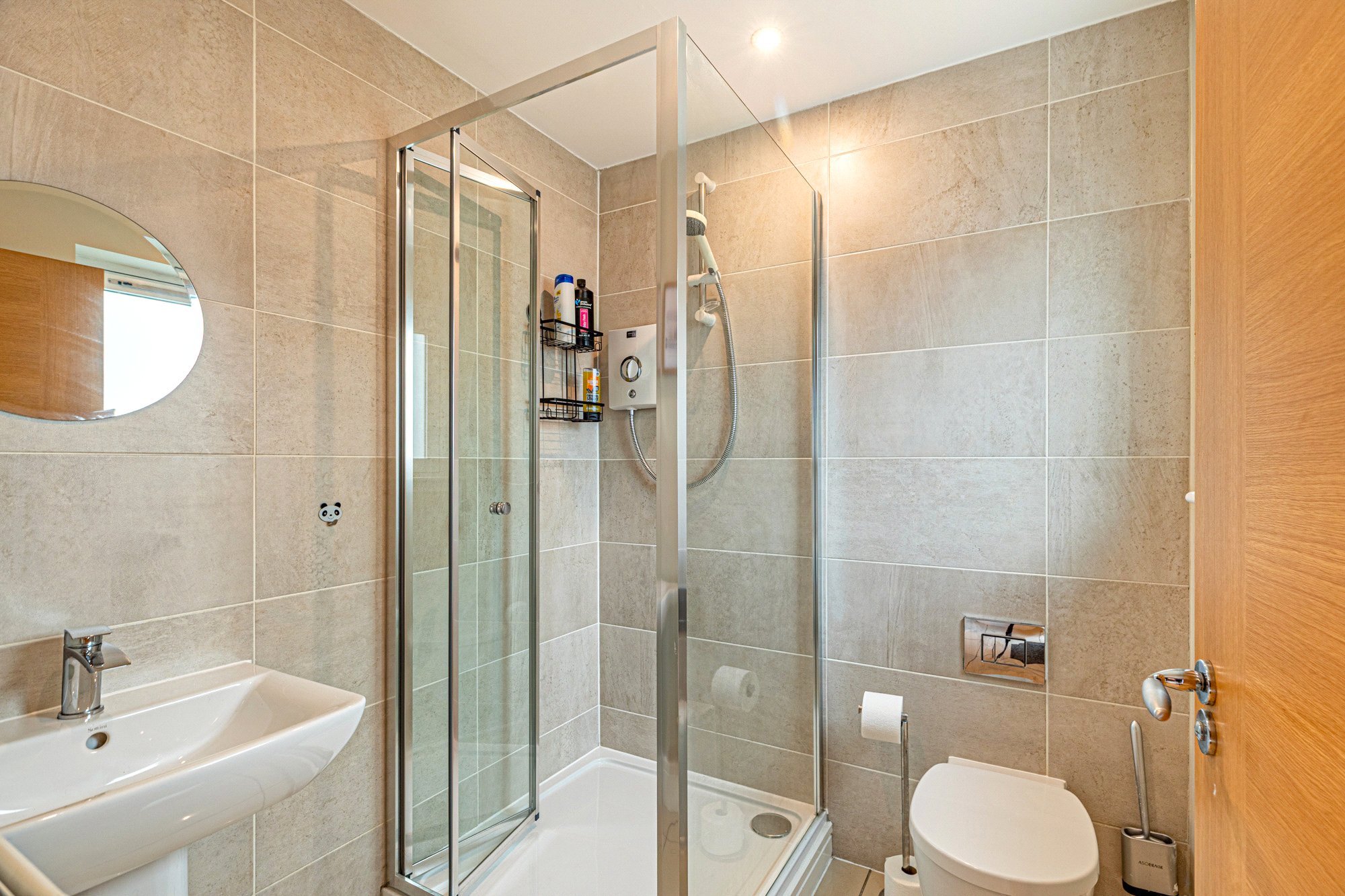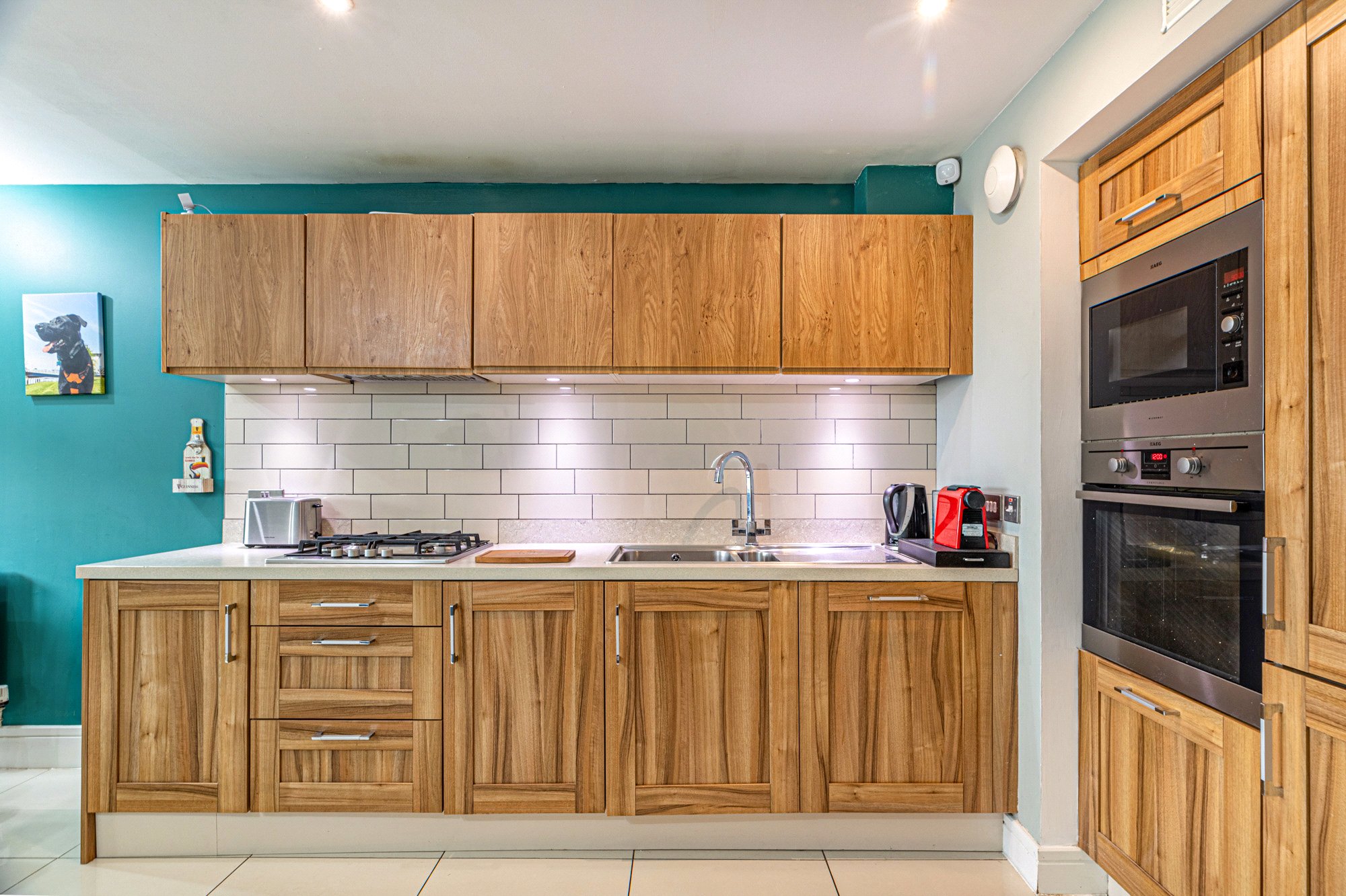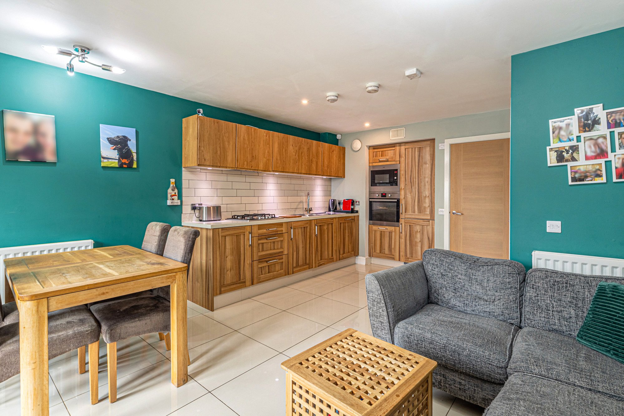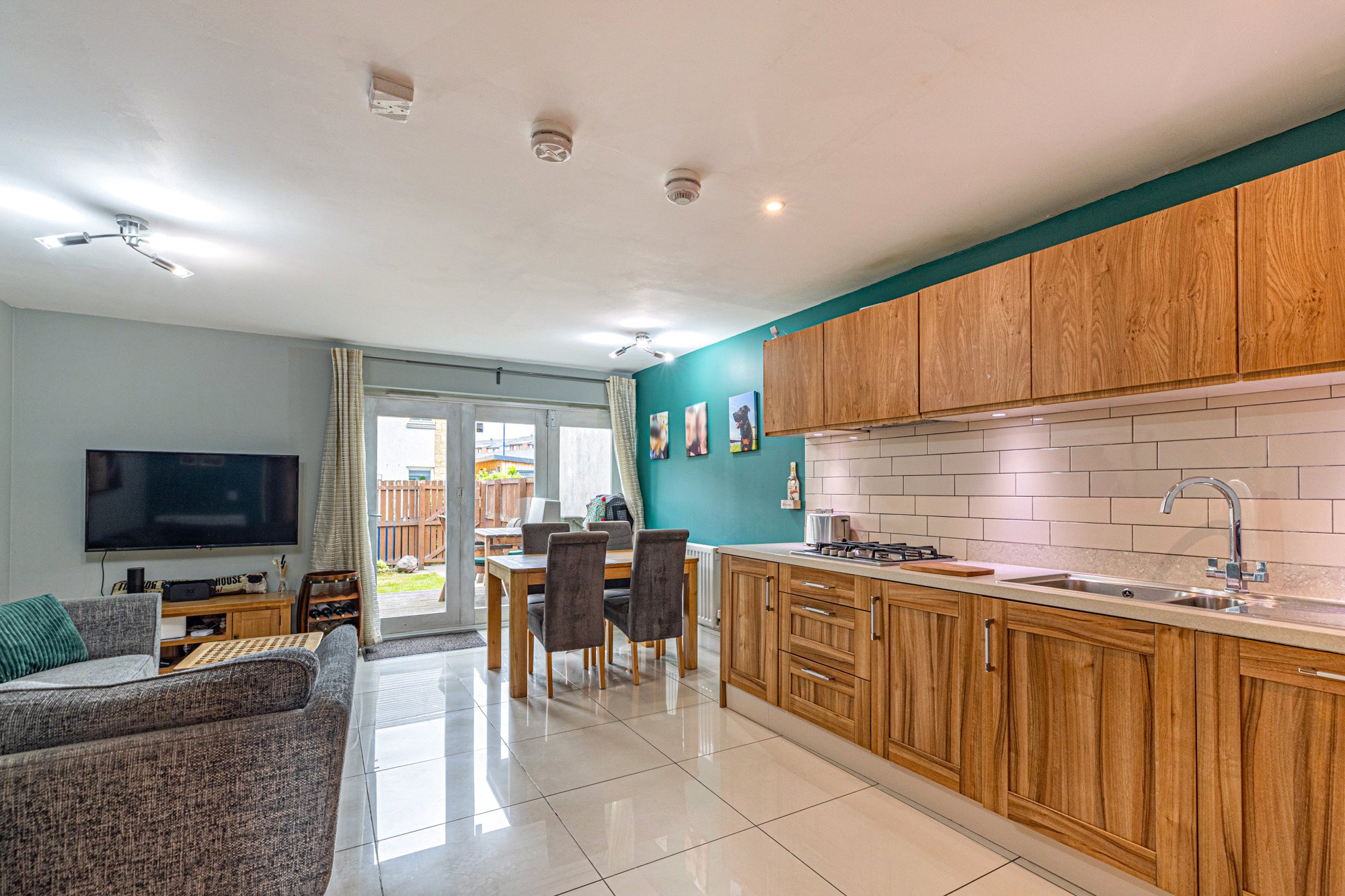 Main door entry to welcoming reception hallway with stairs to upper floor. Downstairs there is a re-fitted shower room, hall leads through to the open plan living dining and kitchen space spanning over 20 ft, the kitchen area is the modern and bright kitchen with a range of base and wall mounted cabinets and integrated appliances and with natural light flooding in from patio doors to the garden and a handy laundry cupboard offering additional storage. Upstairs there are two double bedrooms, both with fitted wardrobes and there is a modern main bathroom with white three-piece suite with over bath shower, two storage cupboards and access to a floored loft. The property has EPC Band B with double glazing and gas combi central heating boiler.