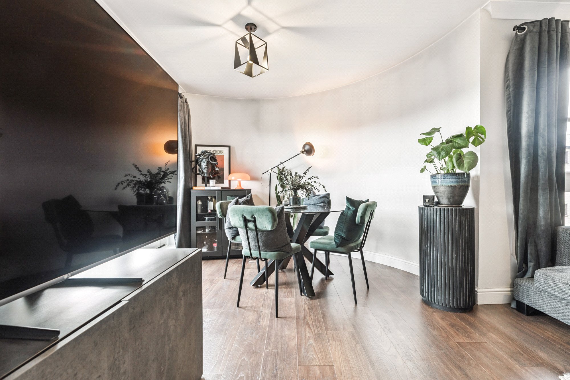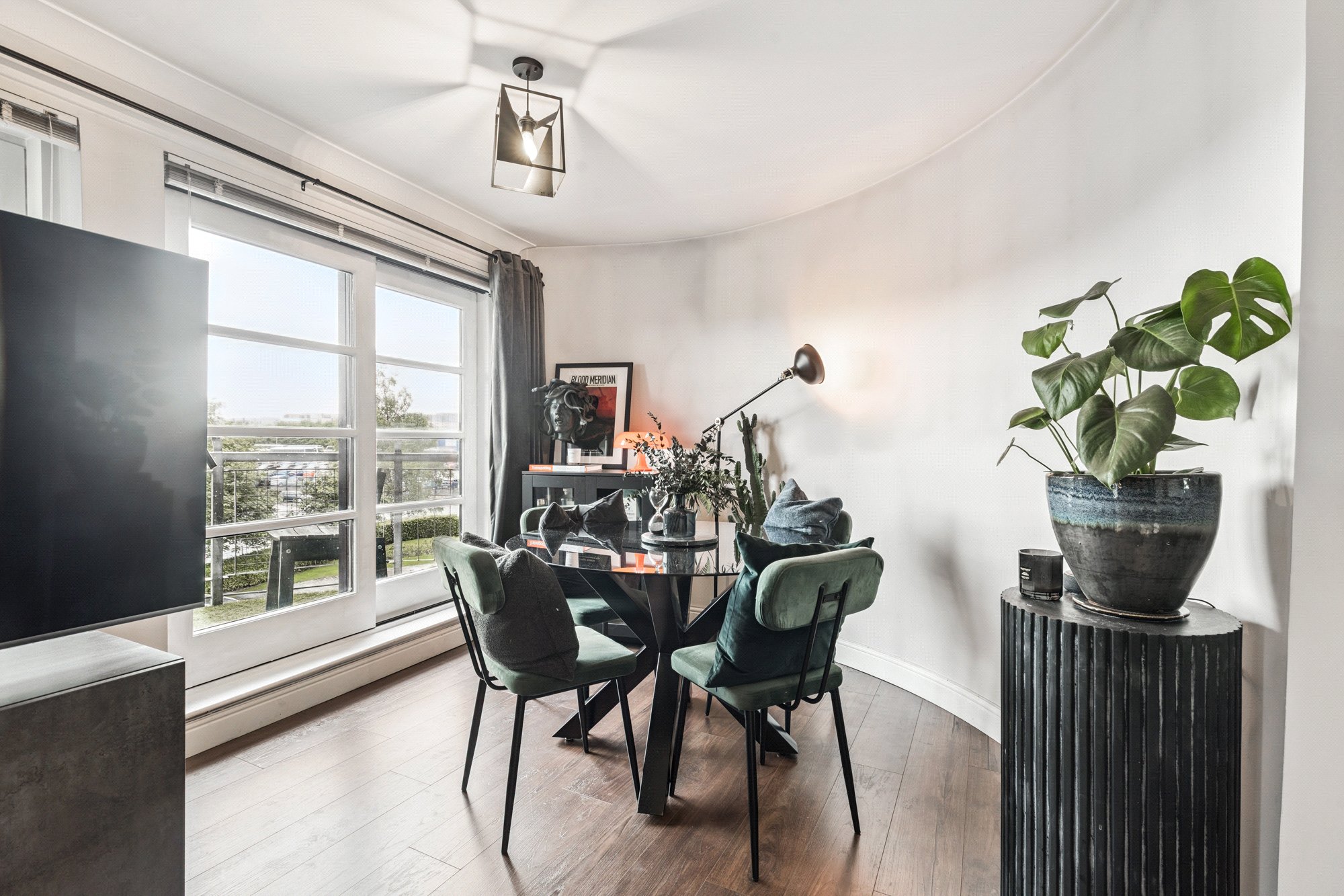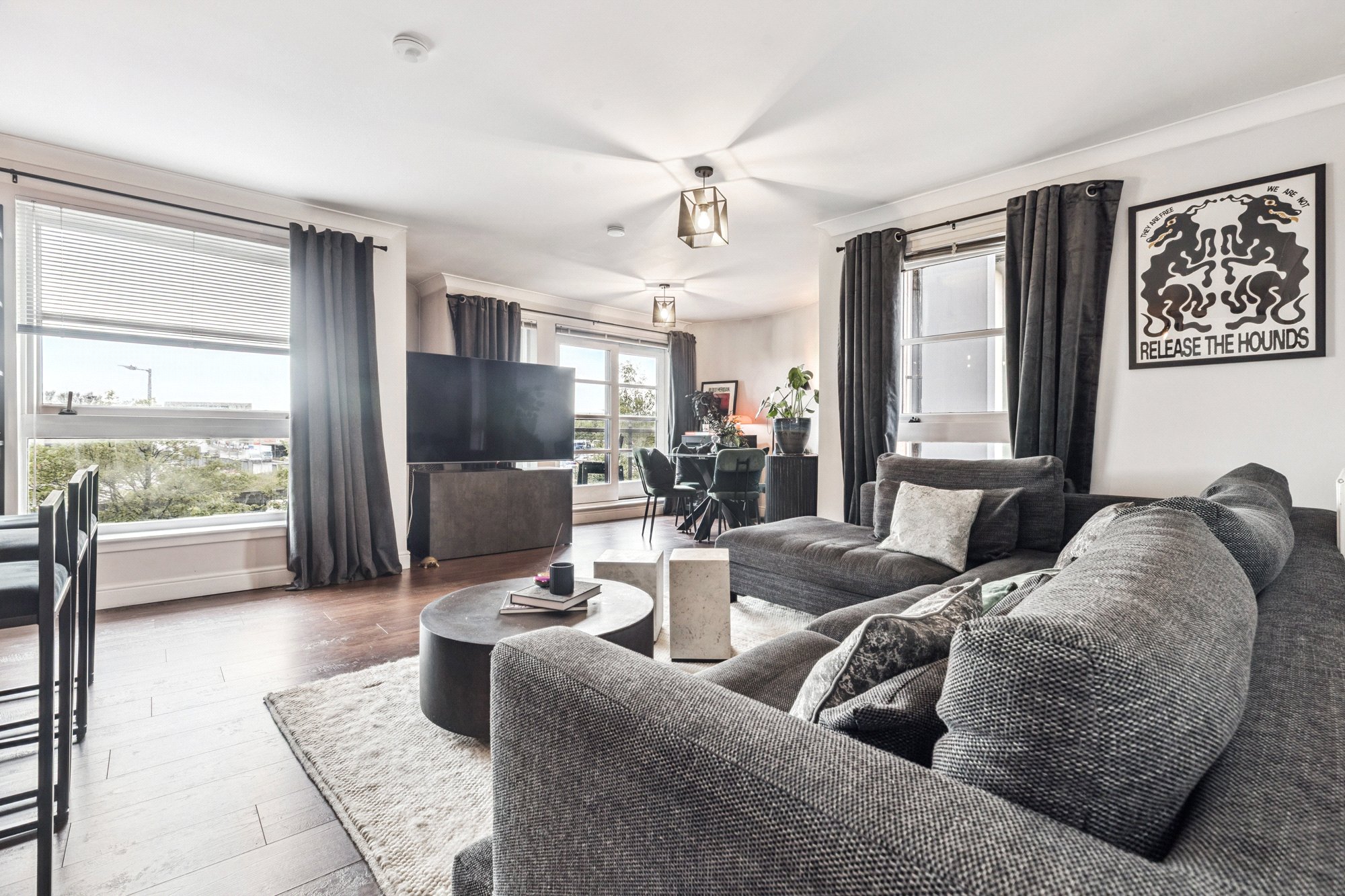 Occupying a prime position on the second floor, this generously proportioned home extends to over 880 sq. ft. and has been extensively upgraded by the current owner, including a sleek re-fitted kitchen with island (2020), a contemporary shower room, dedicated laundry space and high-quality flooring throughout. Finished in a chic, modern palette, the flat is flooded with natural light thanks to its triple aspects — east, south and west — and the impressive open-plan living area, over 27 ft in length, incorporates a striking circular dining space and direct access to the private balcony.