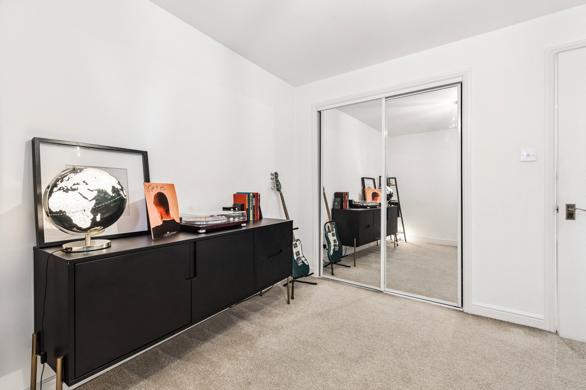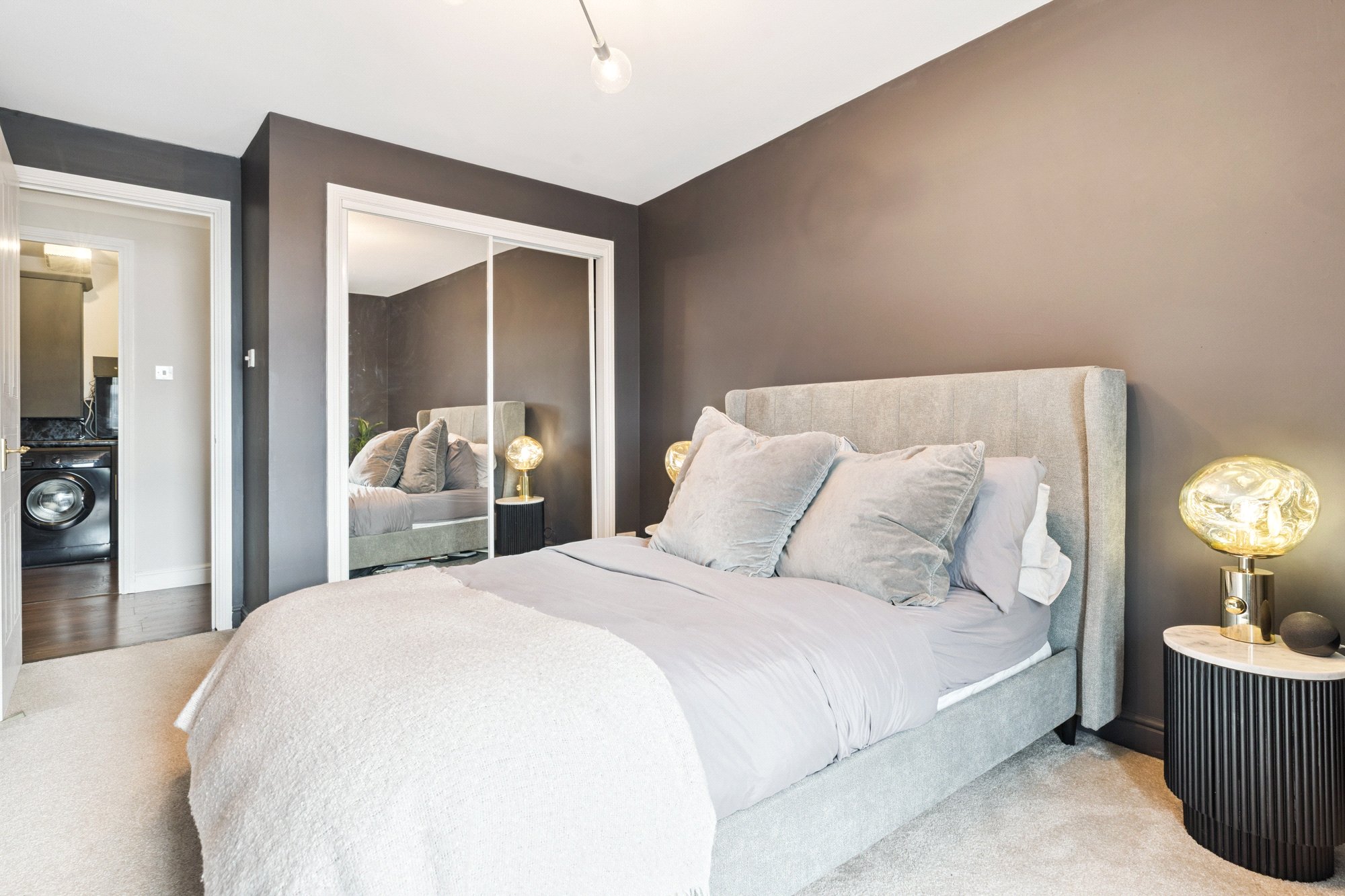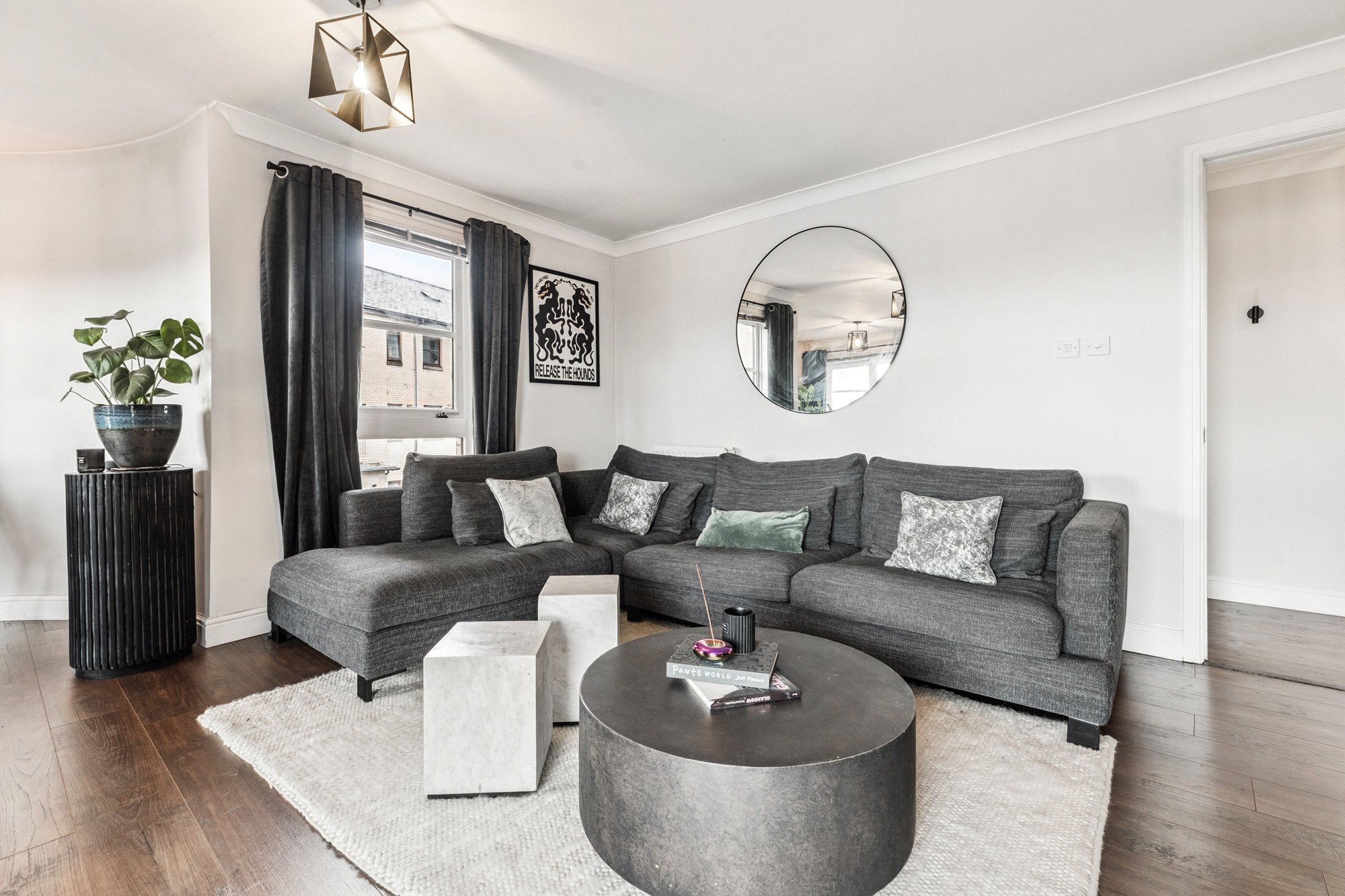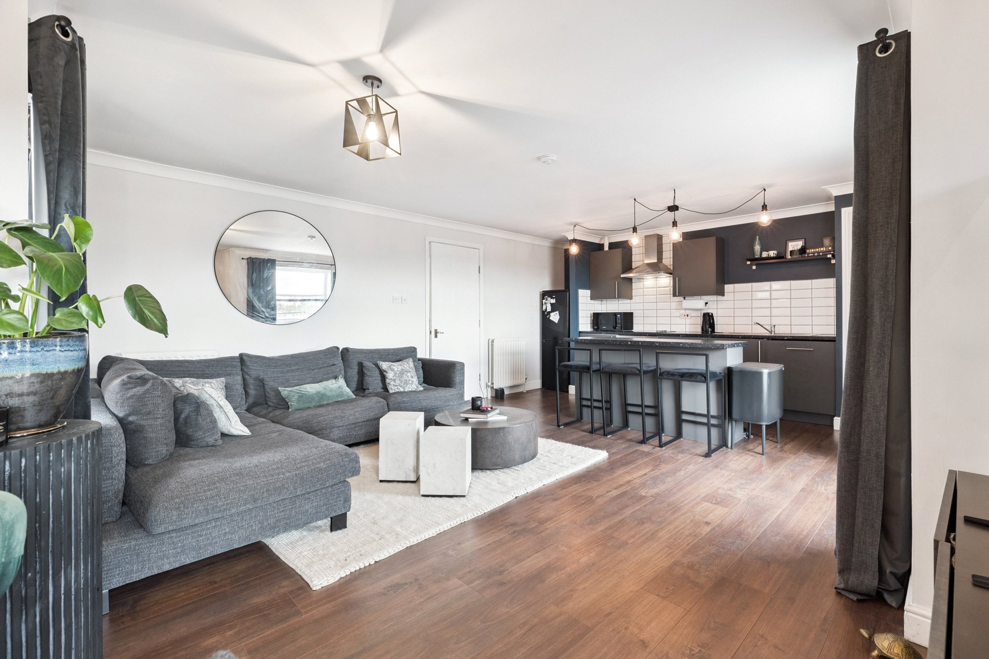 Occupying a prime position on the second floor, this generously proportioned home extends to over 880 sq. ft. and has been extensively upgraded by the current owner, including a sleek re-fitted kitchen with island (2020), a contemporary shower room, dedicated laundry space and high-quality flooring throughout. Finished in a chic, modern palette, the flat is flooded with natural light thanks to its triple aspects — east, south and west — and the impressive open-plan living area, over 27 ft in length, incorporates a striking circular dining space and direct access to the private balcony.
