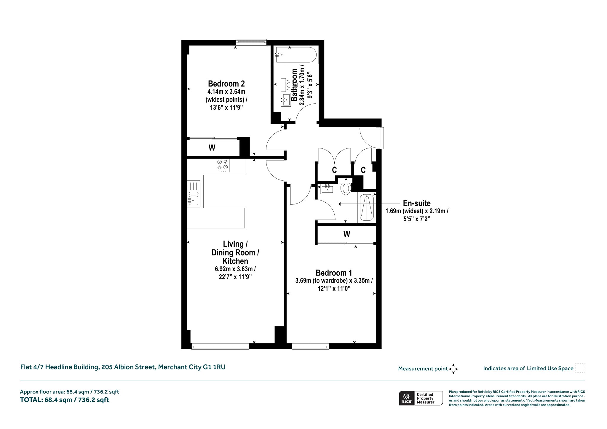 With chic interior styling, this modern two-bedroom fourth floor apartment forms part of the popular Headline Building and occupies an incredibly convenient location in Glasgow’s Merchant City. It is exceptionally well placed to take advantage of an enviable selection of desirable amenities. The property itself is positioned to overlook Albion Street, with accommodation extending to 736 sq ft the apartment is bright and comfortably proportioned with notable highlights including the impressive living/ dining room spanning over 22’7” into the stylish fitted open plan kitchen area and separated by a peninsula breakfasting bar, mani bathroom and en-suite shower, a separate utility cupboard, excellent storage throughout and a large central residents’ courtyard.