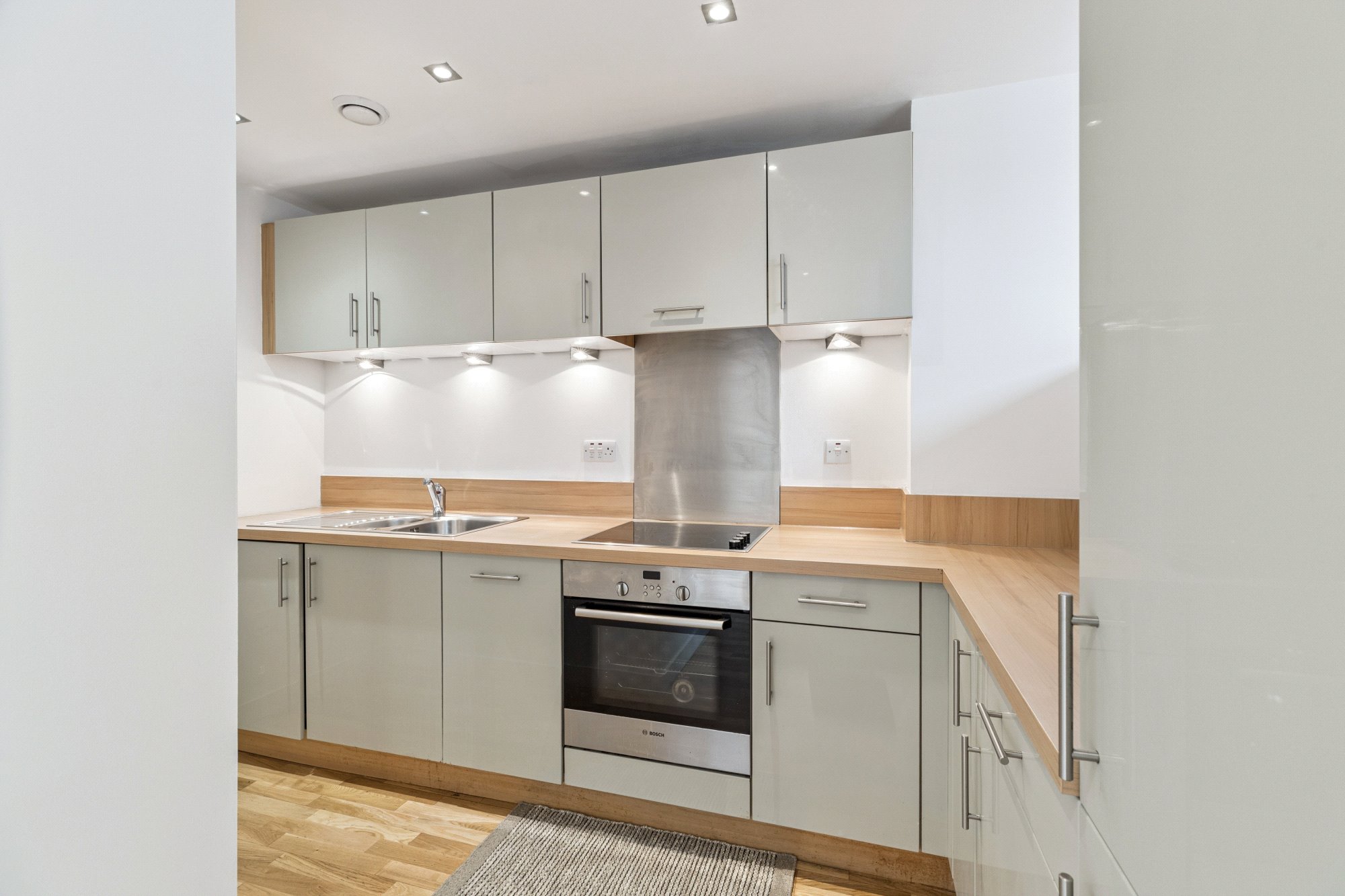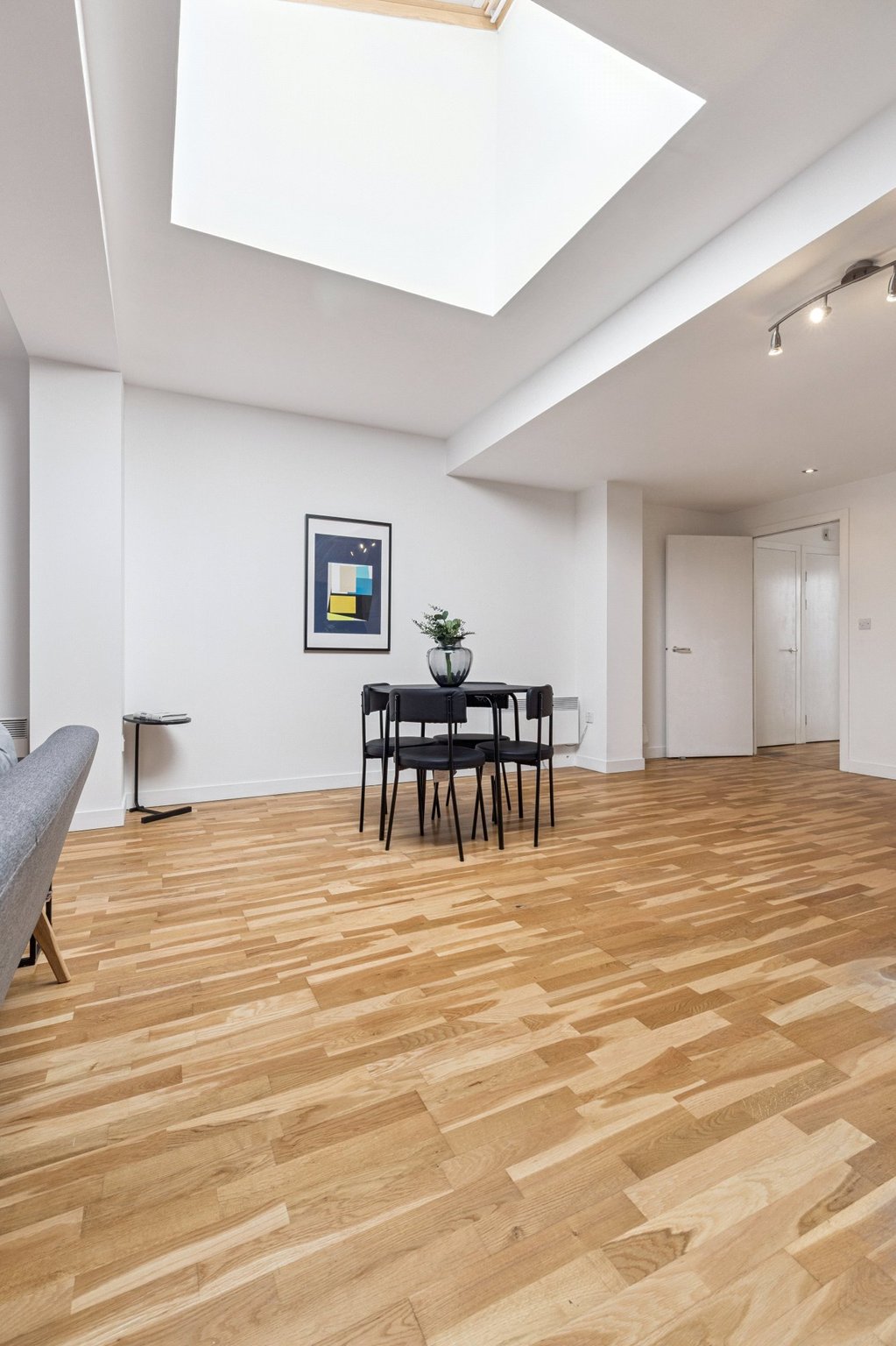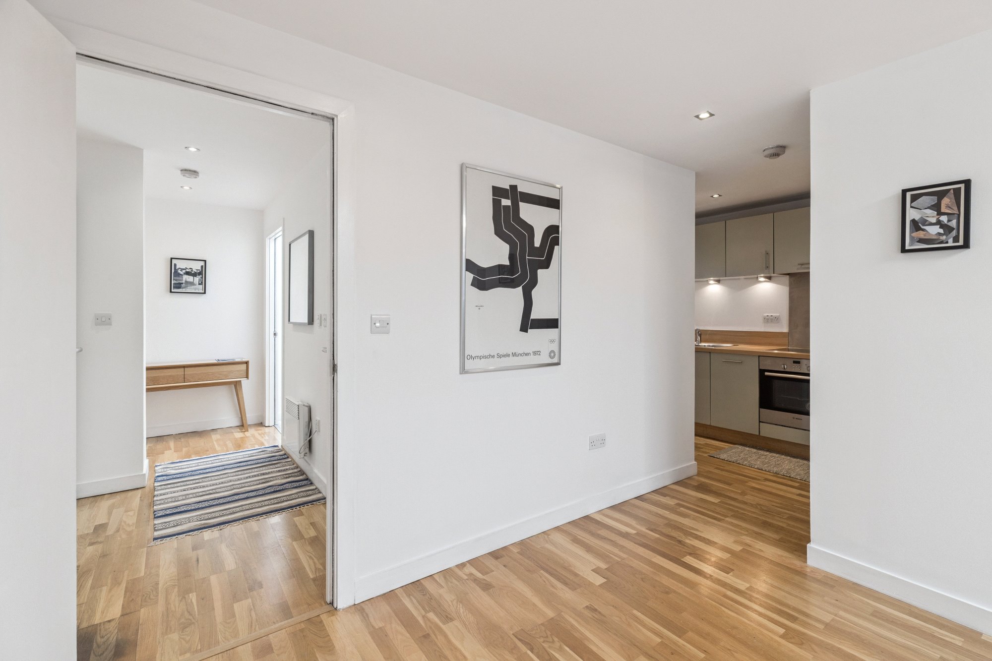 Accessed via security entry to communal hallway, there is both lift and stair access to upper floors. Completed in 2009 by Messer’s Burrell Homes the flat forms part of the traditional sandstone warehouse refurbishment section of the development. The accommodation comprises reception hallway with quality wood flooring, a laundry room cupboard, additional storage and access to the impressive open plan living/dining room spanning with engineered wood flooring and modern kitchen set back from the living space, complete with a range of base and wall mounted units, integrated appliances, main three-piece bathroom complete with tiled floor and wall coverings and over bath shower, the double bedroom is a haven for sleep with its Velux window and cavernous feel. The property has double glazing, electric heating system and fresh décor throughout. There is a locked communal bike store in the basement and an active building Residents Committee and WhatsApp group to steer the building management and maintenance.