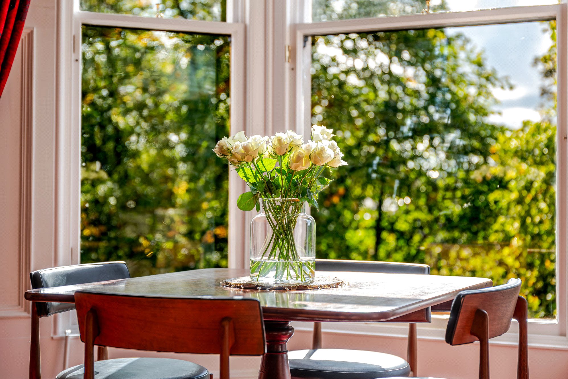 The home for sale is set within an elegant blonde sandstone townhouse at number 17, occupying an enviable position on the preferred curving section of Athole Gardens and facing south-east over the stunning, tree-lined central residents’ gardens. Number 17 has been thoughtfully subdivided into five private dwellings, all of which share access to a beautifully landscaped rear garden. Designed for ease of maintenance, this communal outdoor space features a generous timber deck – a perfect spot for residents to relax and enjoy the peaceful ambiance of Dowanhill when the weather allows.