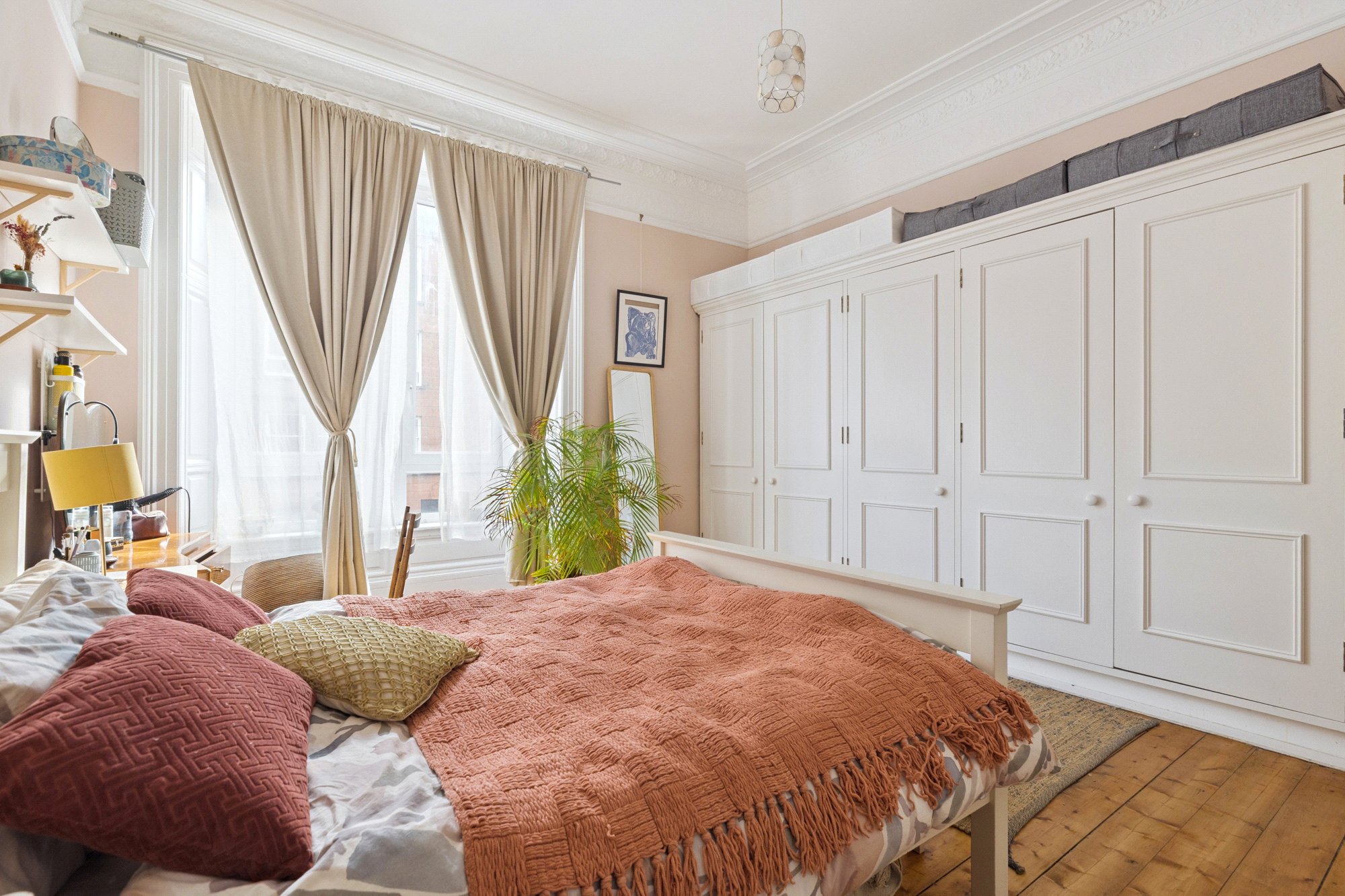The property retains many period features, including decorative cornicing, press shelving and attractive door architraves, original doors and sanded original floorboards. Further benefits include a gas central heating, double glazing, excellent storage, and access to shared rear courtyard gardens. Free on-street parking is also available directly outside.