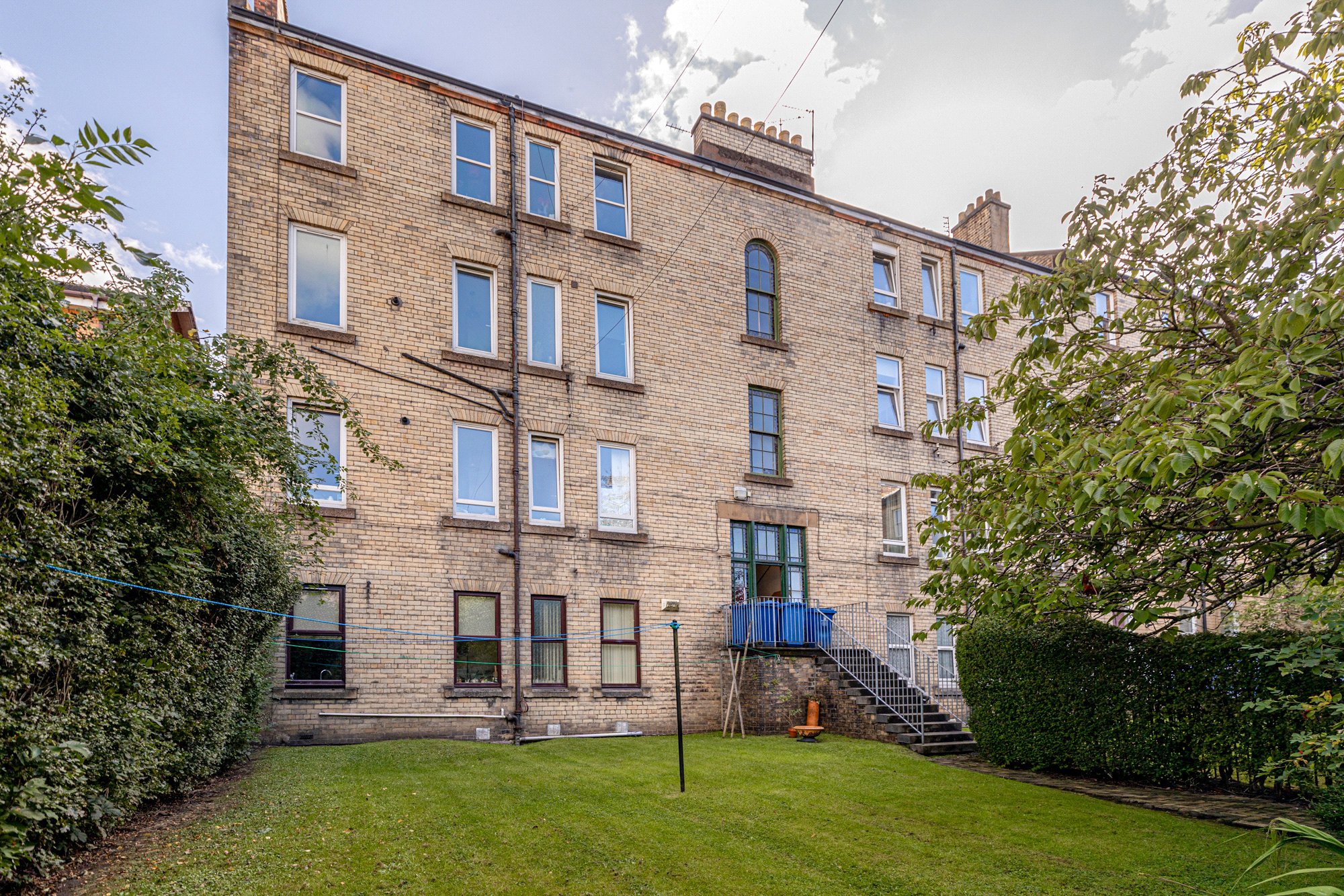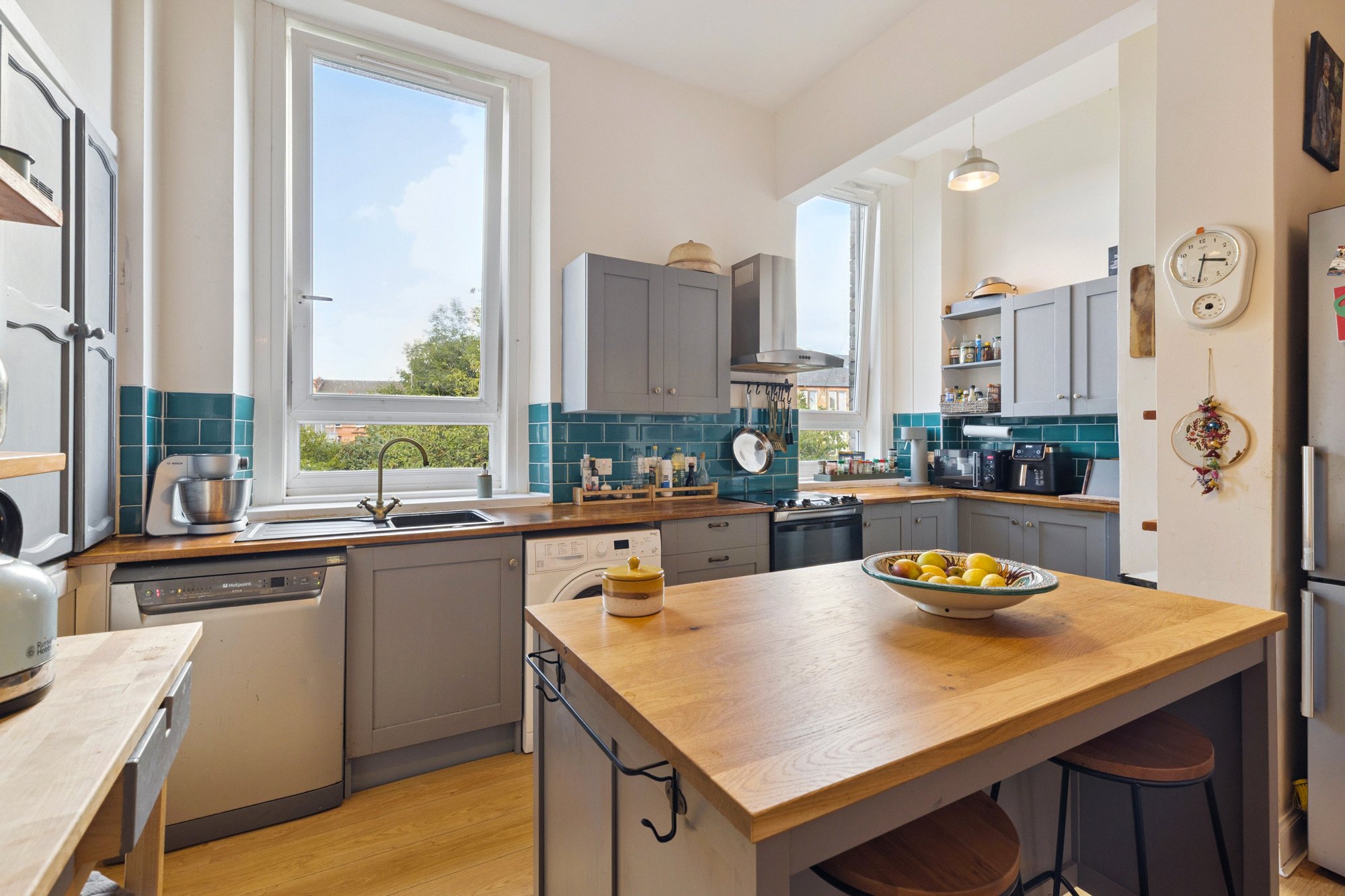 Accessed via secure entry to the communal close, a striking example of traditional tenement with moulded wall panels and cement floor with inlaid design and stairs to storm door entry. Welcoming entrance hallway spanning over 20 ft and with two storage cupboards. The living room features an impressive three-section bay window and deep recess with shelving, modern kitchen with lots of natural light from two windows facing over the communal rear gardens, kitchen island and dining recess, there are three spacious double bedrooms with the principal bedroom having a walk-in cupboard and a wall of fitted wardrobes. The family bathroom has white three-piece suite with claw foot roll top bath and over bath shower.