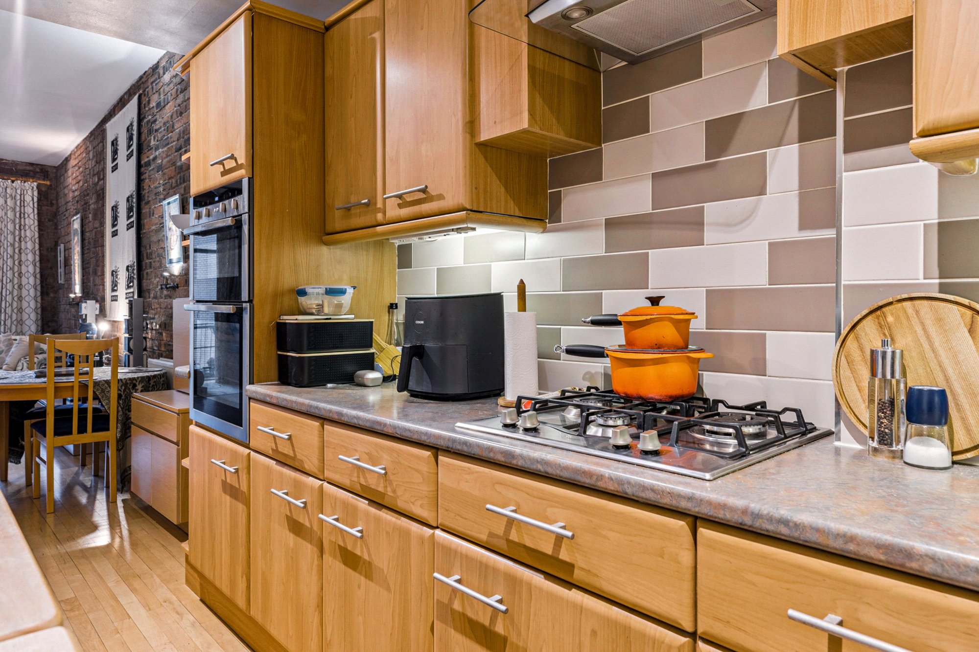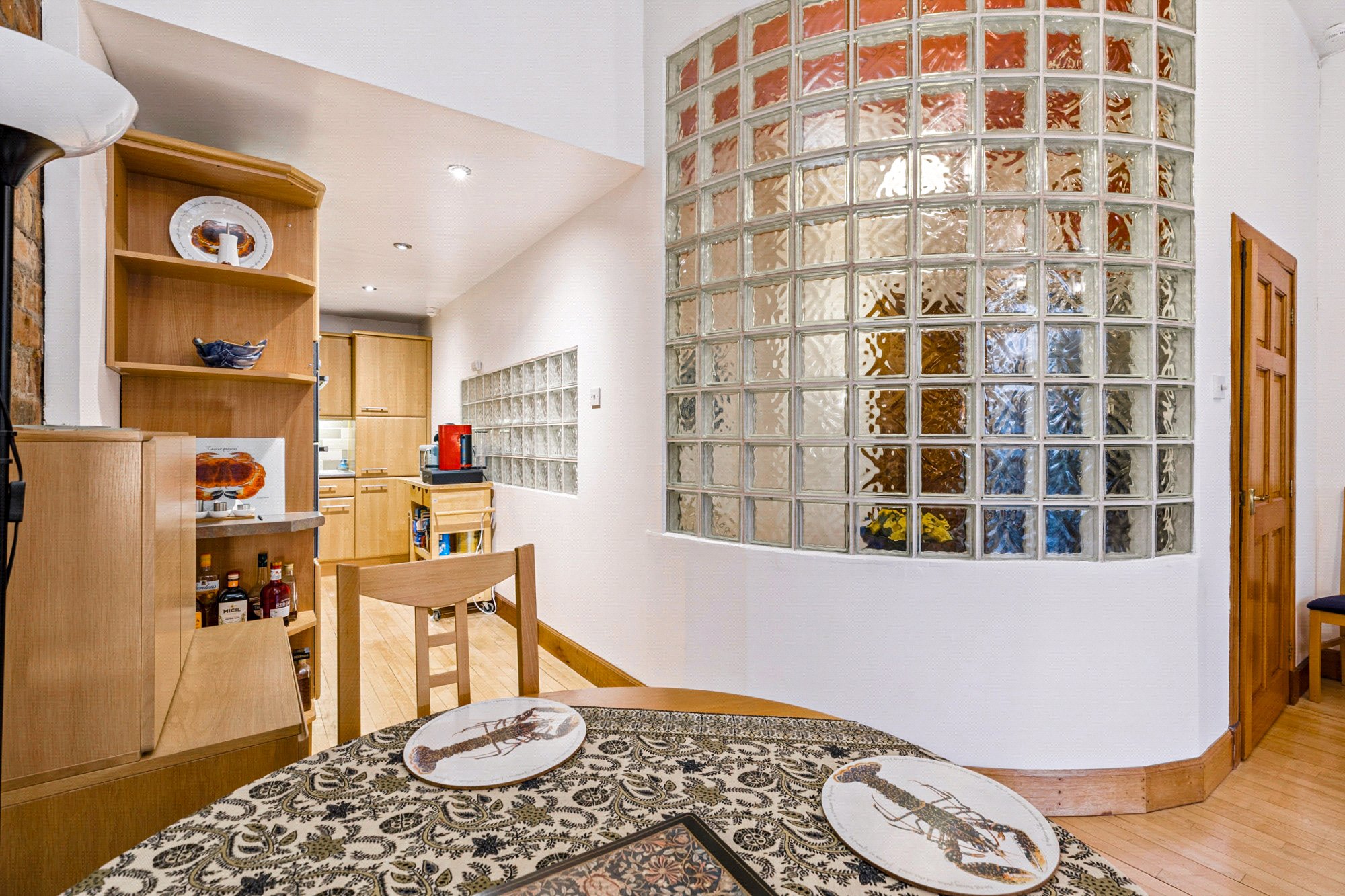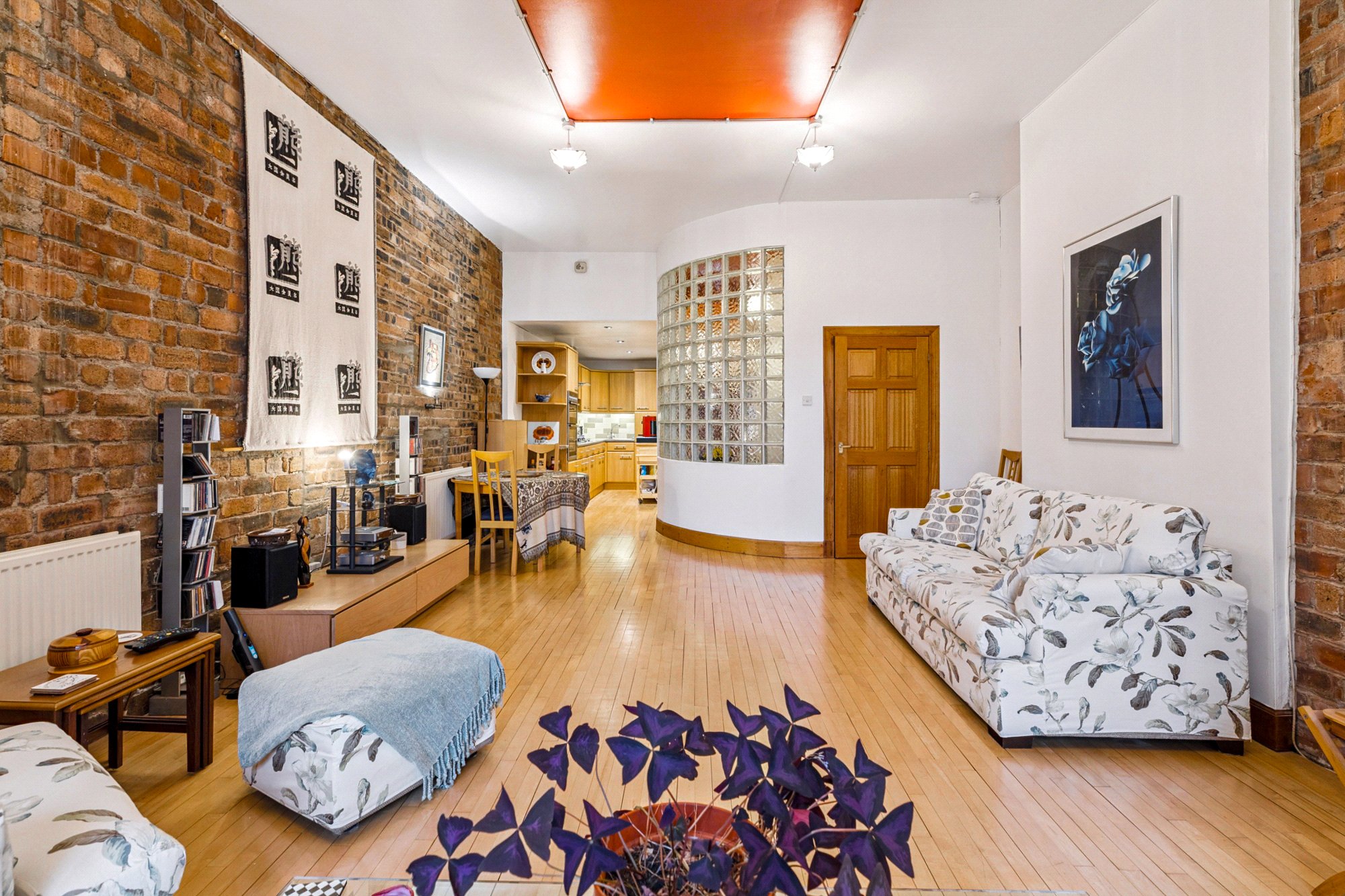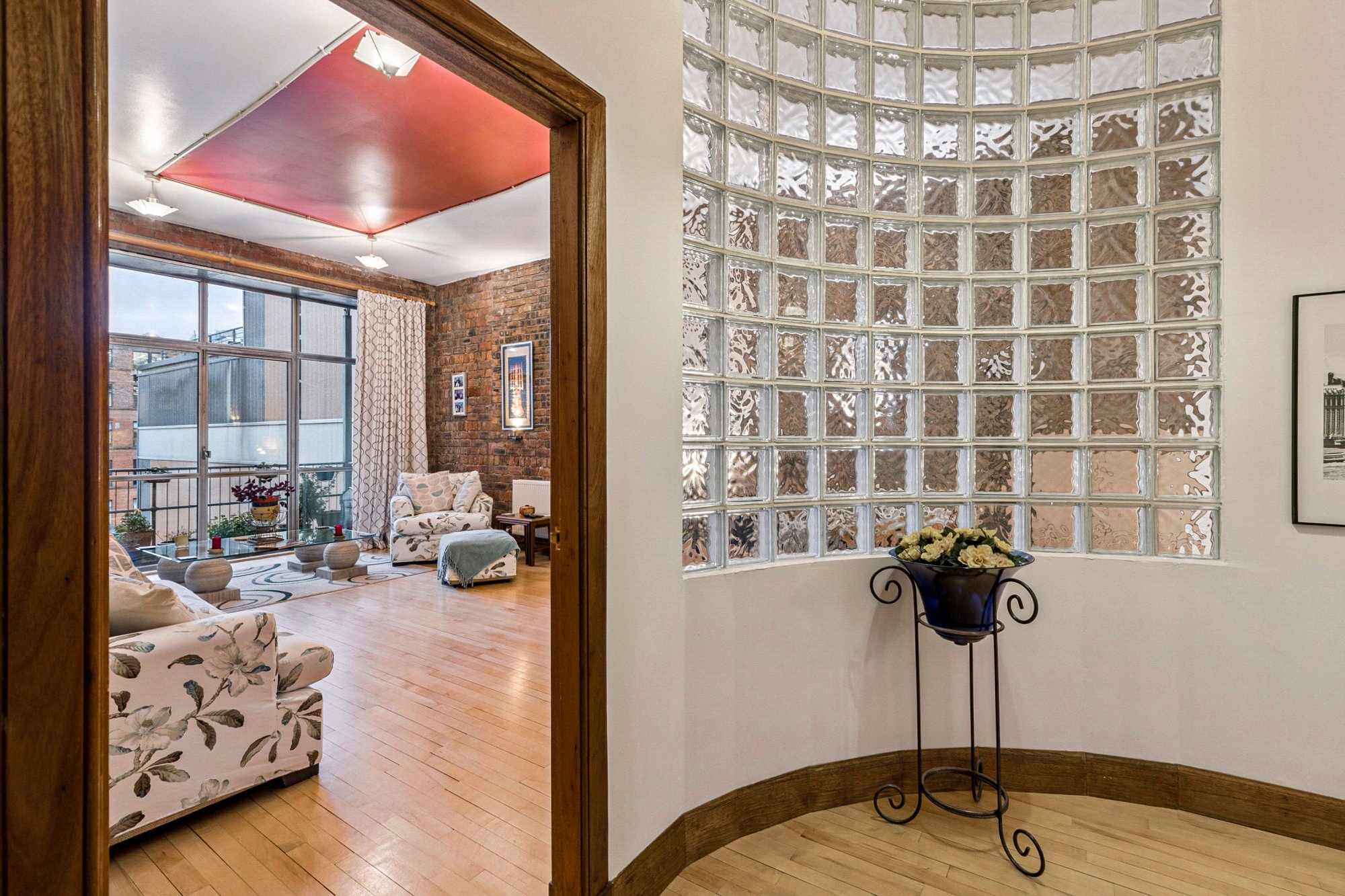 With its New York Loft aesthetic and exposed brick wall interior, this generous two-bedroom apartment extends to over 1000 sq ft has the benefit of a west facing balcony and allocated secure parking, offering true loft living in the heart of Glasgow’s Merchant City. Situated on the 4th floor of the red sandstone wing of The Todd Building, the immaculate interior was designed from its shell by the current owner over 25 years ago and offers well considered accommodation as well and being flooded with natural light from the east and west aspects and clever use of glass brick and curved walls.