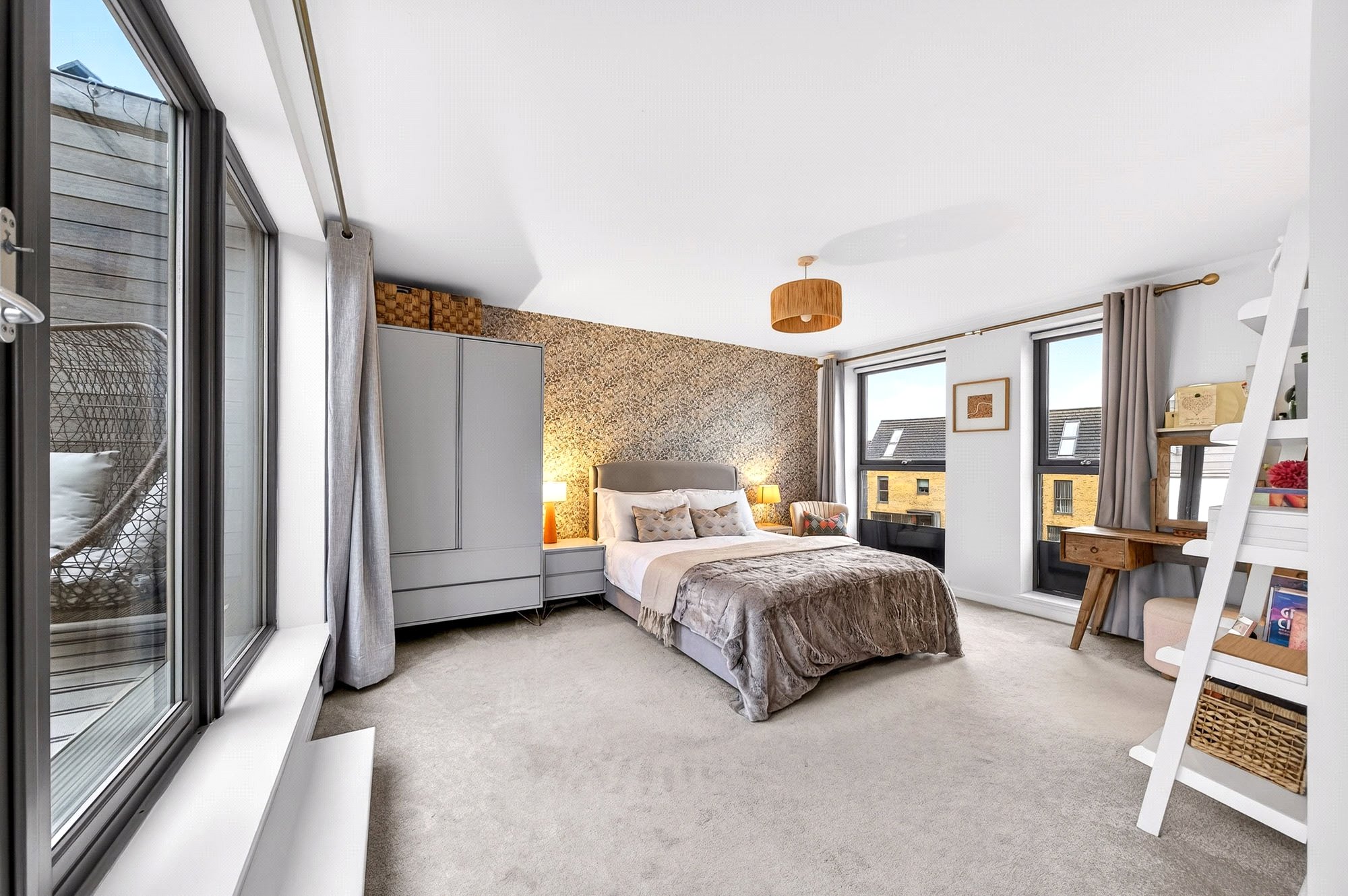 A full wall of floor-to-ceiling glazing and glazed doors along the west elevation opens directly onto the private, partially enclosed roof terrace. From here, there are attractive westward views and a lovely open line of sight along the landscaped soakaway — a tranquil, elevated spot to read, unwind, or enjoy a quiet glass of something as the sun sets, while the household settles below. Haven, escape — call it what you will — the principal bedroom is a rare and luxurious feature, where you can shut the door over and rest.