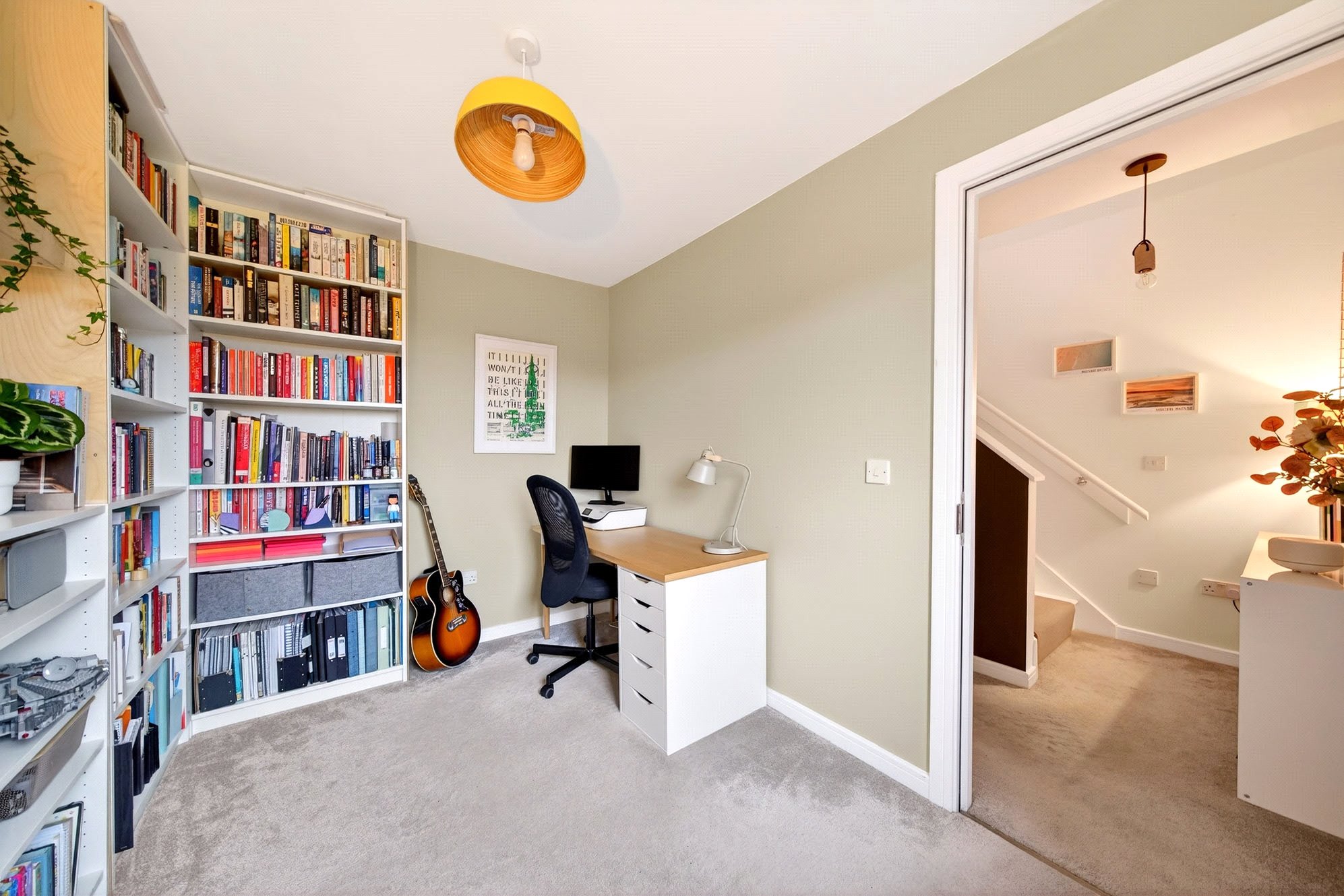 To the front of the property sits a dining-sized kitchen, well equipped with integrated appliances and offering ample space for a central dining table — a sociable, family-friendly room well suited to both everyday living and entertaining. Through a broad sliding opening, the kitchen flows into the main living space to the rear, which enjoys open views over the garden and direct access via patio doors. Thanks to the home’s carefully considered design, these principal living areas have been left open plan by the current owners — creating a spacious, child-friendly environment that works beautifully for modern family life and allows the space to spill effortlessly into the garden during the warmer months. Also located on the ground floor are a fitted utility room and shower room, finished with a contemporary white suite.