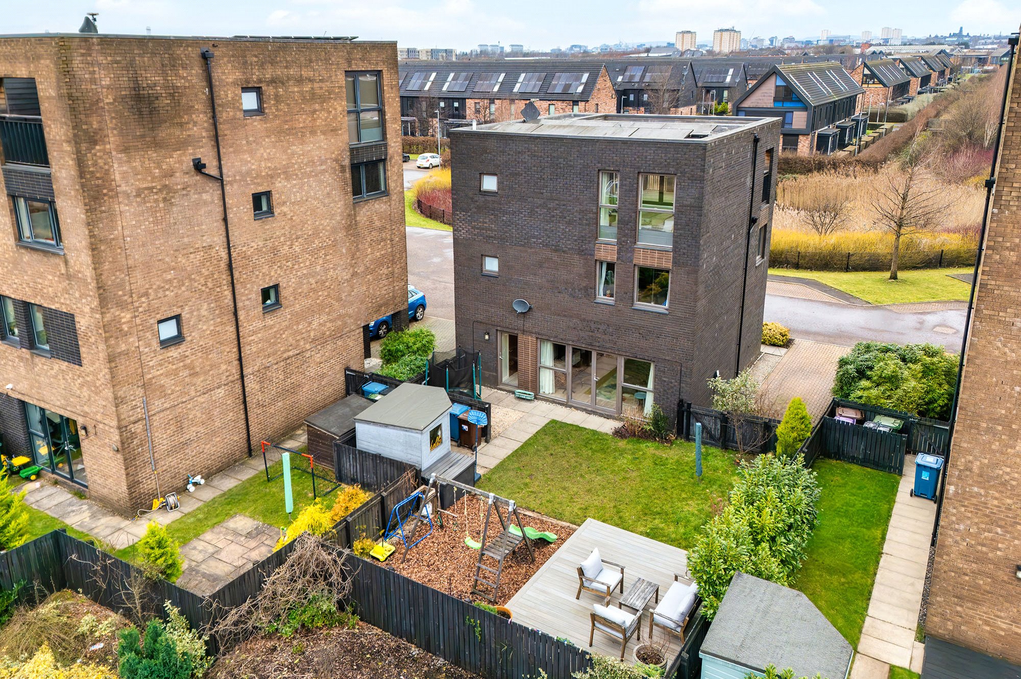Peacefully positioned within a quiet cul-de-sac setting in the highly regarded Athletes’ Village, this instantly impressive and beautifully formed detached contemporary villa offers outstanding, energy-efficient family accommodation arranged over three levels. Originally created to host international athletes during the 2014 Commonwealth Games, the Athletes’ Village has transformed into one of Scotland’s most forward-thinking residential neighbourhoods — a place where intelligent urban design, architectural ambition and landscaped green space combine to exceptional effect.