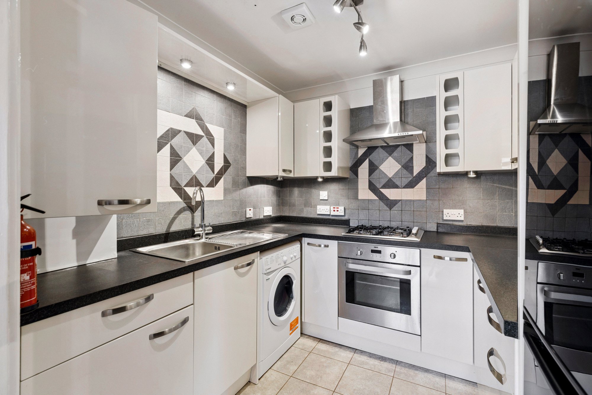 - Fitted kitchen with dark worktop surfaces complemented by white gloss cabinetry and geometric tiled splashback. With integrated microwave, gas hob and freestanding appliances.