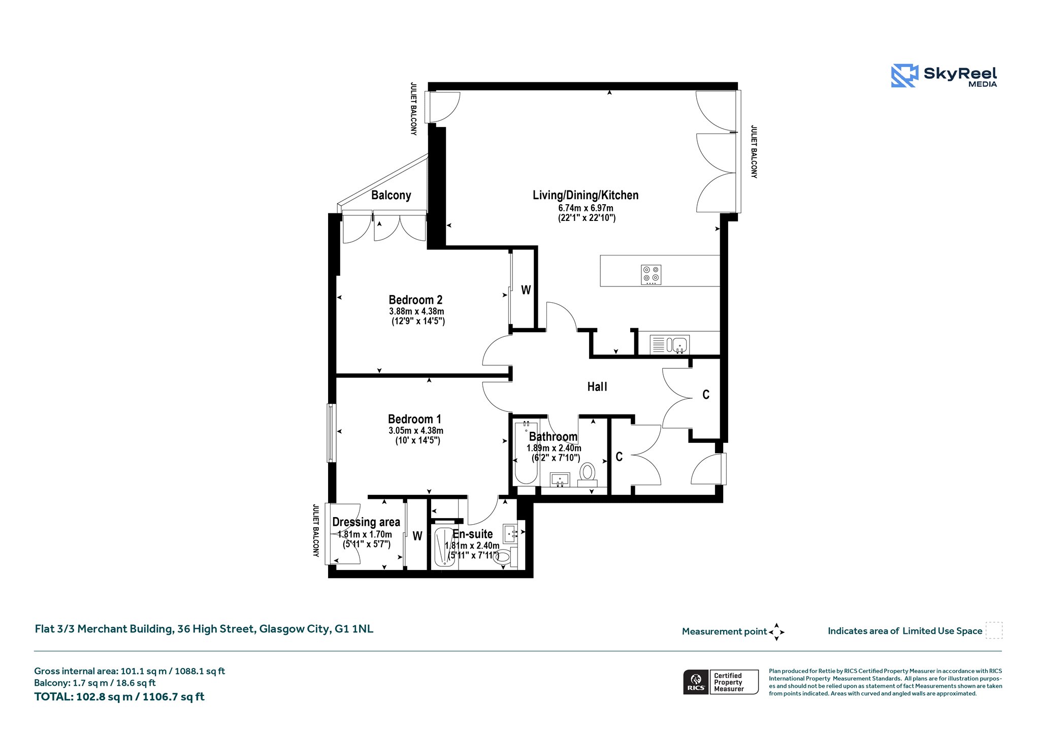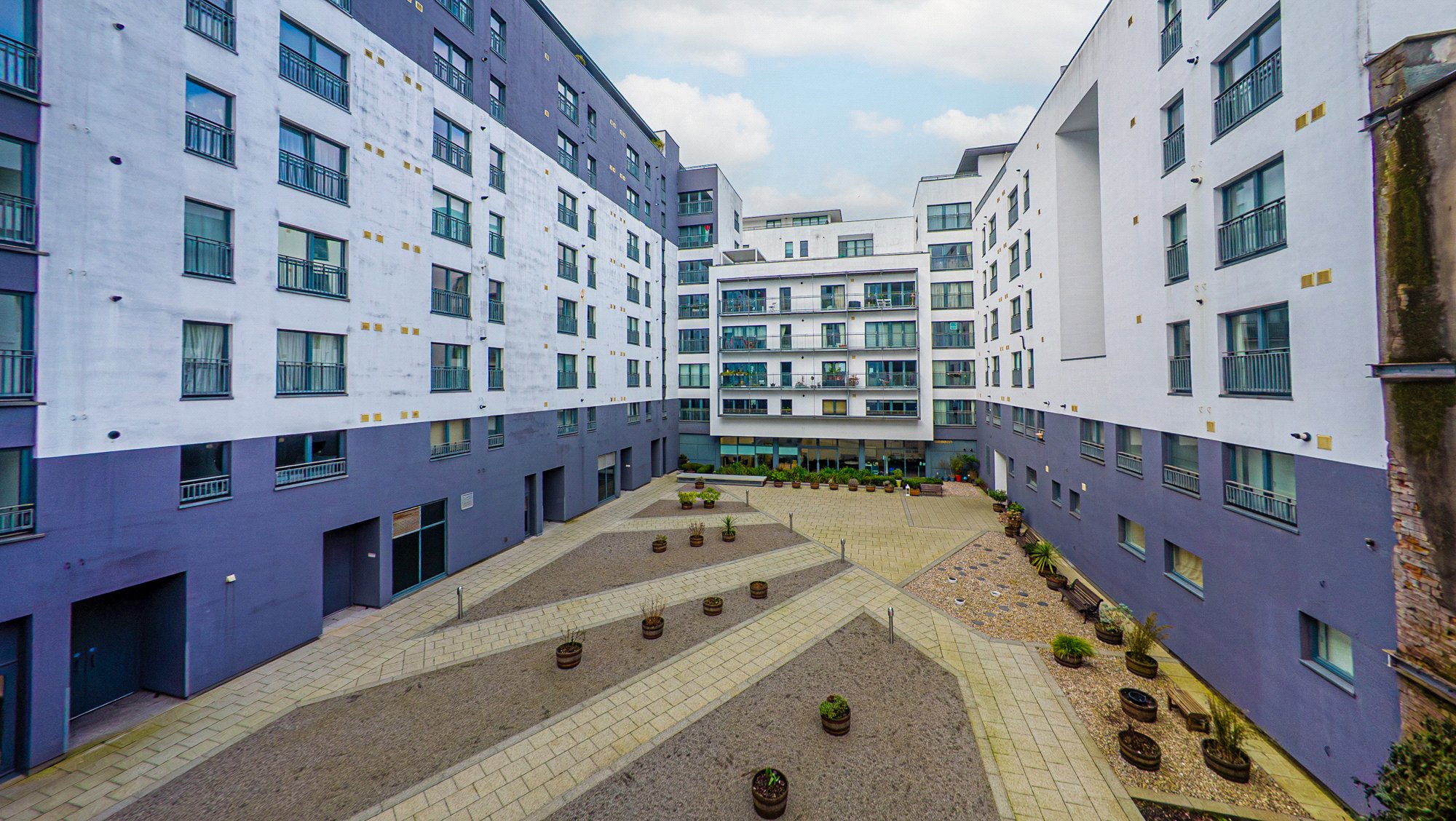Exceptionally spacious, this modern two-bedroom, two-bathroom apartment is situated on the third floor of the prominent and popular Merchant Building completed in 2007. Spanning over 1088 square feet, and with a balcony, the property further benefits from an allocated underground parking space. Offering open plan loft style living with a large feature lounge/dining room, extending to over 22 ft, it has open aspects from large windows and patio style doors to a Paris style balcony facing south into the buildings recently upgraded communal courtyard gardens. The apartment is exceptionally well placed within an incredibly convenient location on the edge of the Merchant City and is generously proportioned with the interior being well maintained.