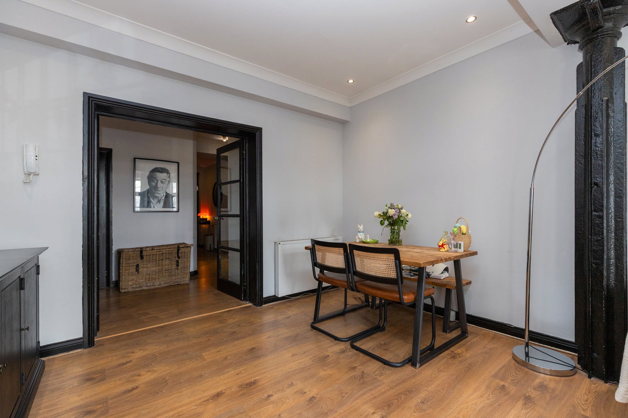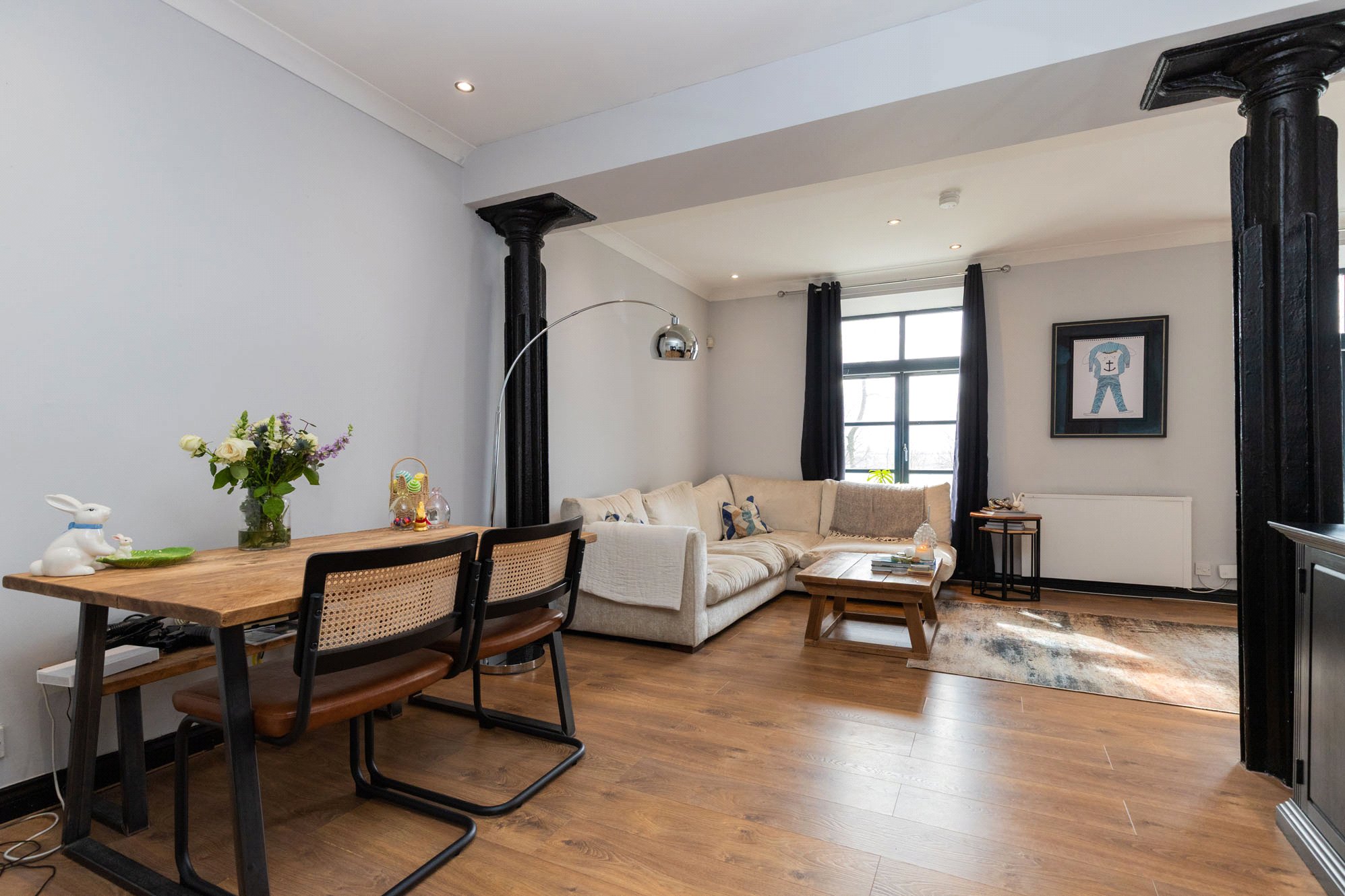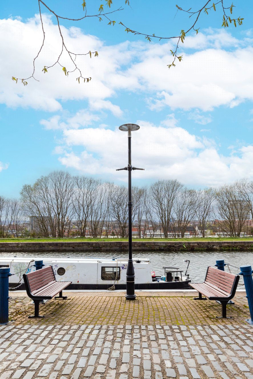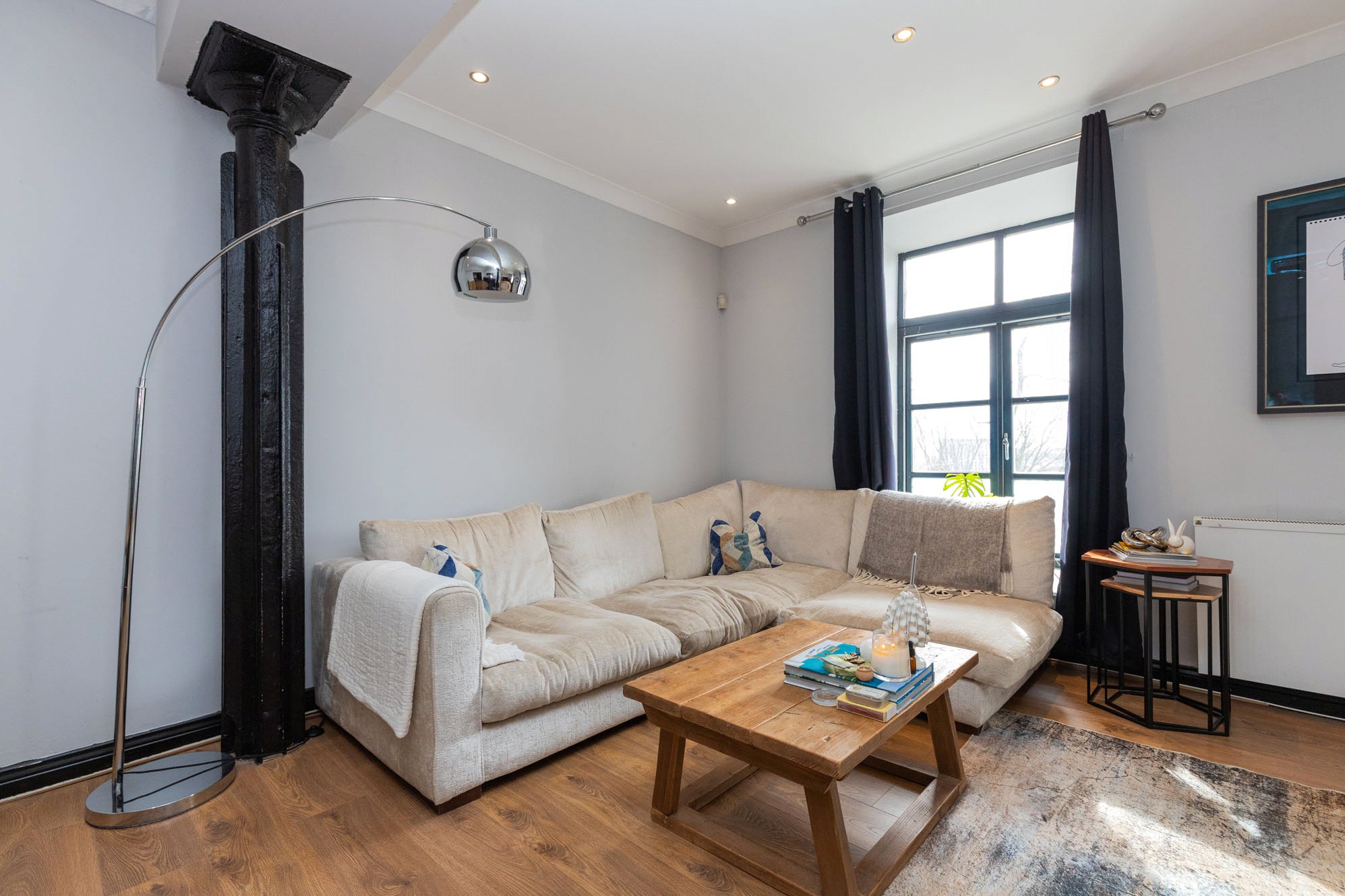 Accessed via security barrier to parking and secure entry to communal hallway, three stairs lead to the landing where you will find the flat almost immediately on the left-hand side. The entrance door leads to a vestibule providing cloakroom storage and access to the welcoming hallway. Glass panelled doors lead into the main living space which has dedicated dining area, a large living space spanning 20 ft, two recessed windows facing west over the cobbled street towards the Canal and beyond, flooding the room with natural light and there is access to the re-fitted and modern kitchen fitted with well-considered storage and integrated appliances. The l-shaped hallway has two cupboards, notable features include the main shower room, having recently been beautifully re-fitted in Victorian Revival Style with walk in shower, sink inset in marble vanity unit and striking green tiling, there are two generous double bedrooms both with fitted wardrobes and one with en suite bathroom. Throughout the apartment there are feature structural columns, stylish black woodwork and the property has double glazing and electric heating. The development offers an urban lifestyle with excellent transport links and viewing is highly recommended.