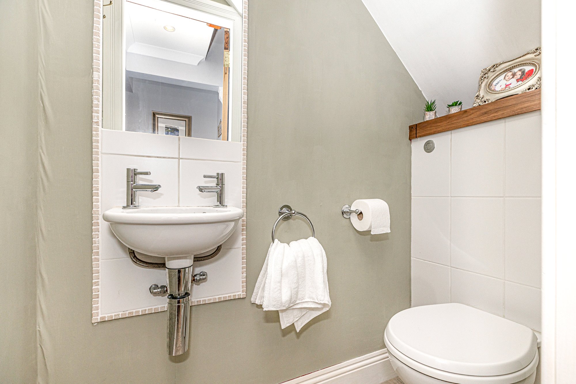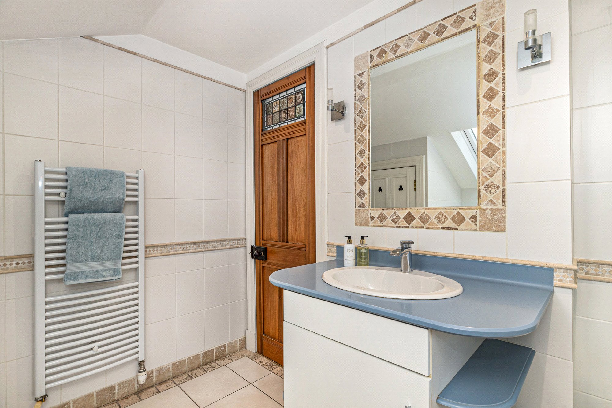 • Family bathroom with four piece white suite including a separate shower cubicle window to side, Velux to the rear and cupboard housing the central heating boiler.