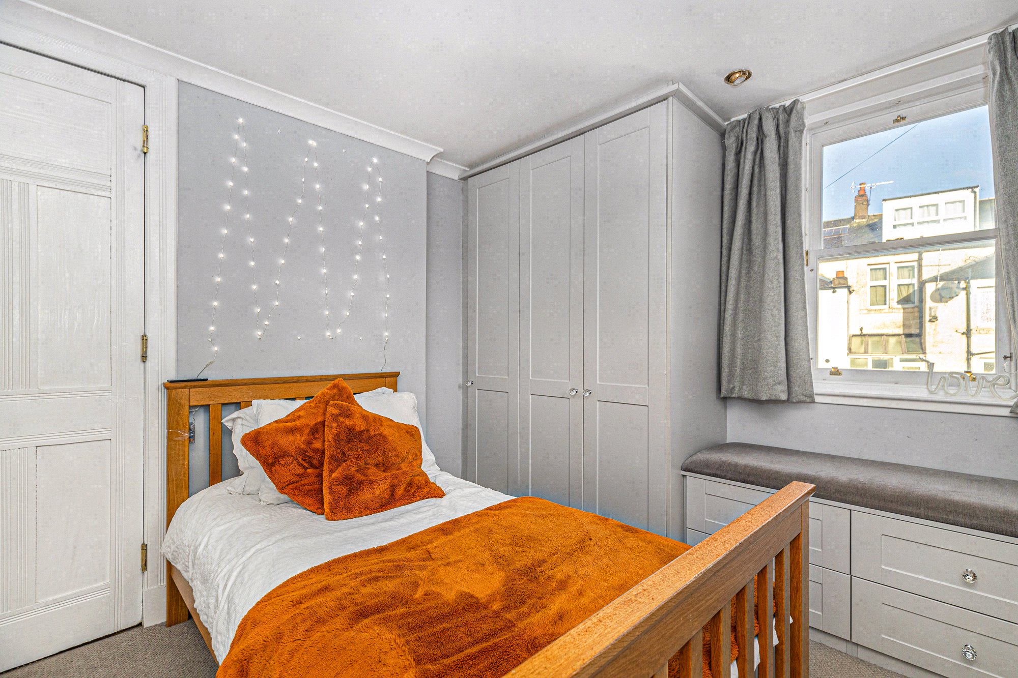 • Bedroom one (principal) with three section window to the front and an additional window to the side. Built-in wardrobes and drawers.