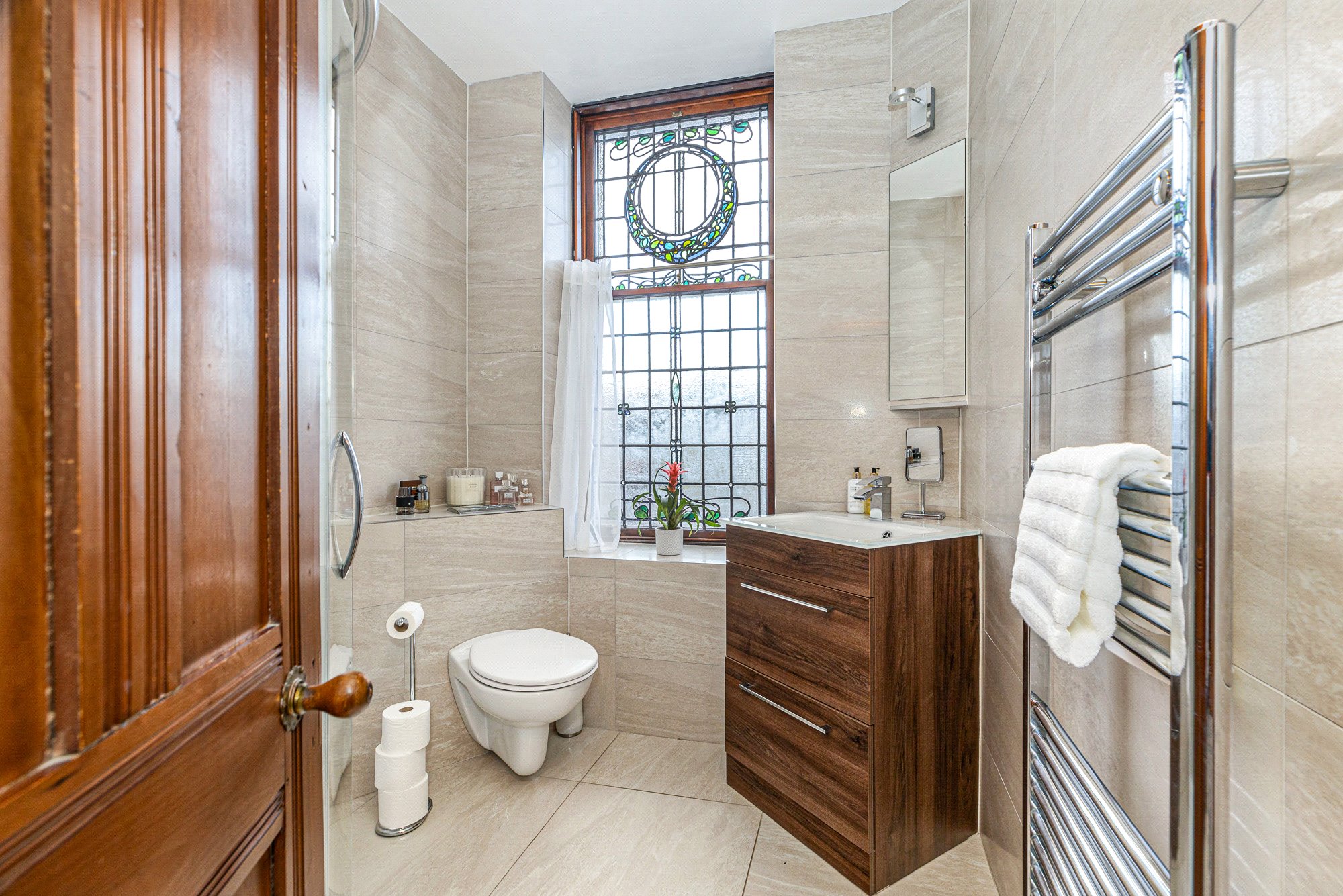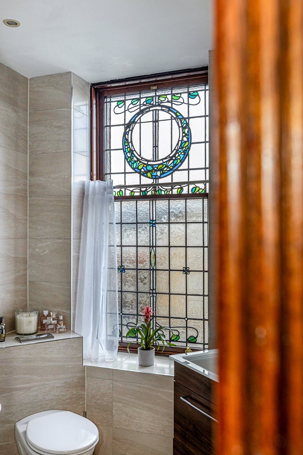 • Stylish en suite shower room with three piece white suite and stained/leaded glass window to the front.