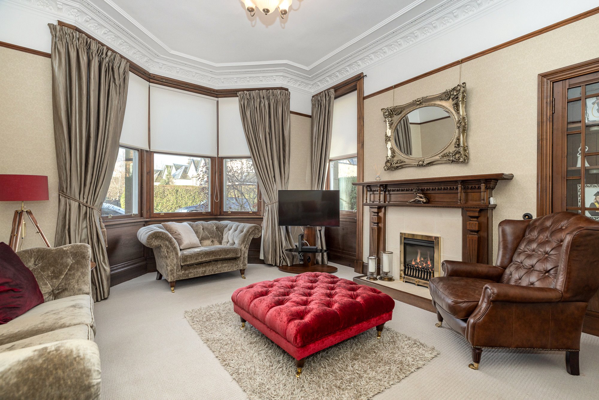 • Main lounge with three section bay window to the front and an additional window to the side. Focal point fireplace with living flame gas fire. Ornate cornicing.