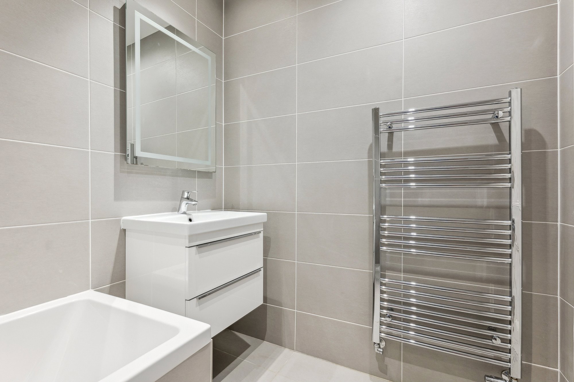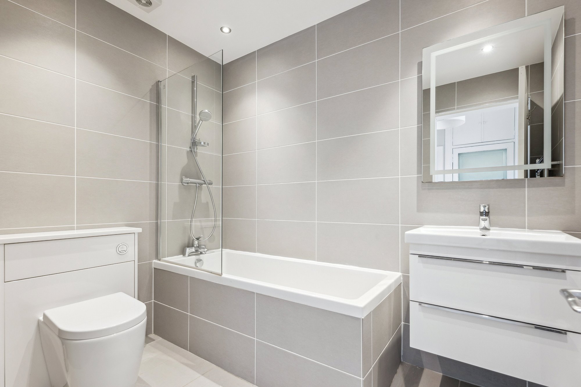 - Contemporary three-piece bathroom comprising bath, over bath shower, toilet and wash hand basin