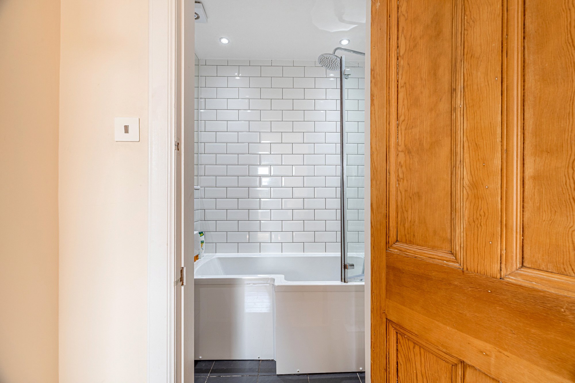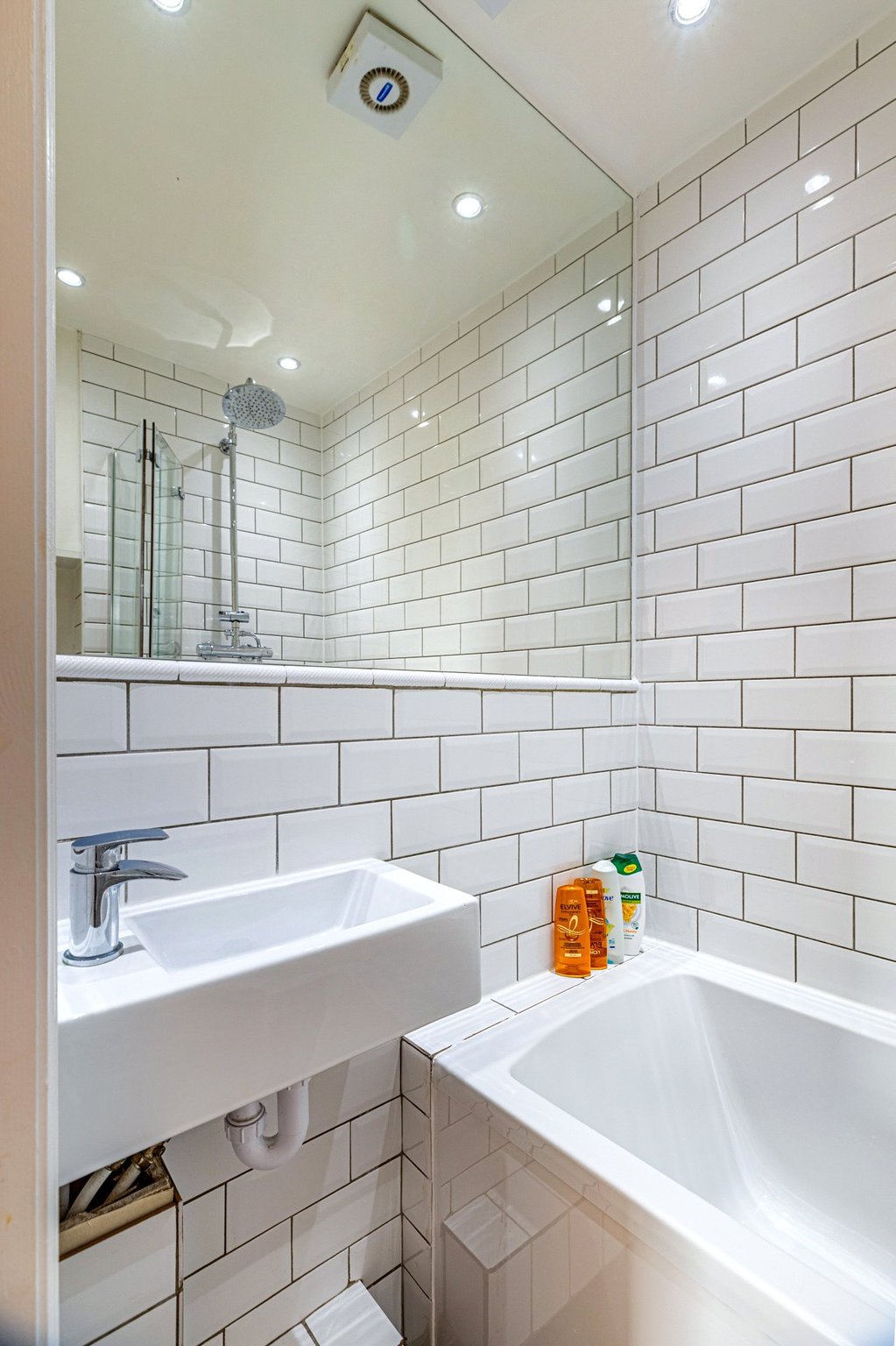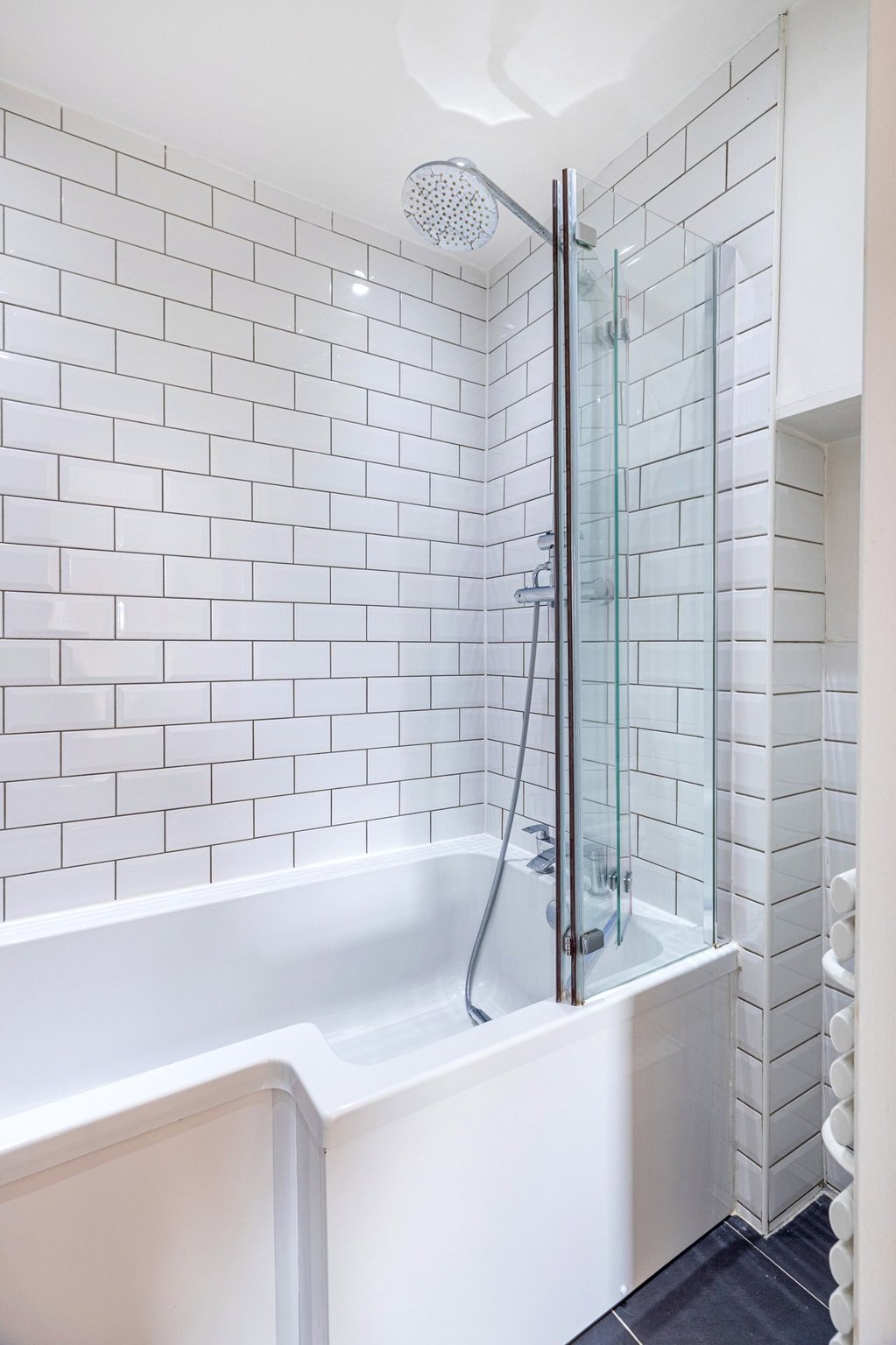 - En-suite bathroom with white suite, shower over bath, and flatform subway tiling