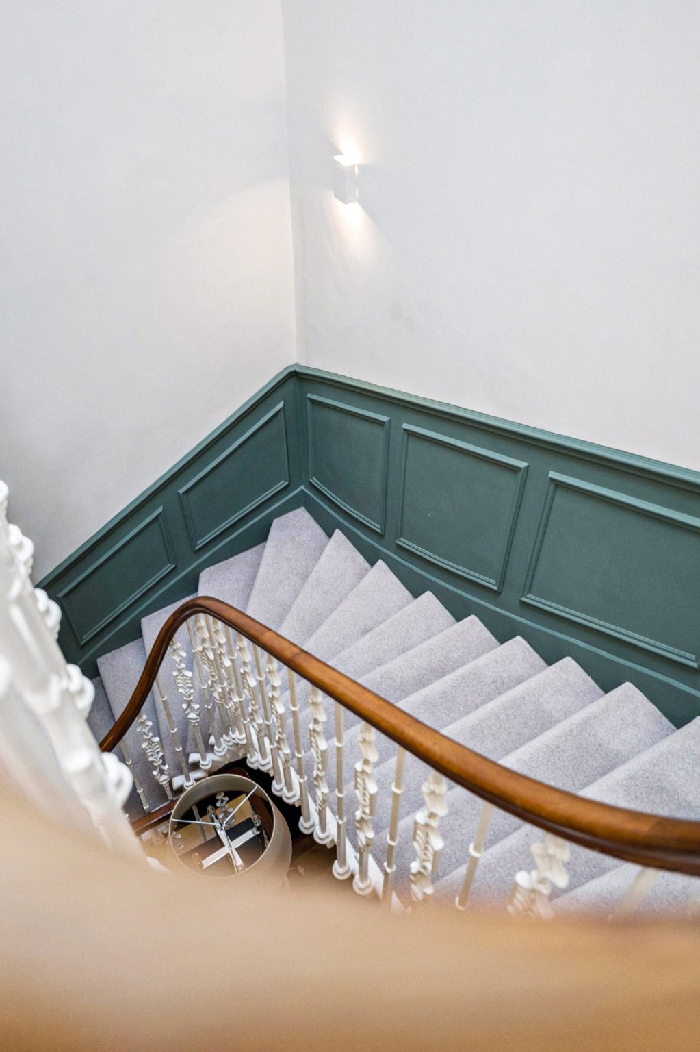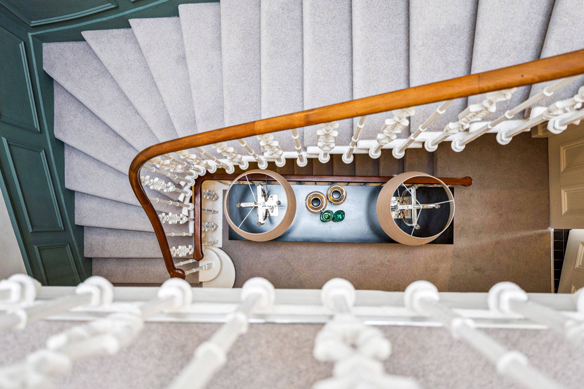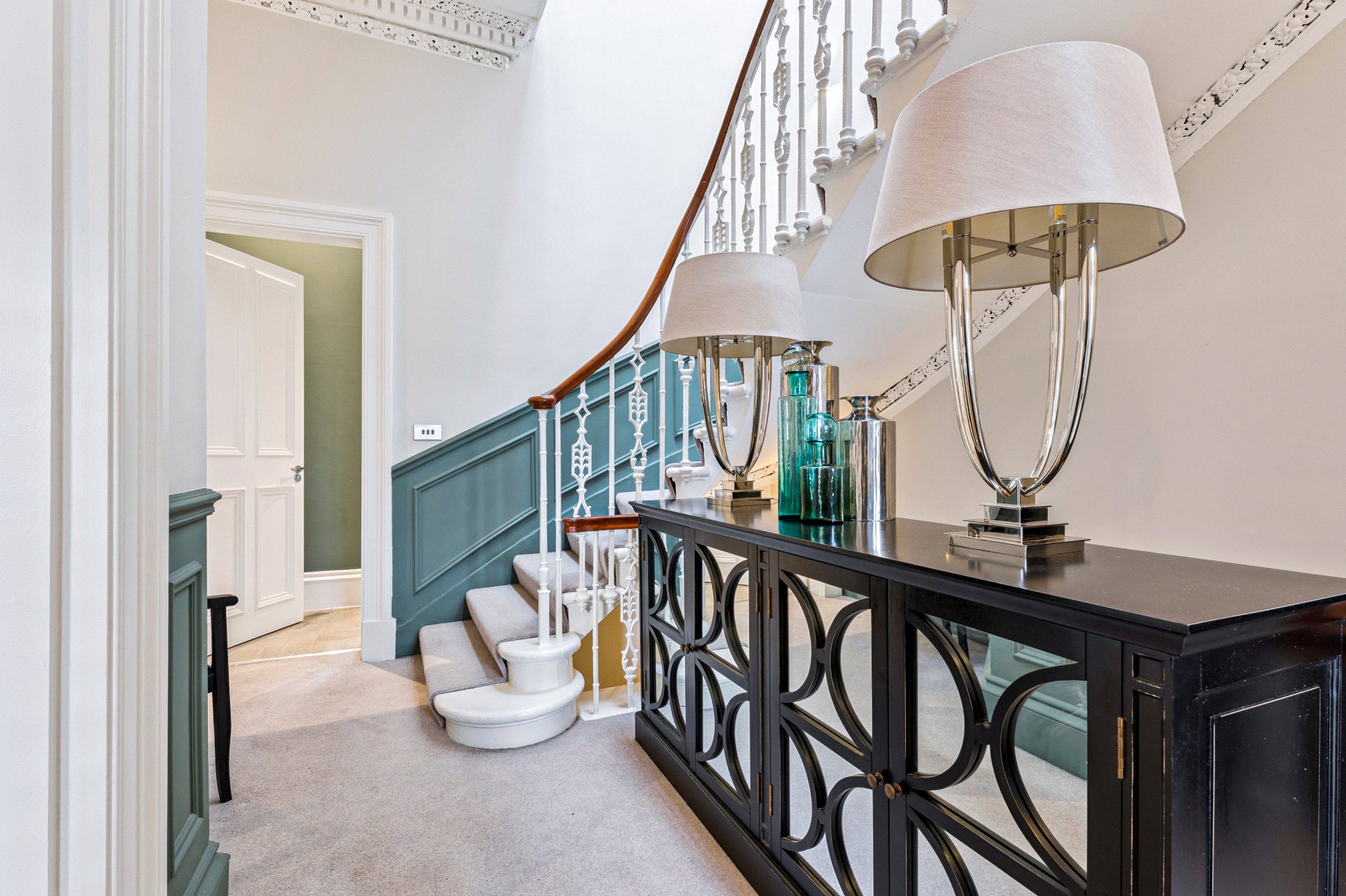Upon arrival, a few wide steps with decorative wrought-iron railings and stone balustrade lead to the main door. The entrance hallway immediately sets the tone, featuring an original statue enclave and double doors leading to the main internal hall, with a sweeping staircase linking both the first floor and lower garden level.