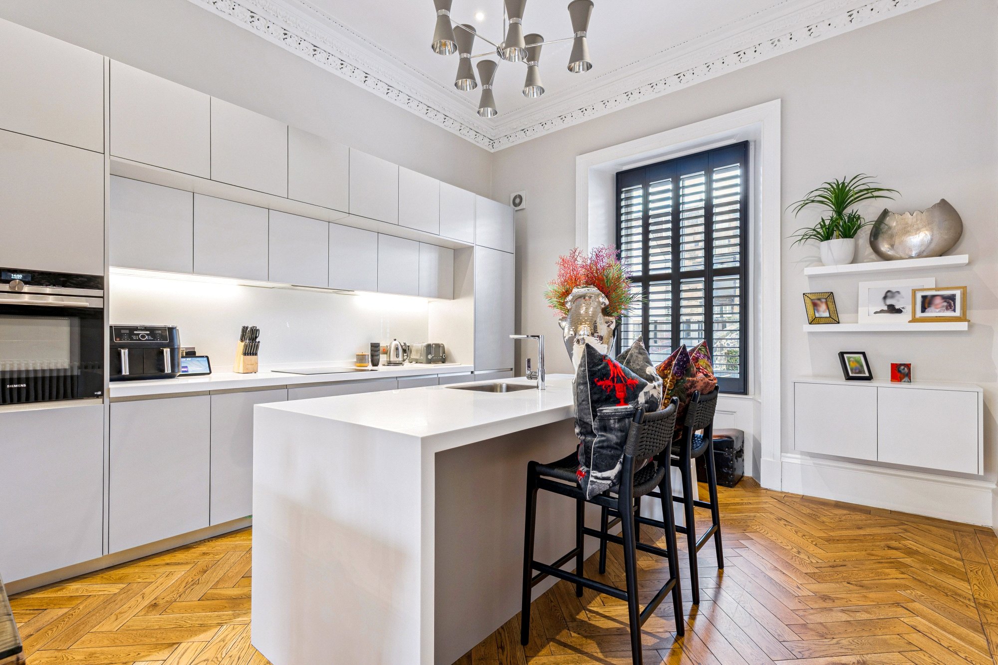 The accommodation begins with an impressive front lounge and dining room, extending over 27 feet in length and featuring ornate cornicing, two full-height sash windows with original shutters, and beautiful herringbone oak flooring. The open-plan kitchen continues the herringbone flooring and provides a stunning contemporary focal point — complete with a central waterfall island, bespoke cabinetry, and integrated Siemens appliances. A utility room adjoins the kitchen, providing additional storage and workspace. From the hallway, there is access to a luxury shower room fitted to a superb standard.
