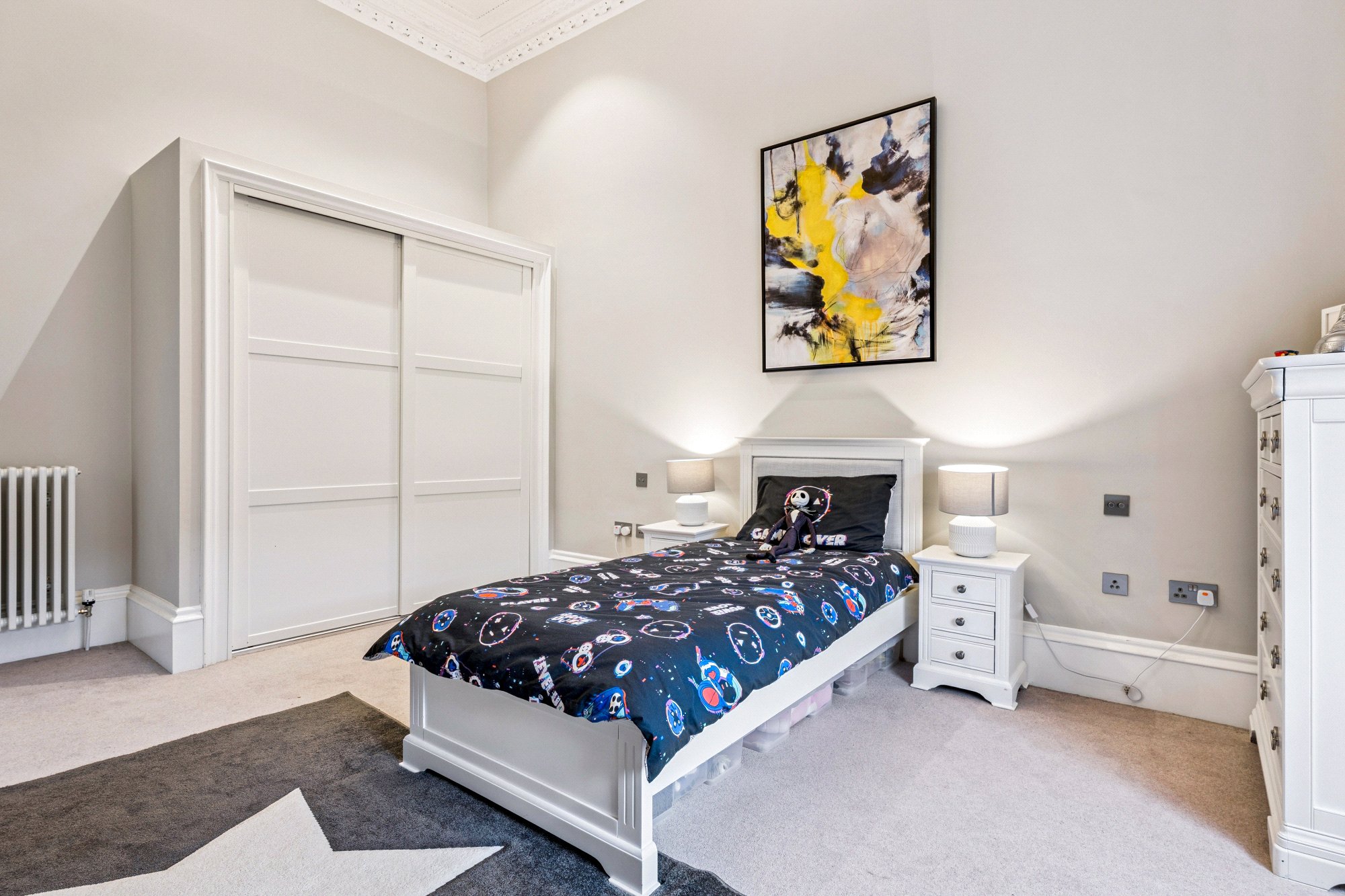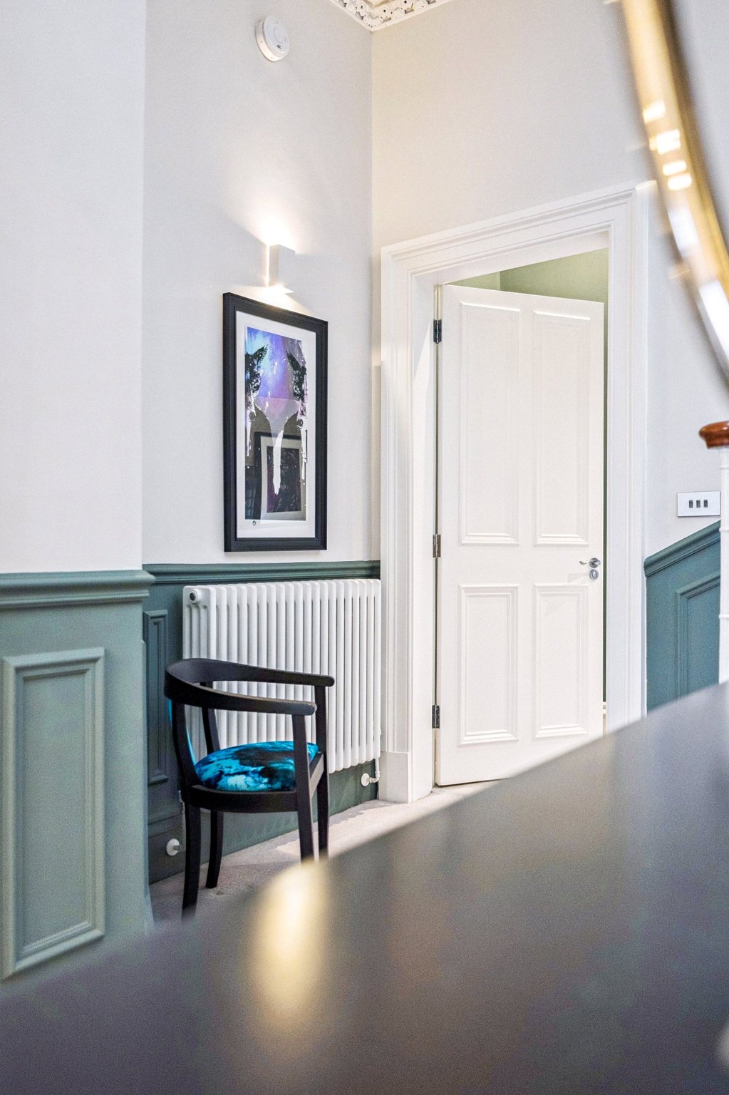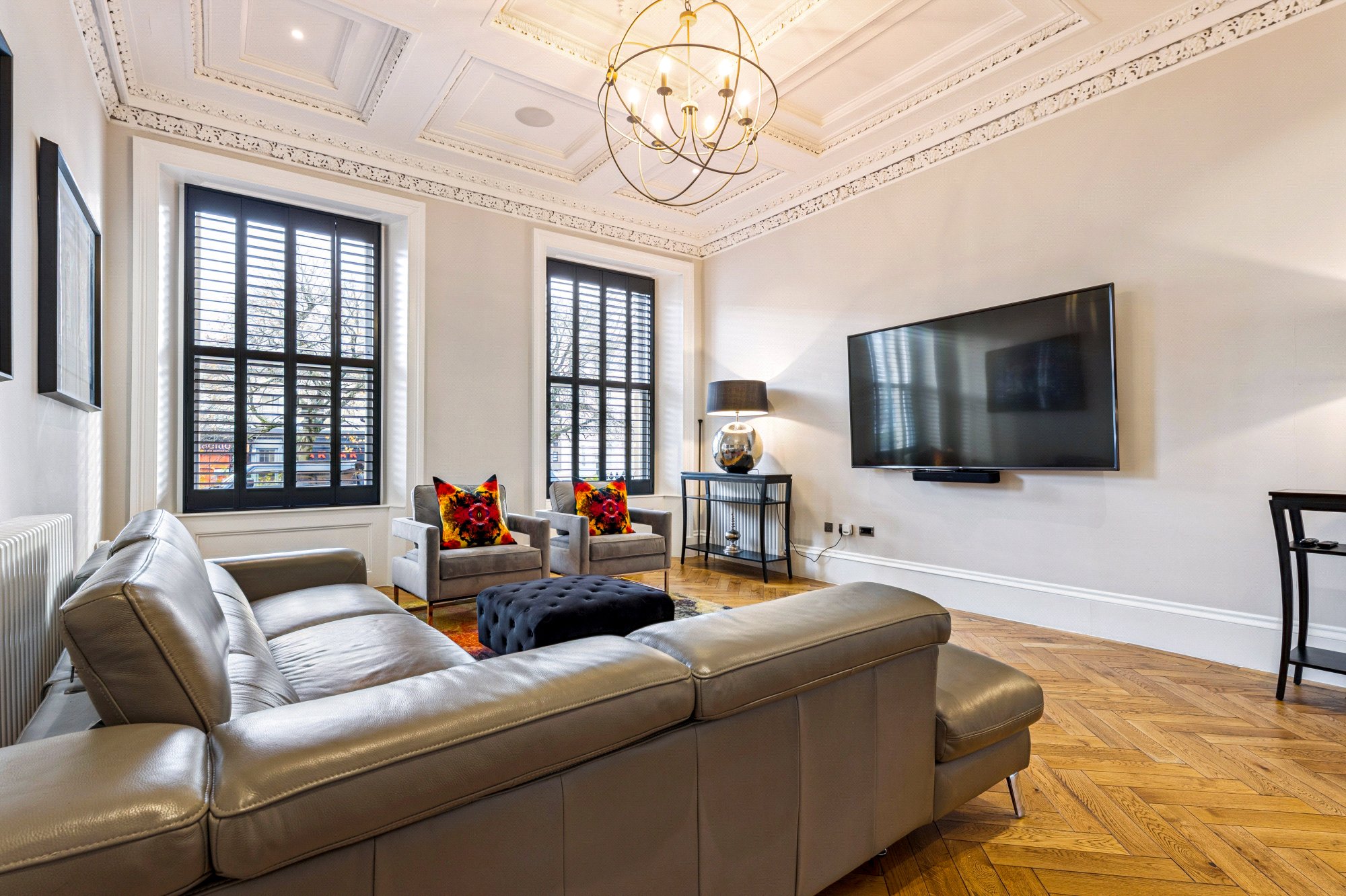 - Restored original features – ornate cornicing, ceiling roses, sash windows, shutters