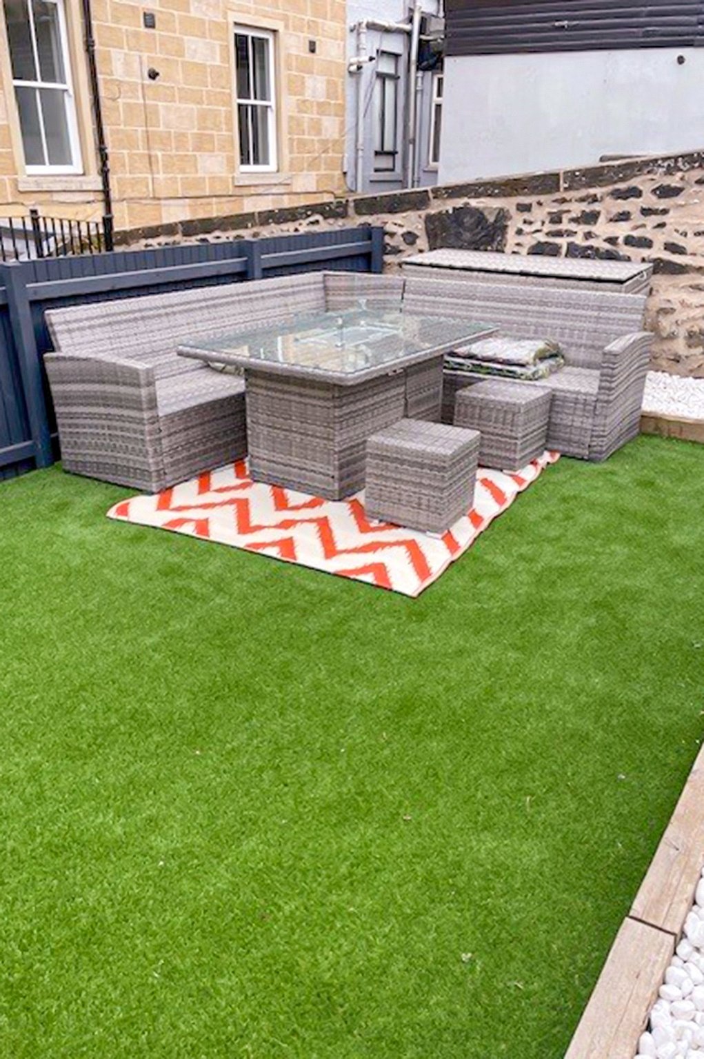 From the ground floor, stairs descend to a lower hallway which provides a large storage cupboard and direct access to the private, astro-turfed rear terrace and secure, gated car parking area.