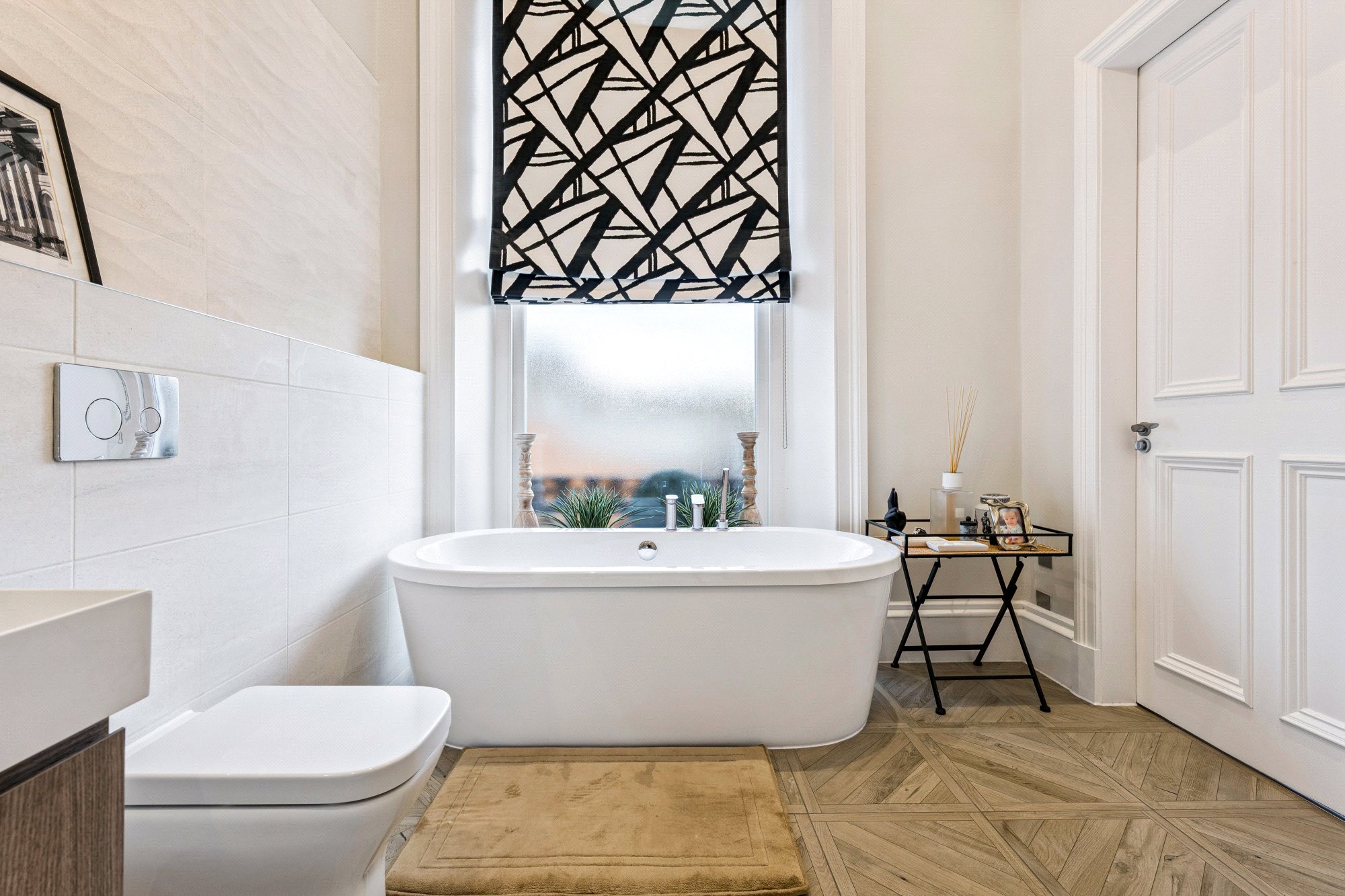 A feature glass cupola above the stairwell fills the first-floor landing with natural light. The principal bedroom suite extends to approximately 22 feet and features fitted wardrobes, plush carpeted flooring, and twin Juliet balconies overlooking the treetops of Newton Place. The Jack and Jill main bathroom, accessed from both the principal bedroom and hallway, offers a truly indulgent space with a freestanding bath, walk-in shower, wash hand basin, and toilet — all finished with Porcelanosa fittings. Two further double bedrooms, both with fitted wardrobes and sash windows overlooking the rear garden, complete the first-floor accommodation.