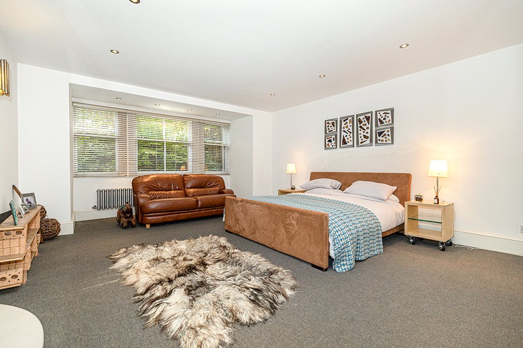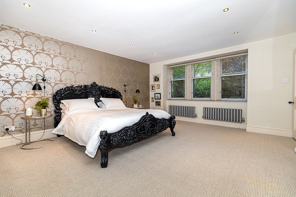 - Bedroom one with three section window to the rear and walk-in storage in the corner of the room.
