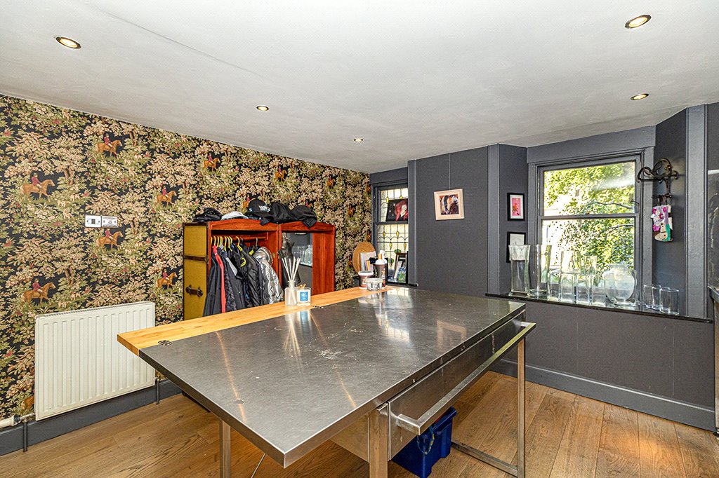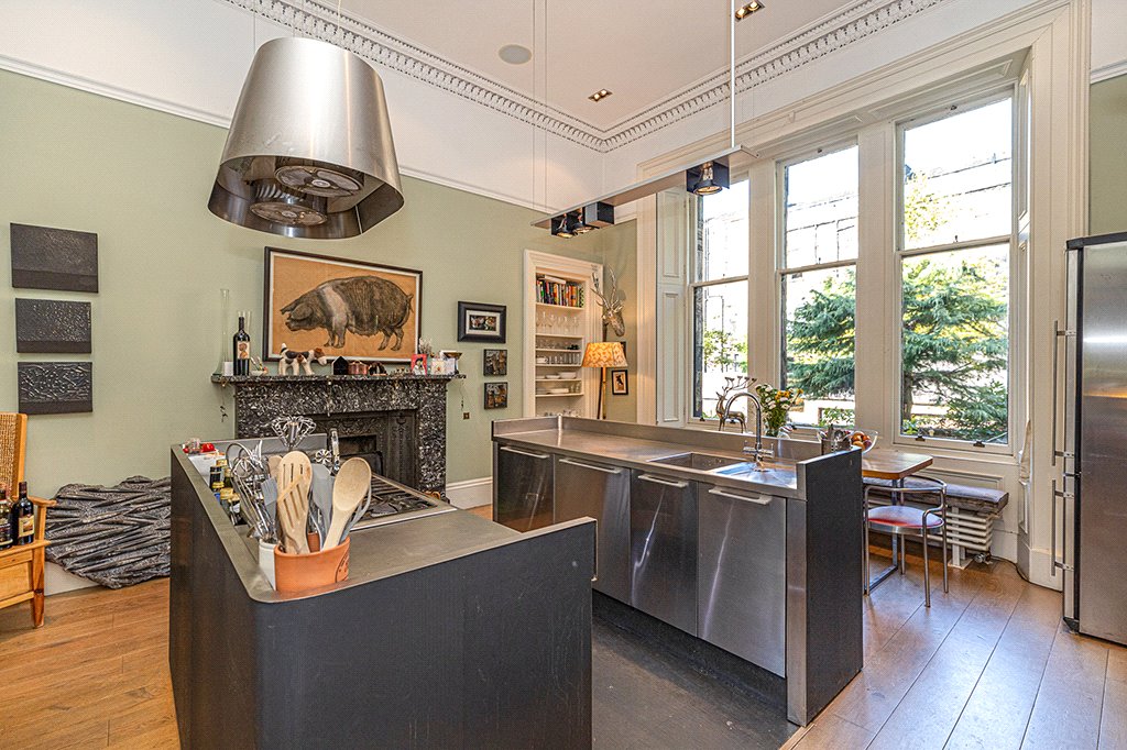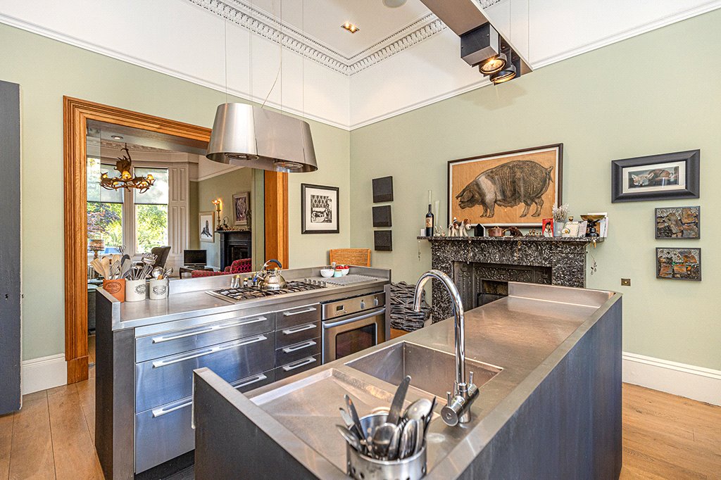 - The back wall of the lounge has been cleverly opened and the glass doors leading into the kitchen which was originally a public room and is therefore spacious and full of features. Amazing central kitchen units with stainless steel finishes. Built in gas hob with oven below and extractor above, built-in fridge, open shelving, additional wooden storage cupboards, wooden flooring, focal point fireplace, ornate cornicing and three section window to the rear.