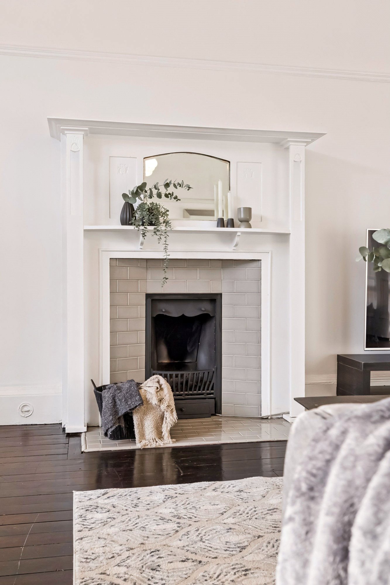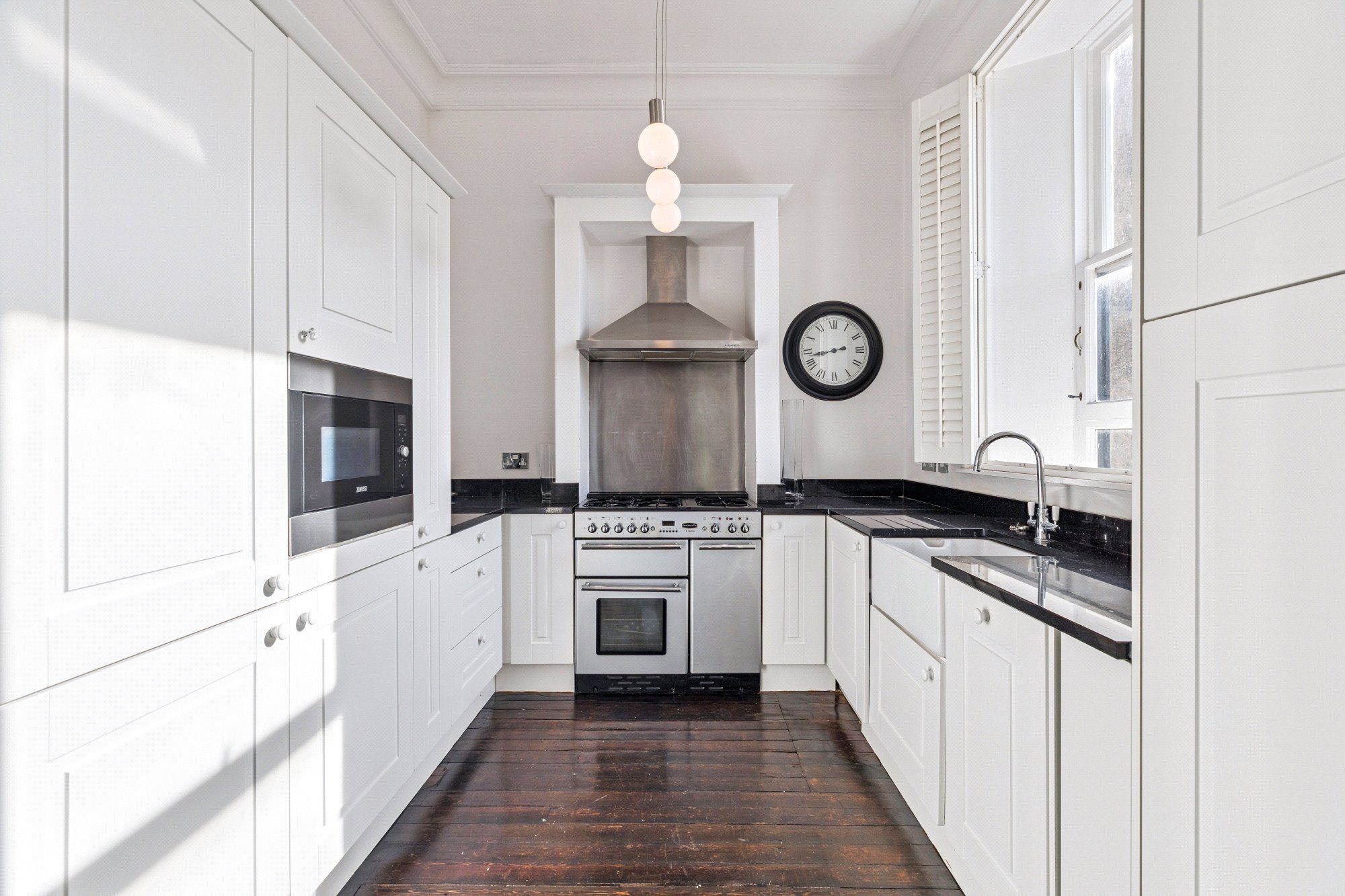 Generous bright rooms flow seamlessly, creating an ideal haven for everyday living. The main lounge is truly the centre of this home, anchored by a classic focal fireplace and framed by double sash and case windows with plantation shutters that pull in light. From here, the home opens into a social dining zone and a well-considered U-shaped kitchen that has been thoughtfully arranged; solid worktops, integrated appliances, deep ceramic sink and a layout that keeps everything within convenient reach. Original fireplaces and timber floors add texture, balanced by crisp contemporary finishes.