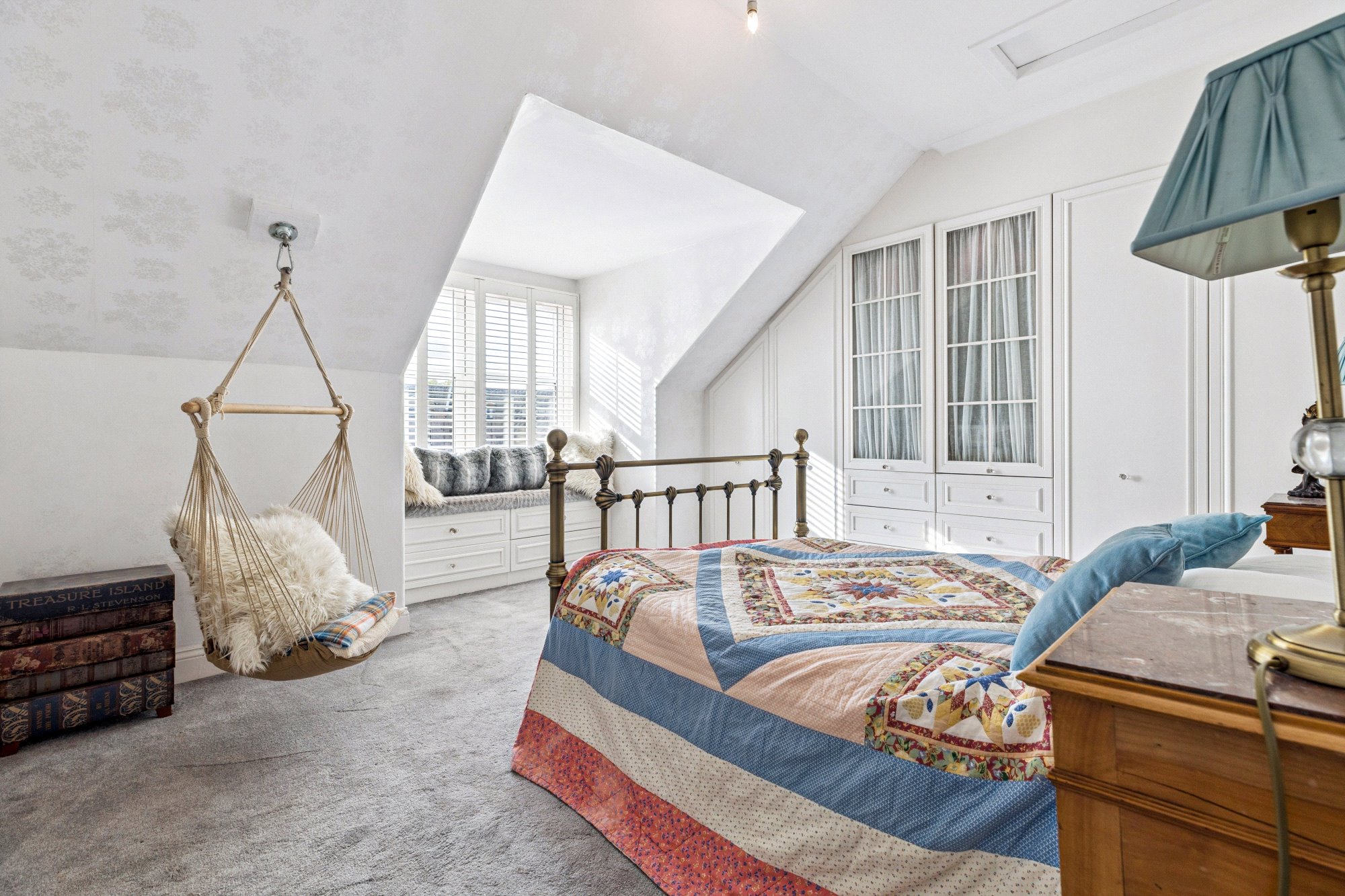 - Principal (main) bedroom of exceptional proportions with focal fireplace, large walk in cupboard and three broad front facing windows with gorgeous leafy outlook.