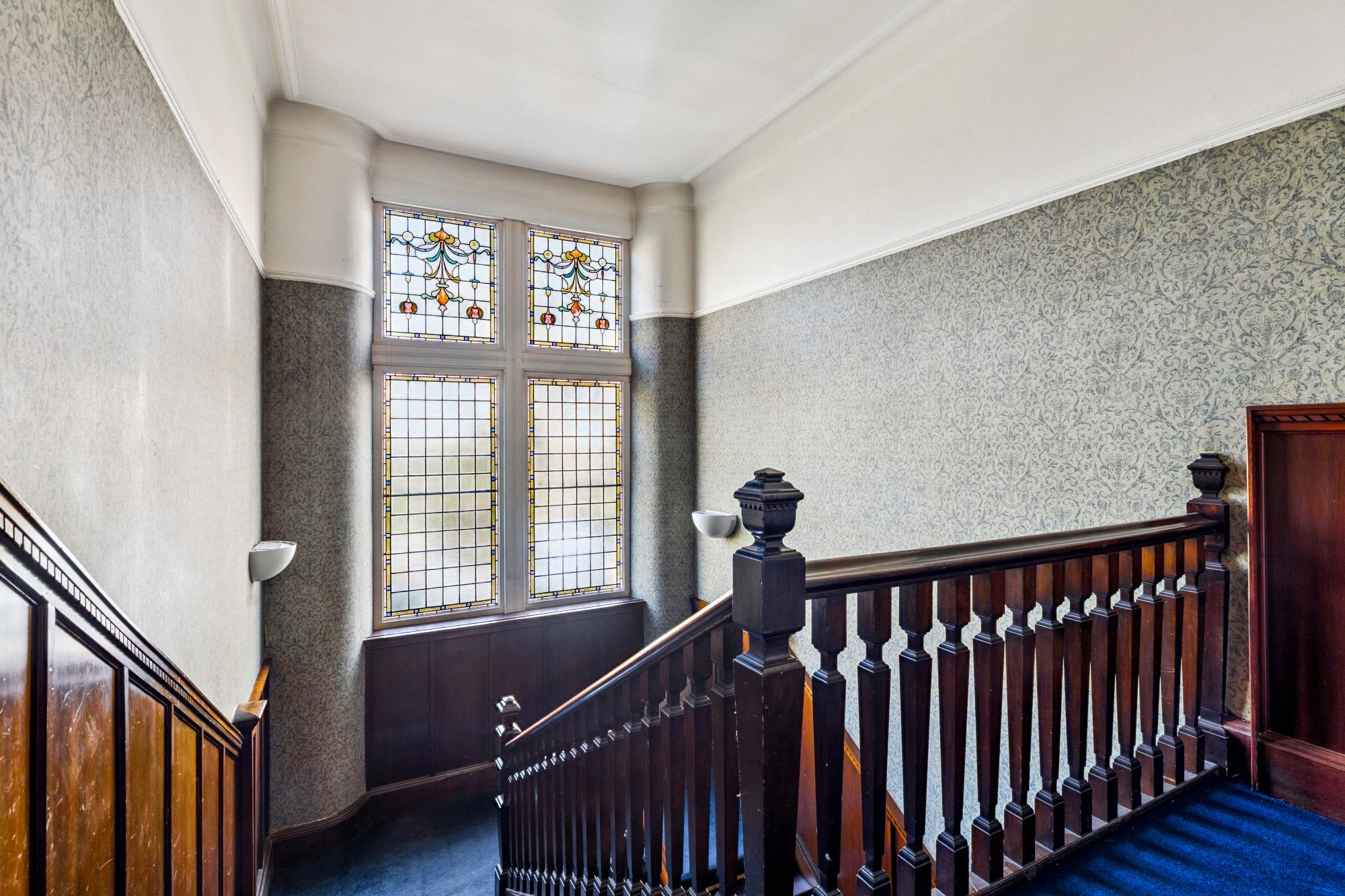 - Stairway with traditional timber banister, brightened by large skylight and leading to upper landing.