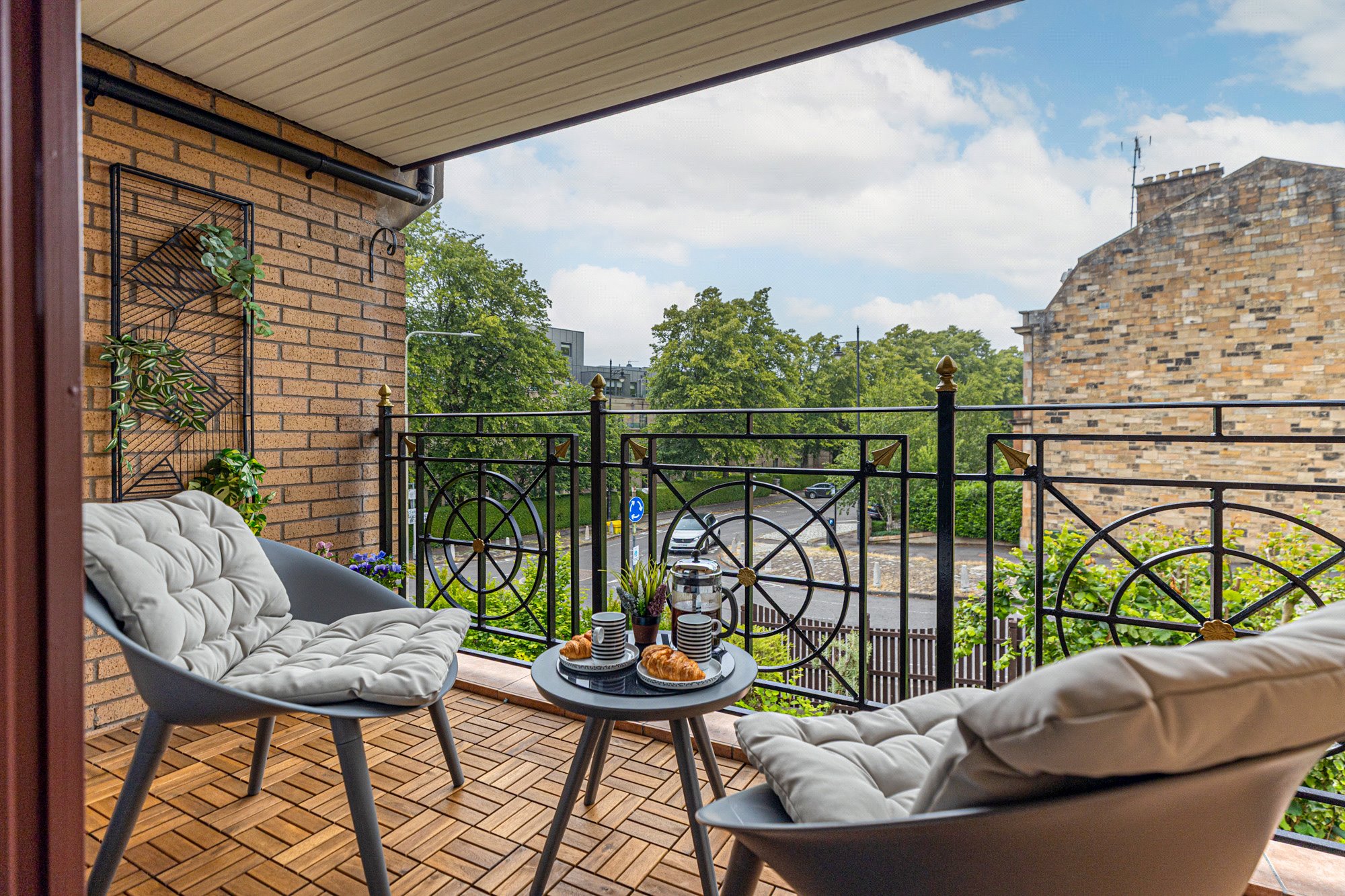 om modern 2nd floor apartment offers extremely comfortable, spacious accommodation and has the added advantages of a charming private balcony, private garage, lift access to all levels and additional residents’ parking – all within a leafy, peaceful enclave in the Hughenden district of the West End of Glasgow.