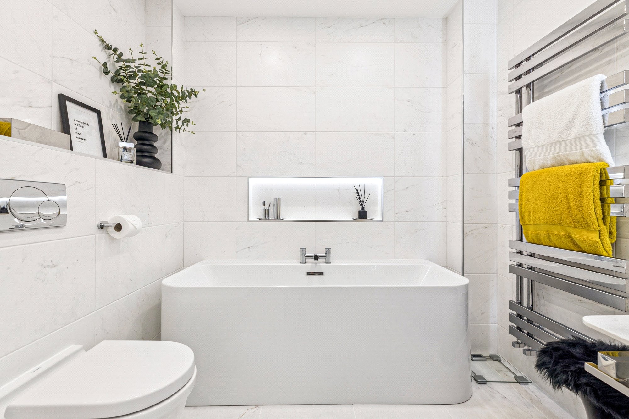 - suite shower room with stylish fixtures from Porcelanosa & Duravit including walk in shower & separate bath.