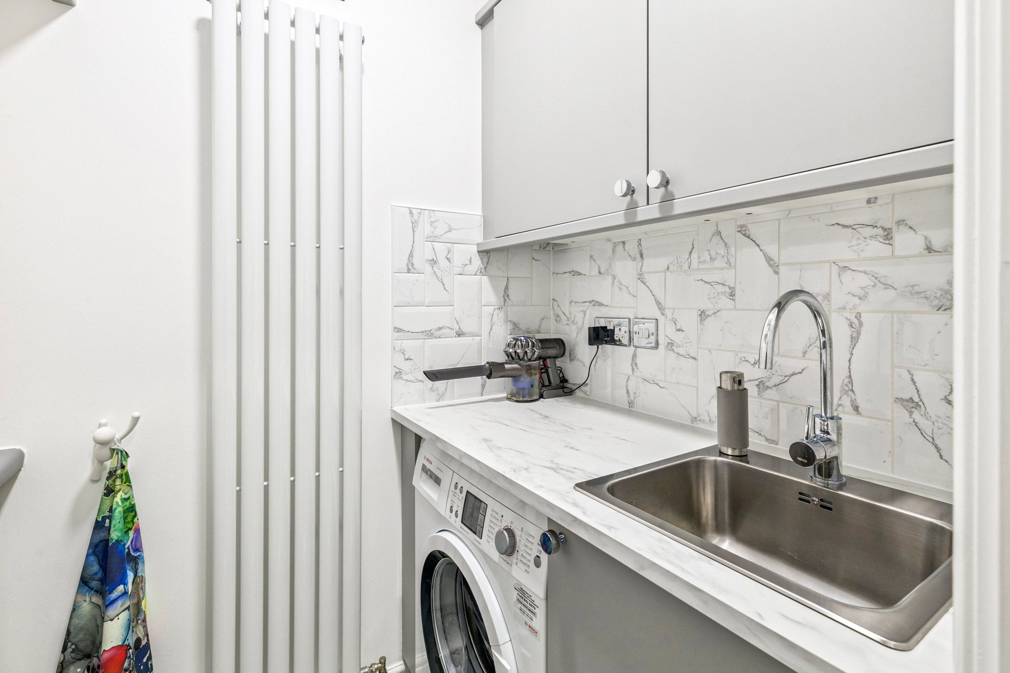 Utility room with Bosch washer dryer, sink and extra storage cupboards.