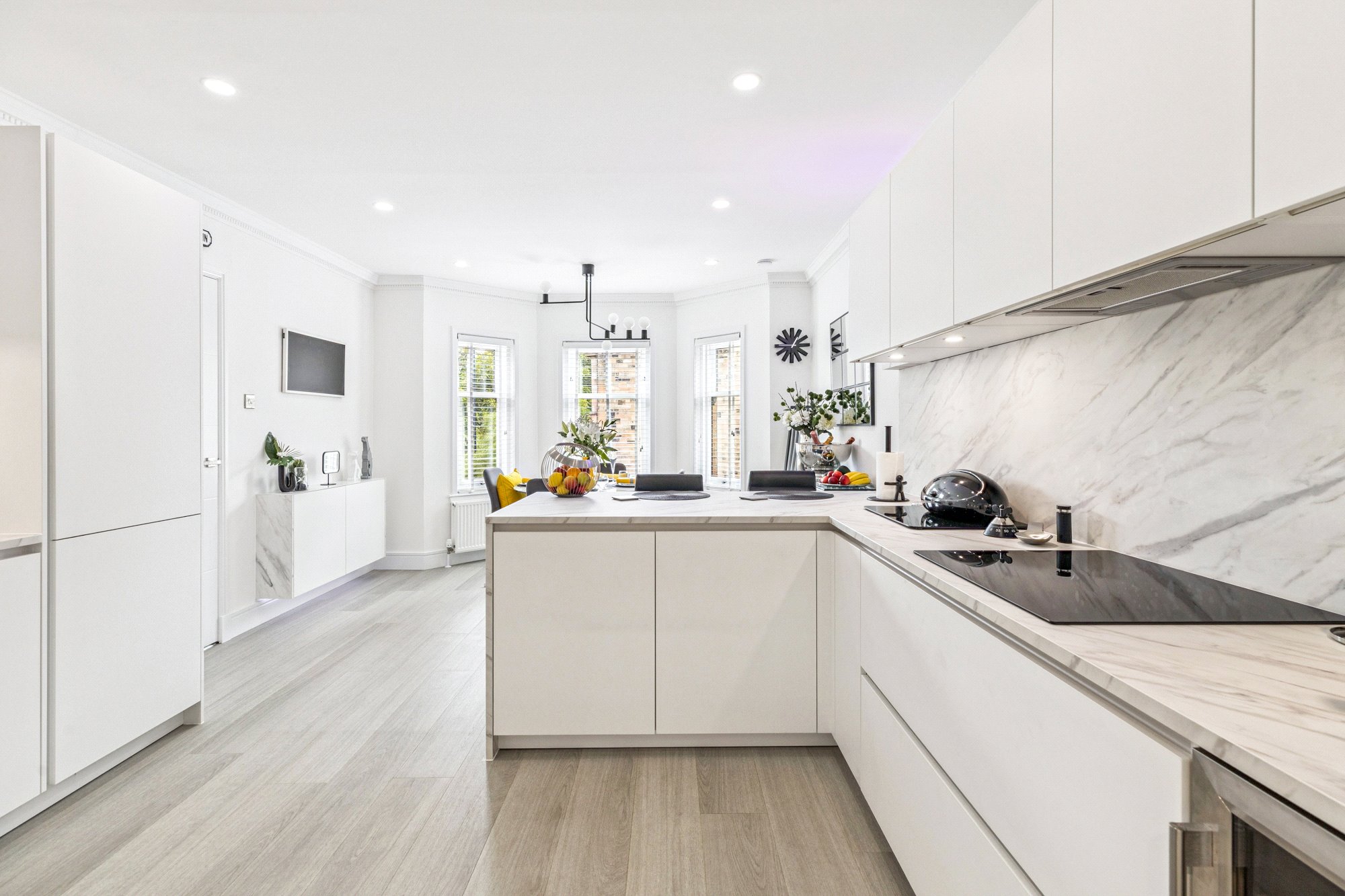 Dining kitchen: with bay window, newly fitted Hacker German kitchen with seating for 2, full complement of integrated appliances including larder fridge & freezer,