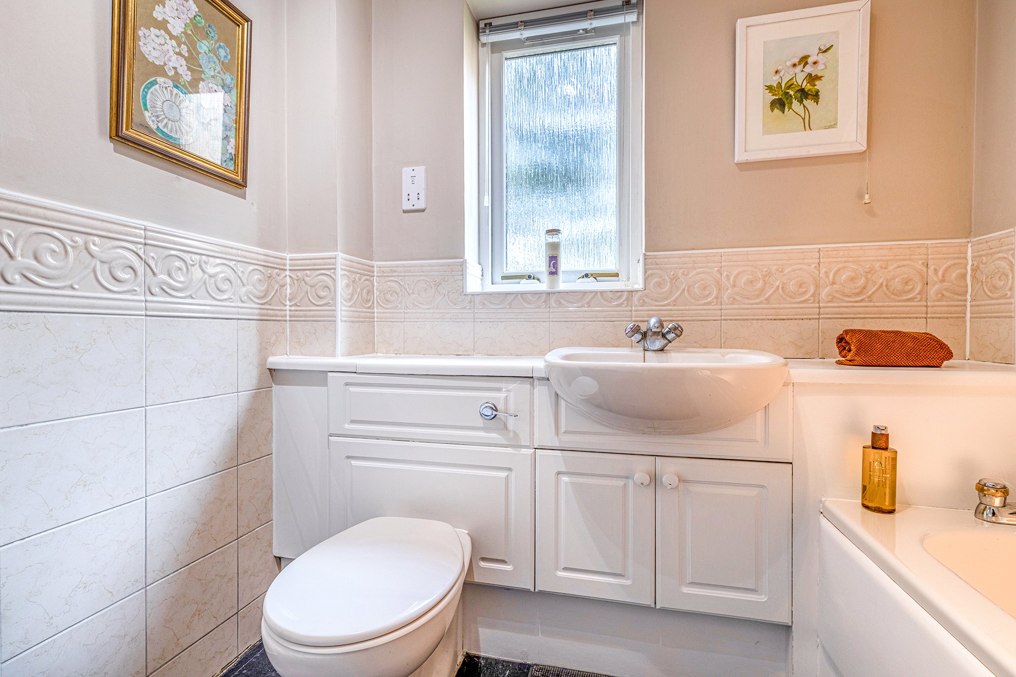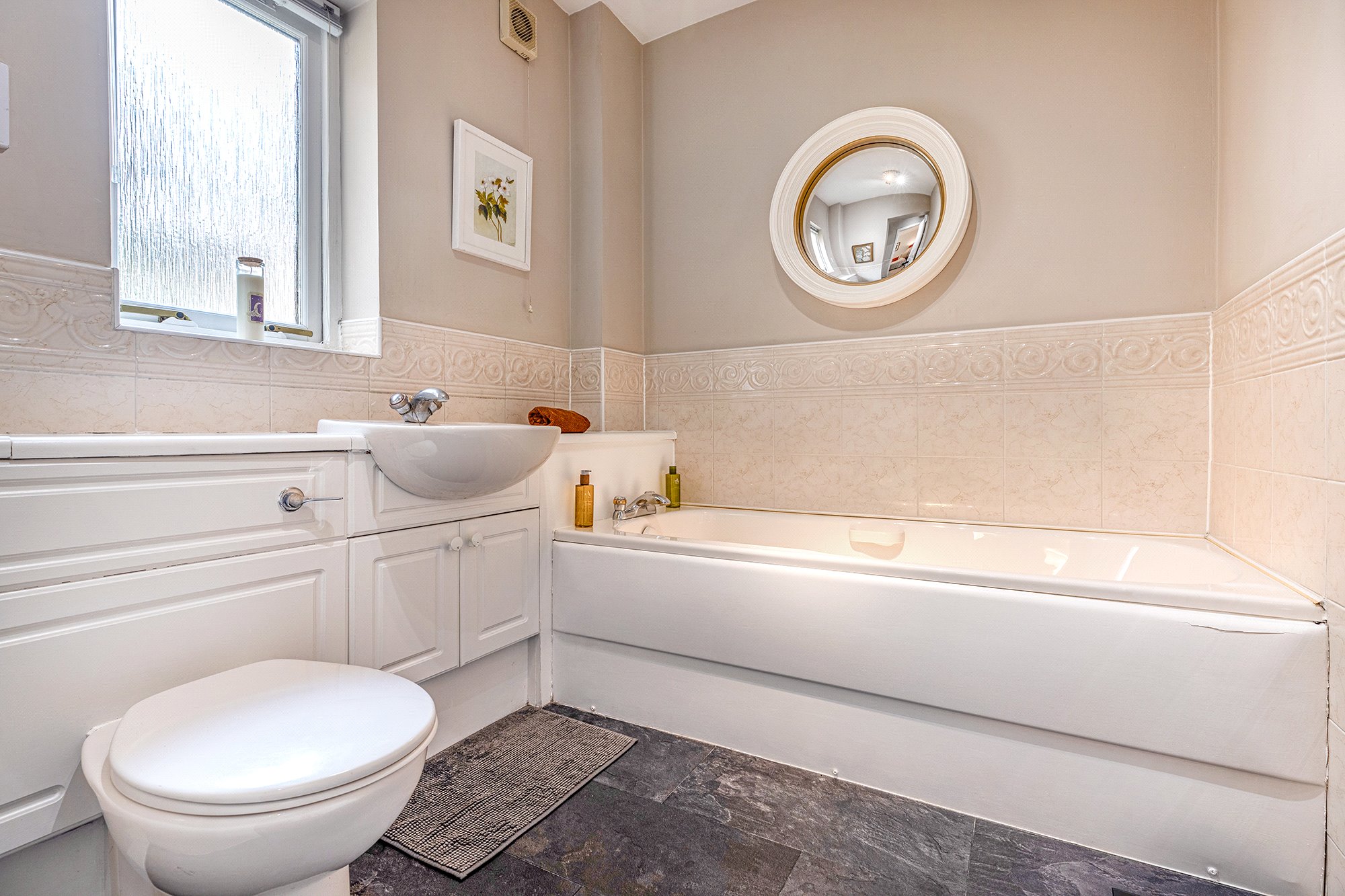 - Four-piece en suite bathroom comprising bath, separate shower cubicle, toilet and wash hand basin. Window to the front