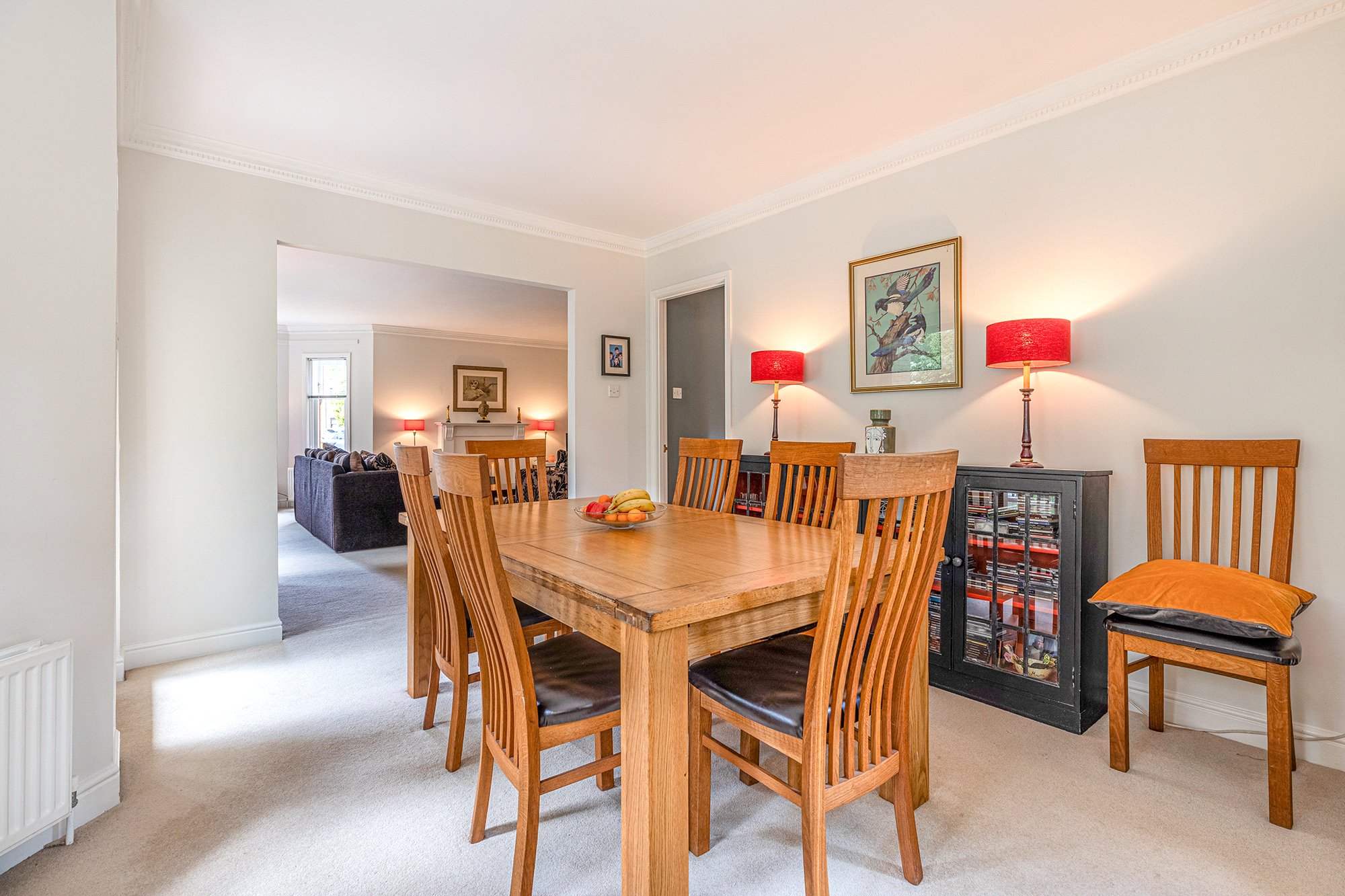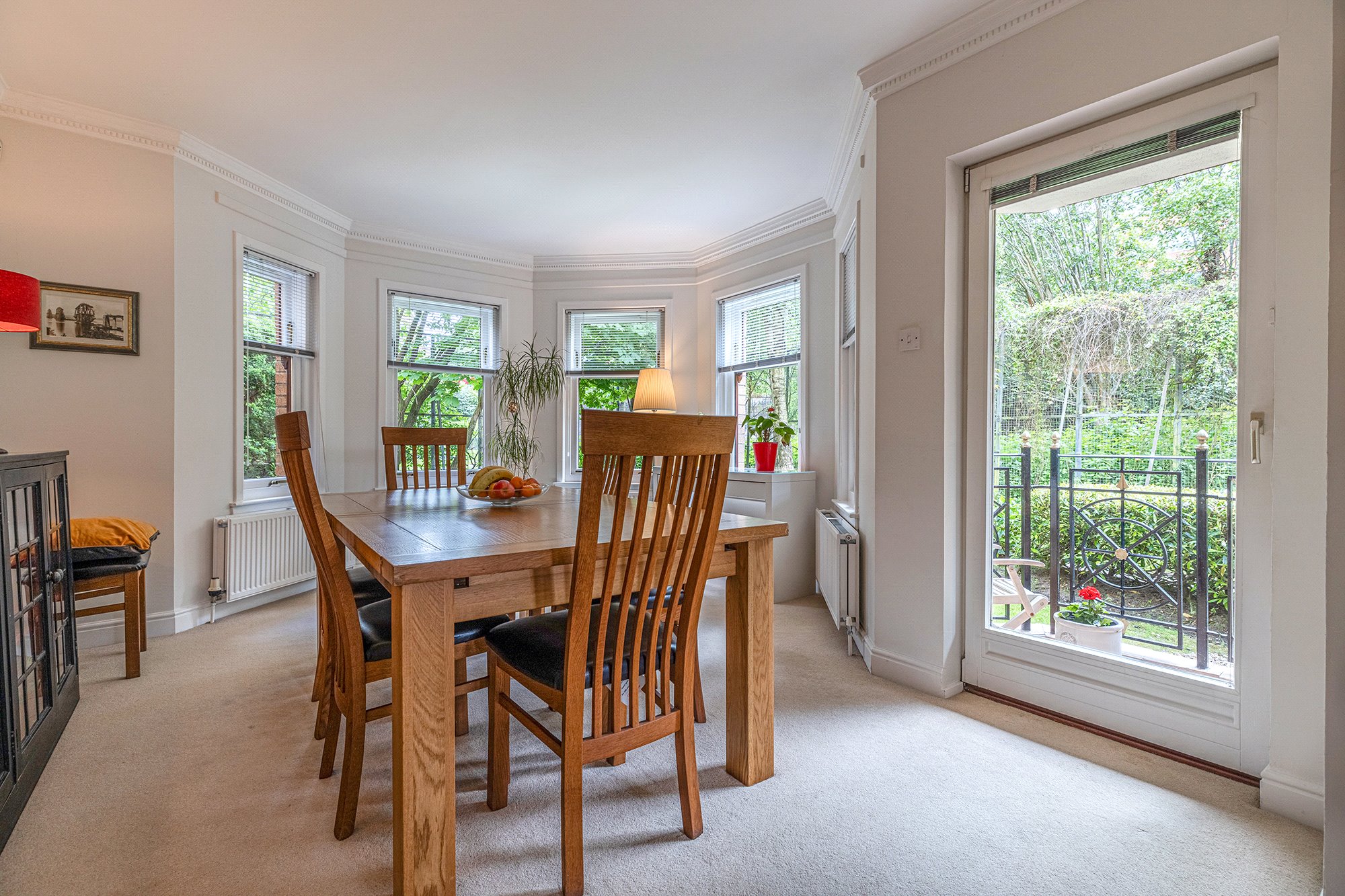 - Versatile and spacious dining room with five section bay window, ceiling cornice and double-glazed door to private balcony